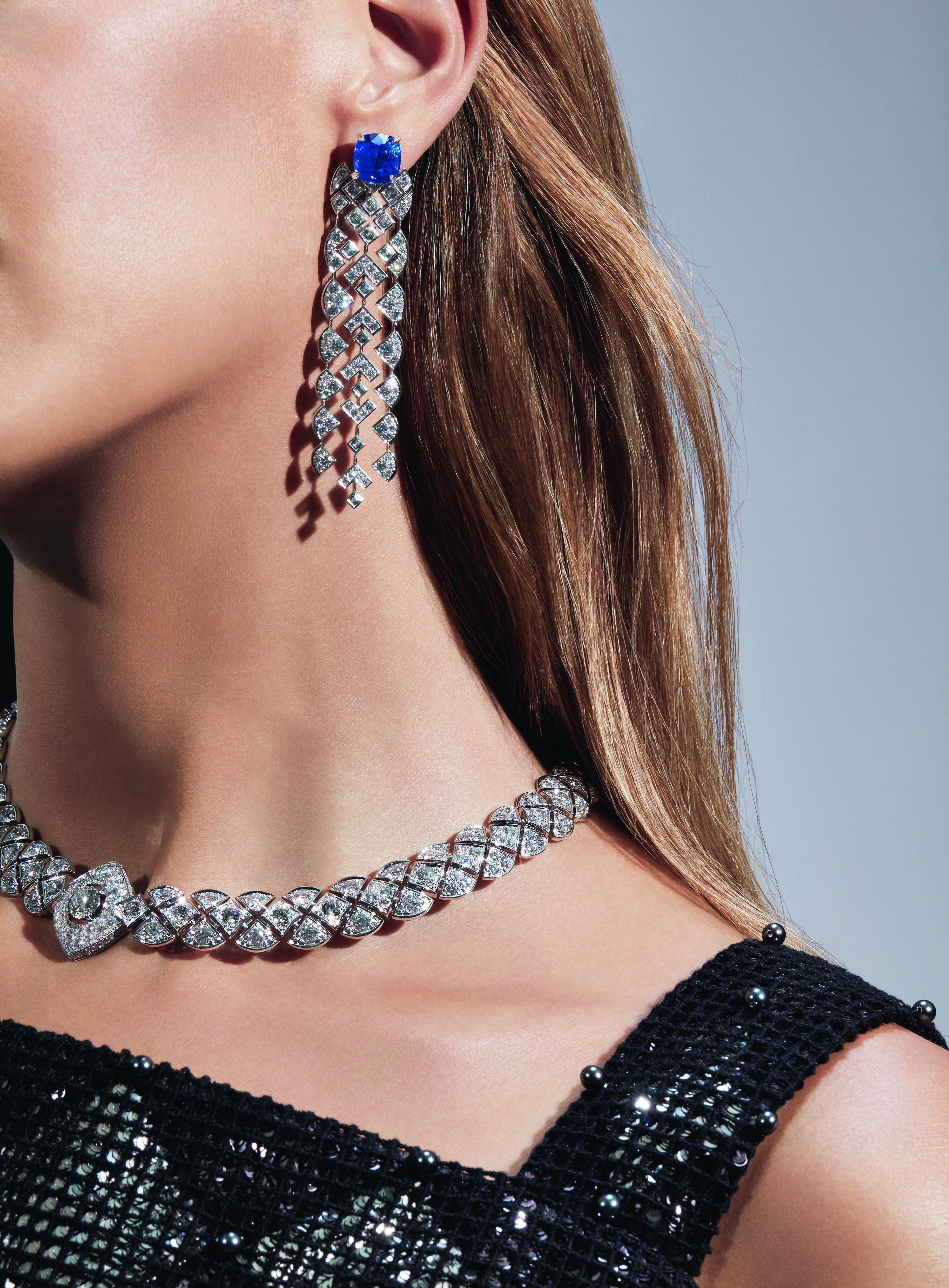 Collier « Signature Ultime » en or blanc 18K serti d’un diamant taille brillant de 1,5 carat et de 364 diamants taille brillant pour un poids total de 25,42 carats. Boucles d’oreilles « Signature de Saphir » en or blanc 18K serti de 2 saphirs taille coussin pour un poids total de 12,8 carats, 26 diamants taille carré pour un poids total de 2 carats, 158 diamants taille brillant pour un poids total de 4,5 carats et 2 diamants taille triangle.