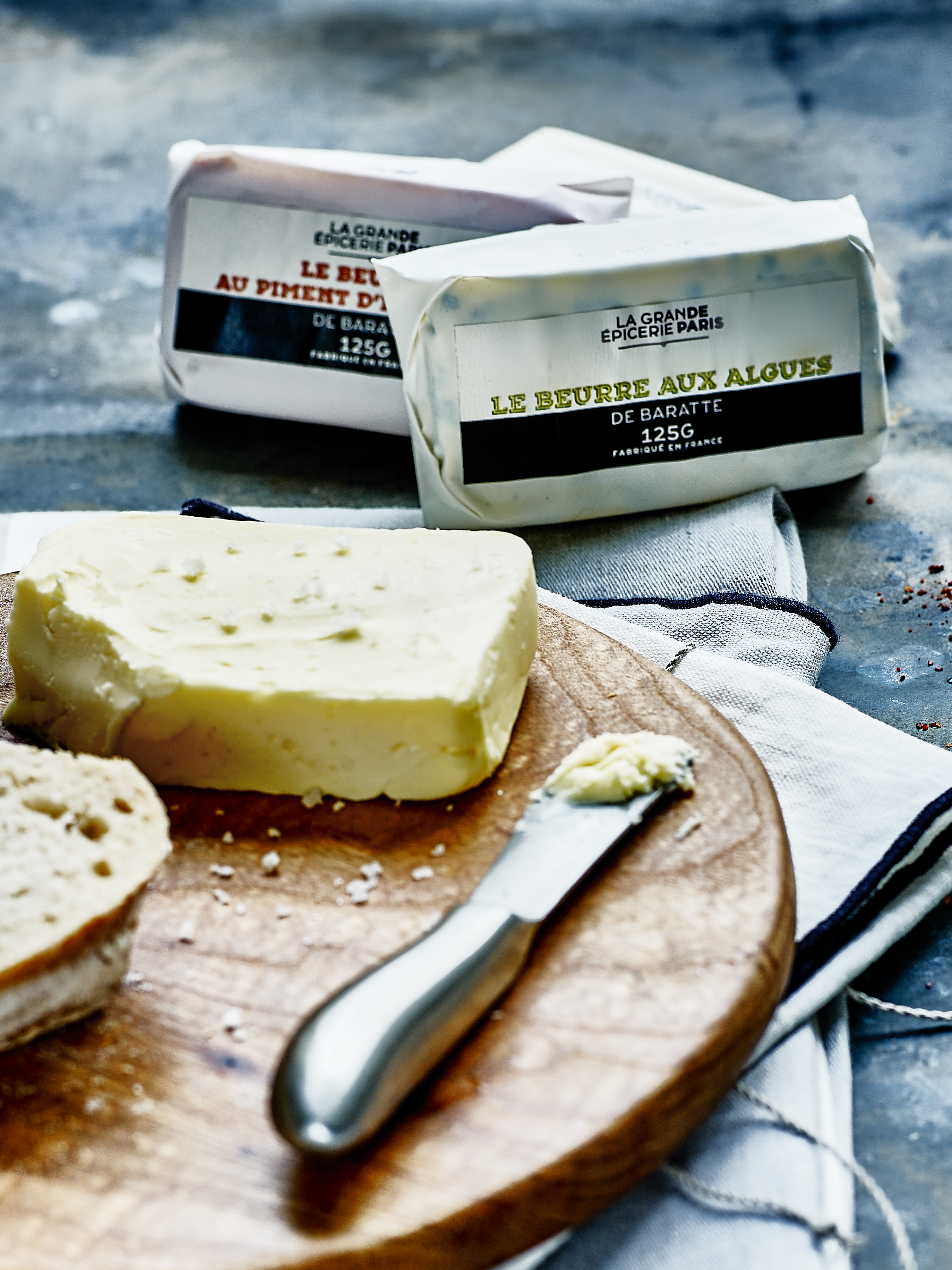 La Grande Epicerie de Paris propose un bel assortiment de beurres de baratte au lait cru de terroir. Riches en goût, ils s’agrémentent de paillettes de sel qui crissent sous la dent, d’un mélange d’algues ou de piment d’Espelette.