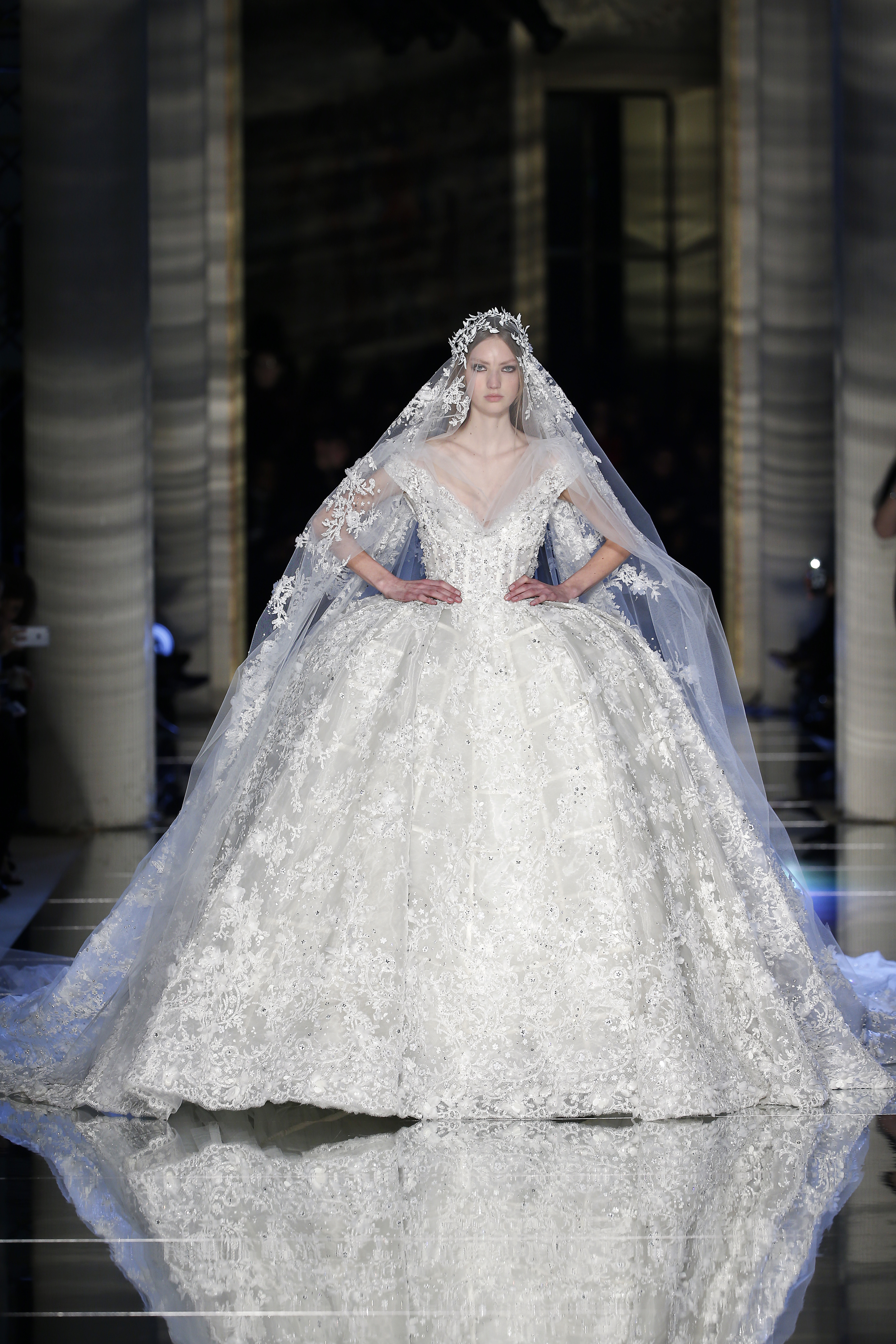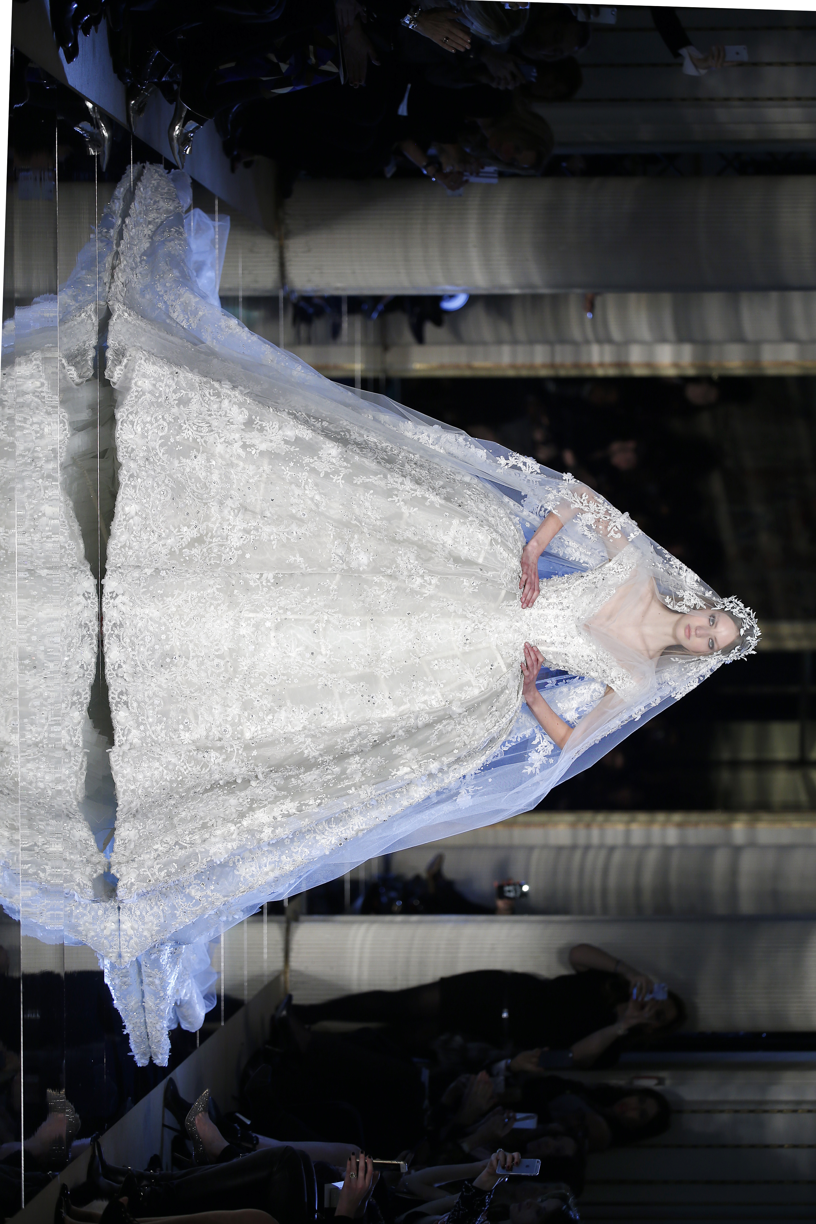 Arrive enfin la robe de mariée blanche à crinoline et sa majestueuse traîne, toute brodée en strass, nous laissant sans voix, la tête dans les étoiles.