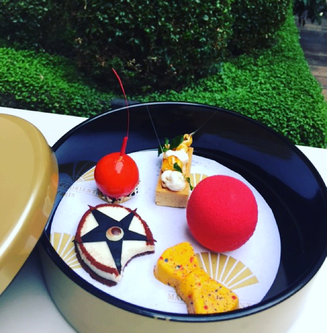 C’est au tour de Thierry Marx, à la tête des fourneaux du restaurant Camélia, pôle gastronomique du Mandarin Oriental Paris, de lui rendre hommage. Le tea time « Bento Circus » est composé de 6 pièces sucrées et 3 pièces salées. Proposé au tarif de 38 euros, il est notamment composé d’une bavaroise vanille et compotée mure/cassis en forme de nez de clown, un nœud papillon en chocolat blanc, une tartelette mais et magret fumé popcorn caramélisé ou encore un bonbon foie gras à la barbe à papa.