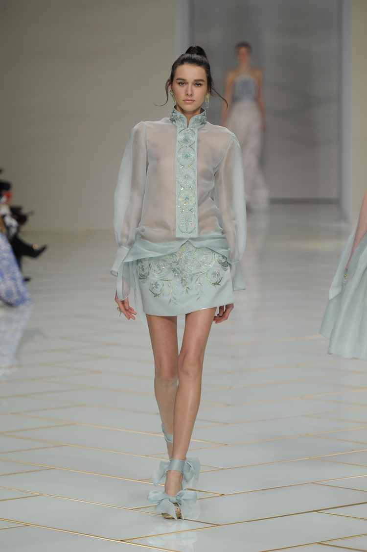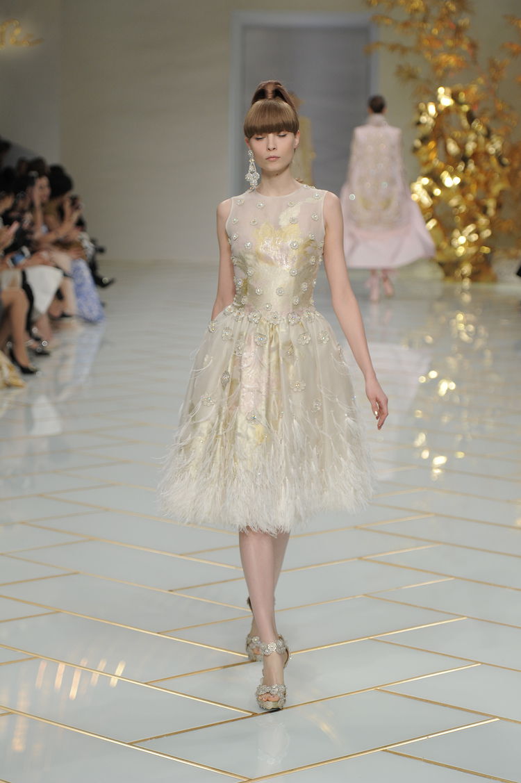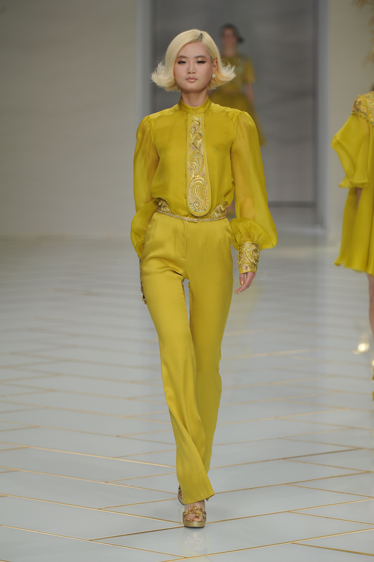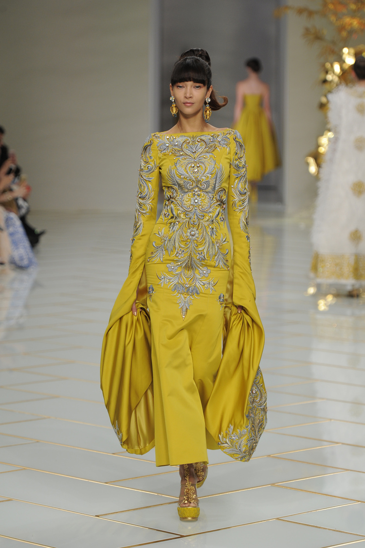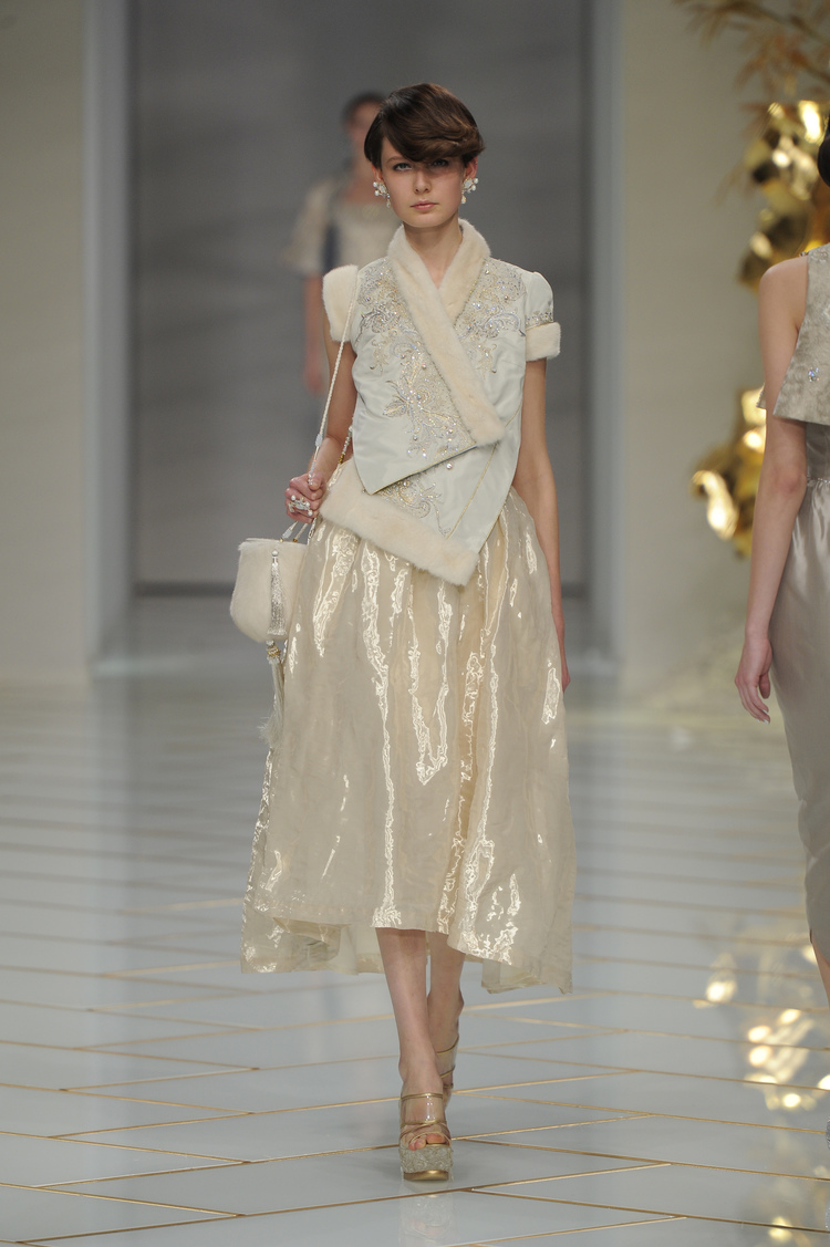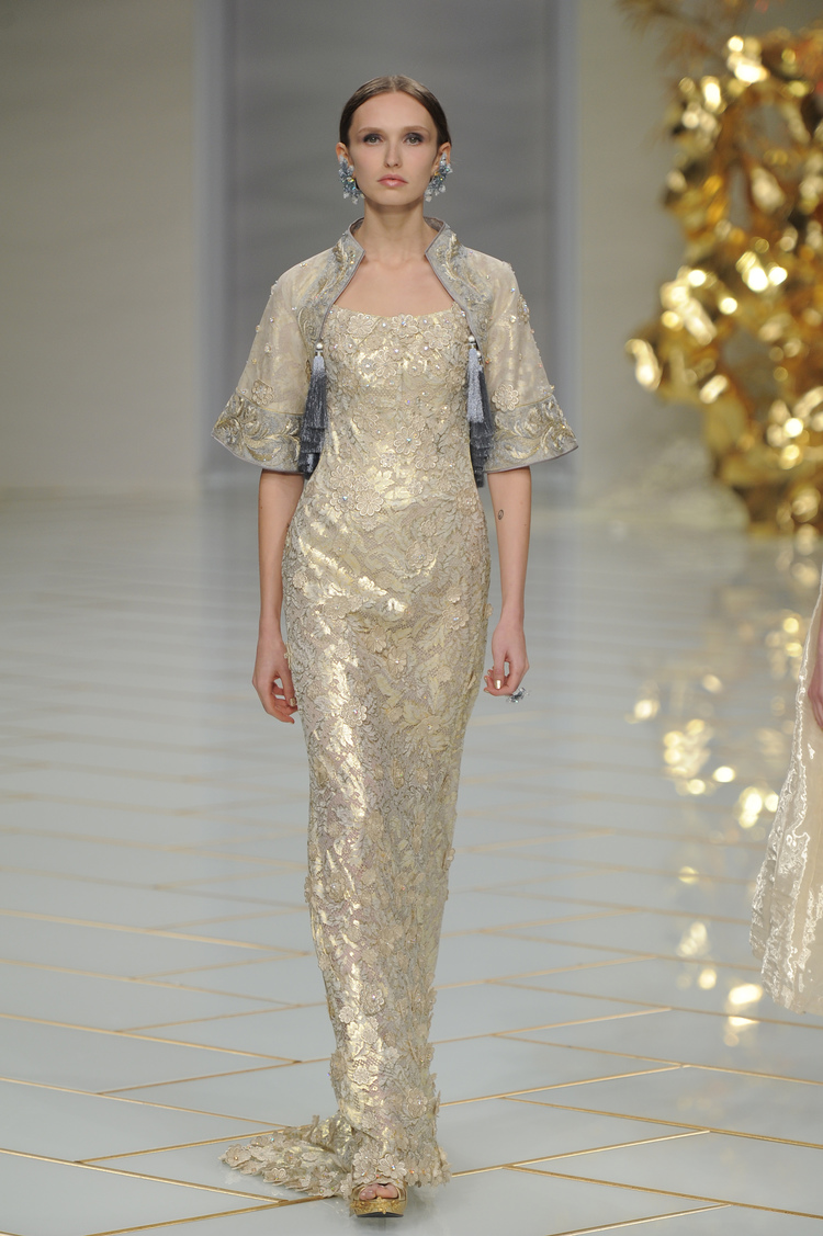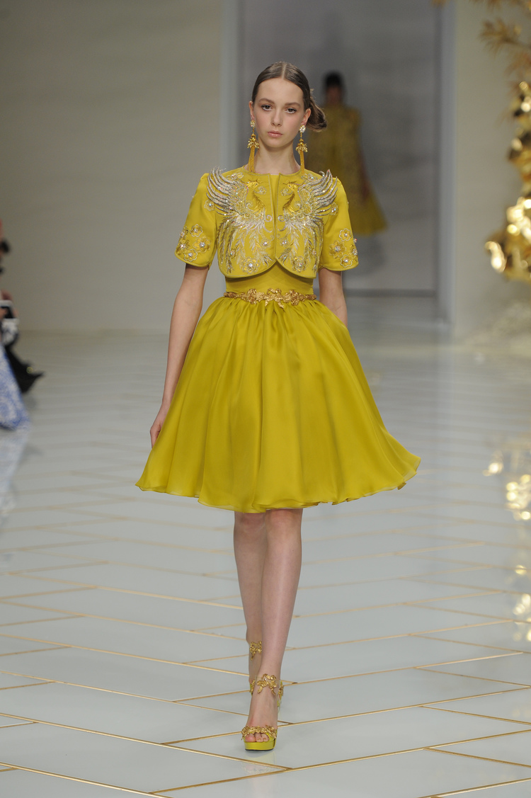 Dans un décor digne d’un jardin zen et d’un palais chinois, avec des lumières rouge et jaune or rappelant les couleurs traditionnelles de la Chine, avec des dalles de marbre blanches posées au sol évoquant la pureté. La collection est inspirée de la culture française et de la culture chinoise, ce « mariage » transcende la beauté et l’élégance de la femme qui évolue dans ce décor telle une impératrice. La culture chinoise est tout de même l’inspiration principale de la collection avec l’insertion par des broderies du symbole du phénix, symbole très important dans la culture chinoise car il incarne les 5 vertus de la bienveillance, il est annonciateur de paix et de prospérité pour le peuple et le pays.
