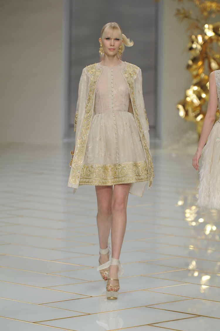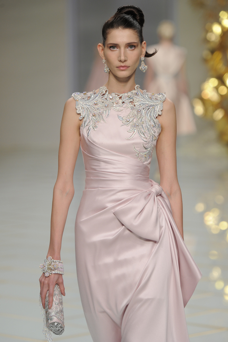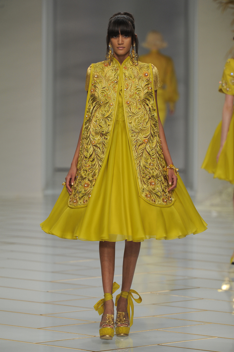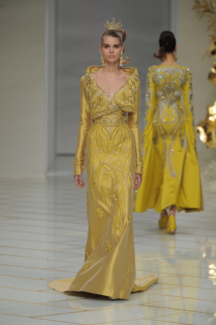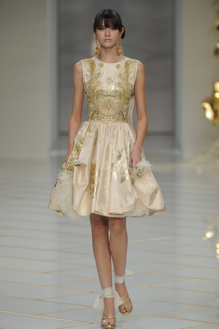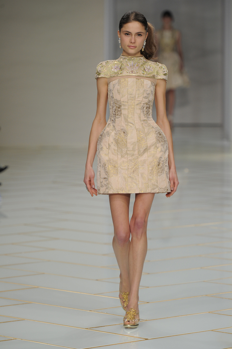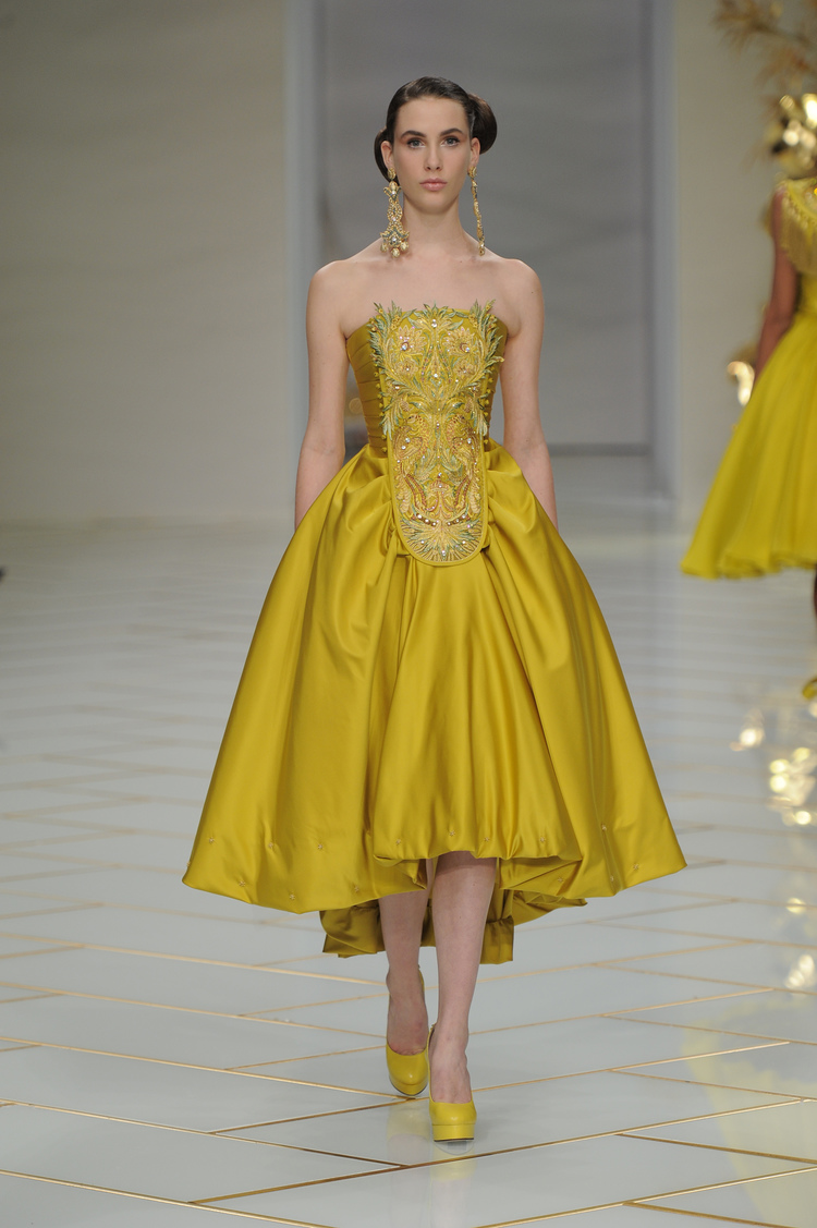 Dans un décor digne d’un jardin zen et d’un palais chinois, avec des lumières rouge et jaune or rappelant les couleurs traditionnelles de la Chine, avec des dalles de marbre blanches posées au sol évoquant la pureté. La collection est inspirée de la culture française et de la culture chinoise, ce « mariage » transcende la beauté et l’élégance de la femme qui évolue dans ce décor telle une impératrice. La culture chinoise est tout de même l’inspiration principale de la collection avec l’insertion par des broderies du symbole du phénix, symbole très important dans la culture chinoise car il incarne les 5 vertus de la bienveillance, il est annonciateur de paix et de prospérité pour le peuple et le pays.