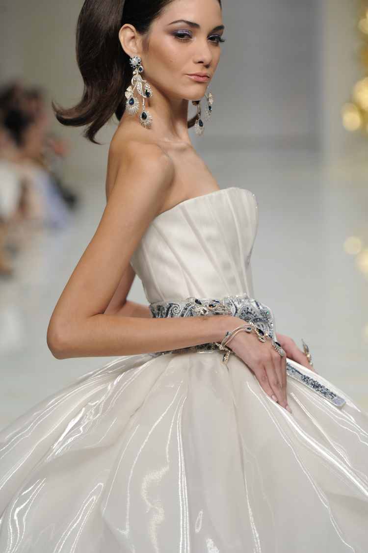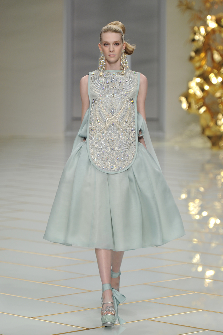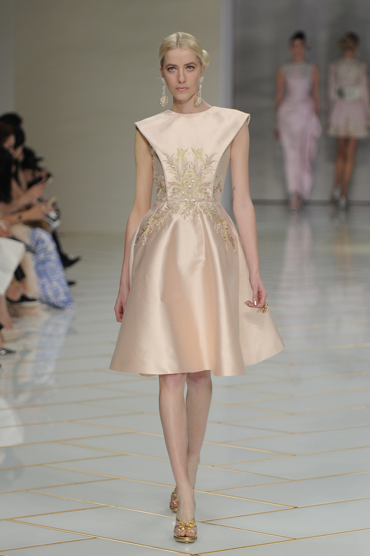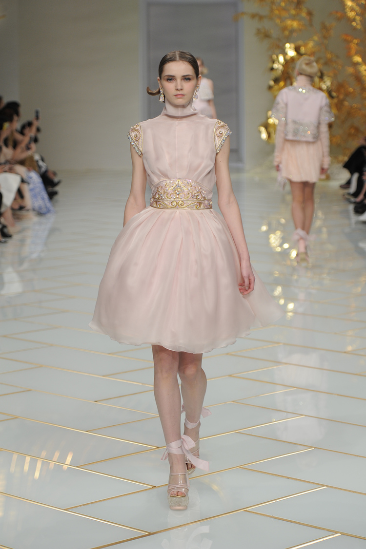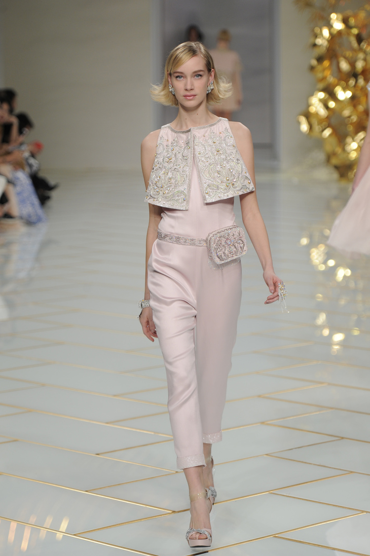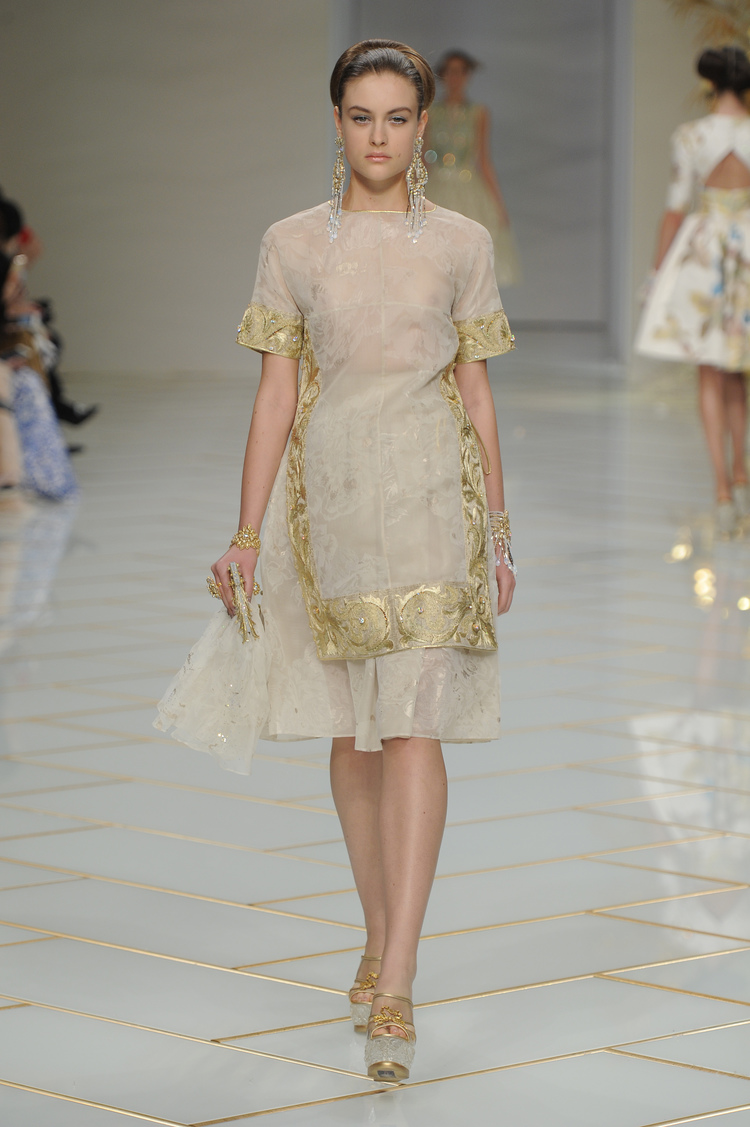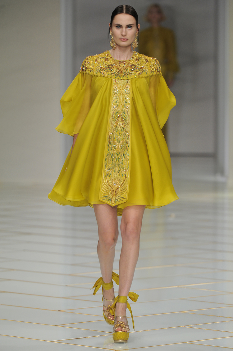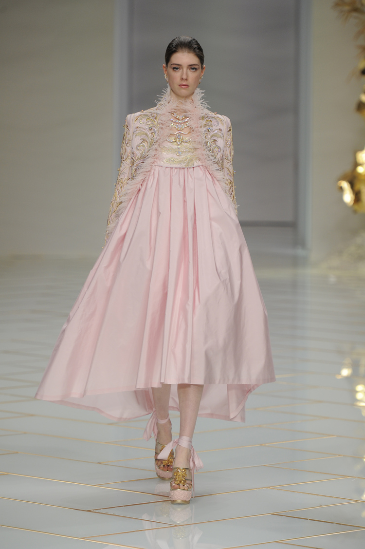 Dans un décor digne d’un jardin zen et d’un palais chinois, avec des lumières rouge et jaune or rappelant les couleurs traditionnelles de la Chine, avec des dalles de marbre blanches posées au sol évoquant la pureté. La collection est inspirée de la culture française et de la culture chinoise, ce « mariage » transcende la beauté et l’élégance de la femme qui évolue dans ce décor telle une impératrice. La culture chinoise est tout de même l’inspiration principale de la collection avec l’insertion par des broderies du symbole du phénix, symbole très important dans la culture chinoise car il incarne les 5 vertus de la bienveillance, il est annonciateur de paix et de prospérité pour le peuple et le pays.