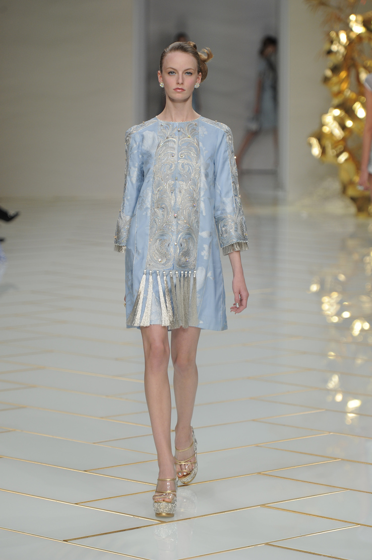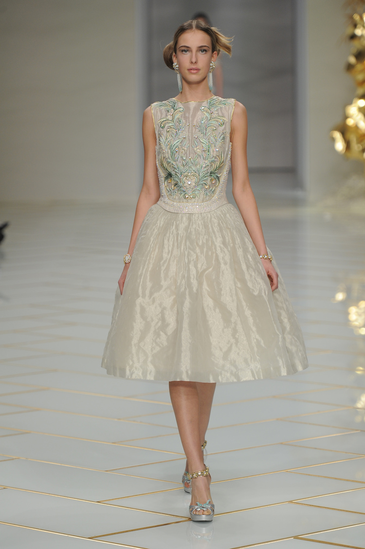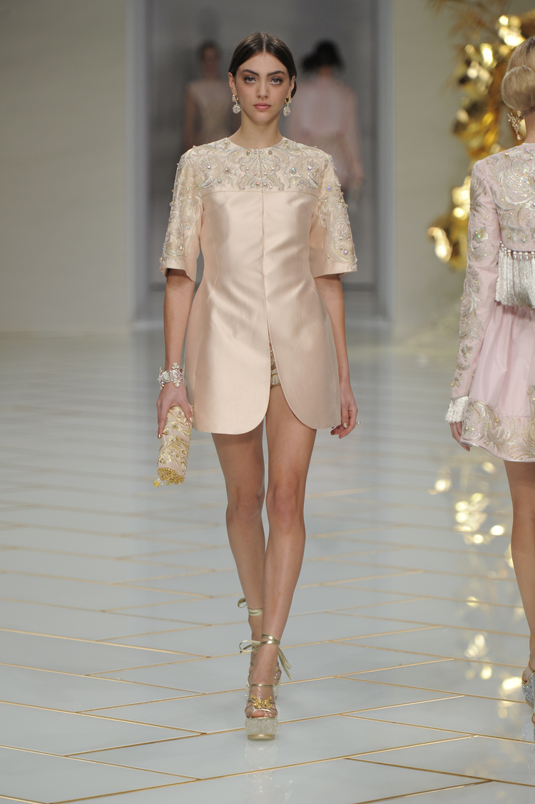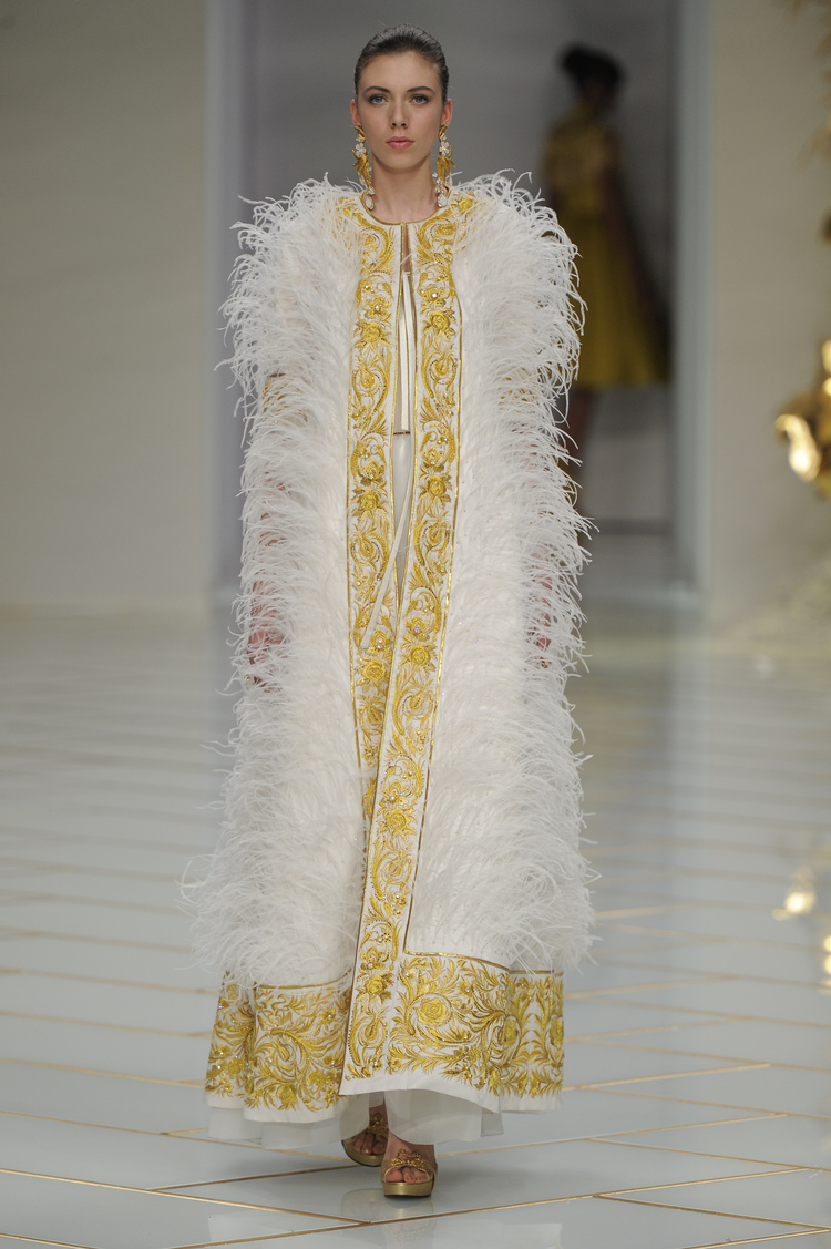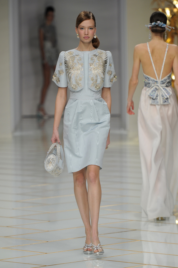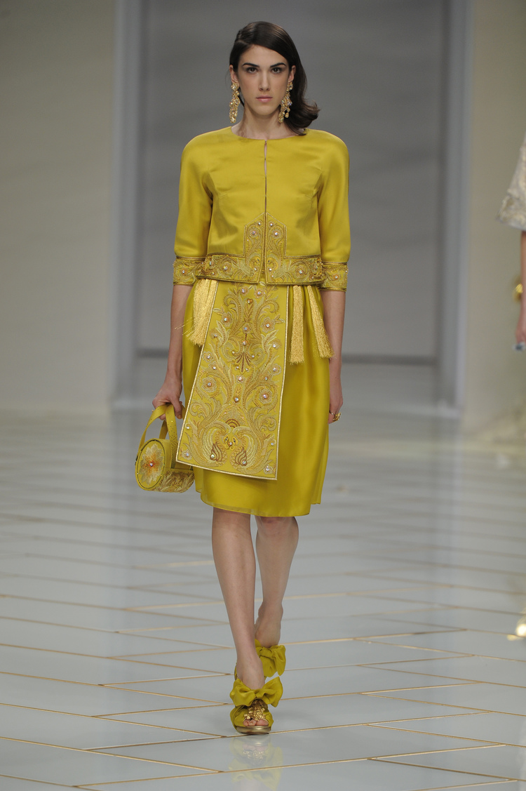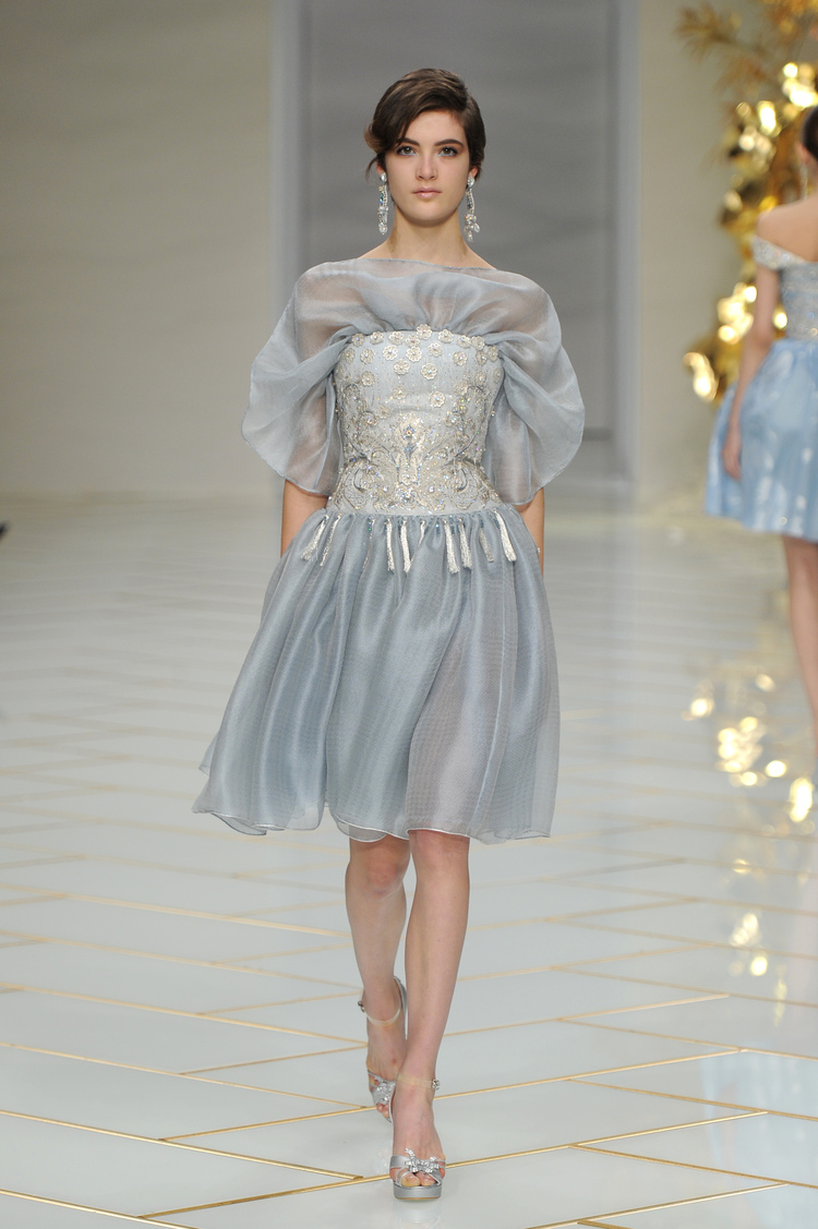 Dans un décor digne d’un jardin zen et d’un palais chinois, avec des lumières rouge et jaune or rappelant les couleurs traditionnelles de la Chine, avec des dalles de marbre blanches posées au sol évoquant la pureté. La collection est inspirée de la culture française et de la culture chinoise, ce « mariage » transcende la beauté et l’élégance de la femme qui évolue dans ce décor telle une impératrice. La culture chinoise est tout de même l’inspiration principale de la collection avec l’insertion par des broderies du symbole du phénix, symbole très important dans la culture chinoise car il incarne les 5 vertus de la bienveillance, il est annonciateur de paix et de prospérité pour le peuple et le pays.