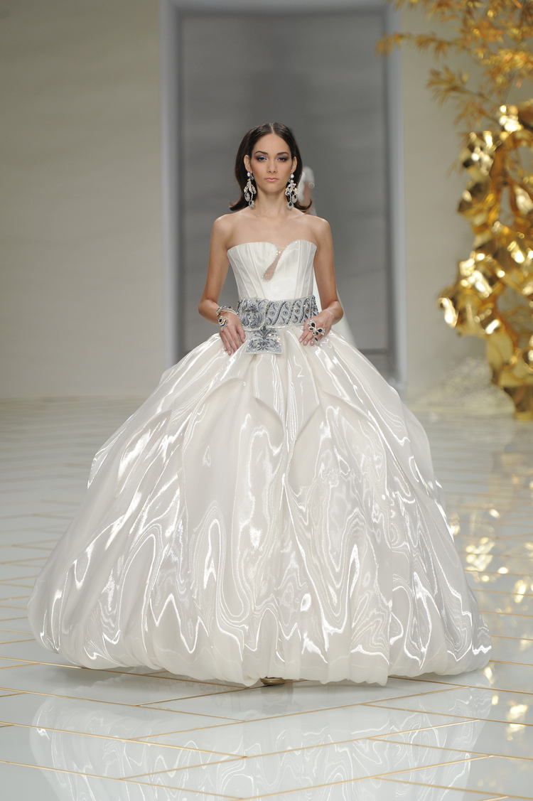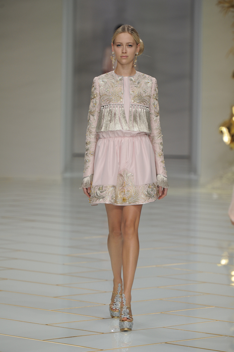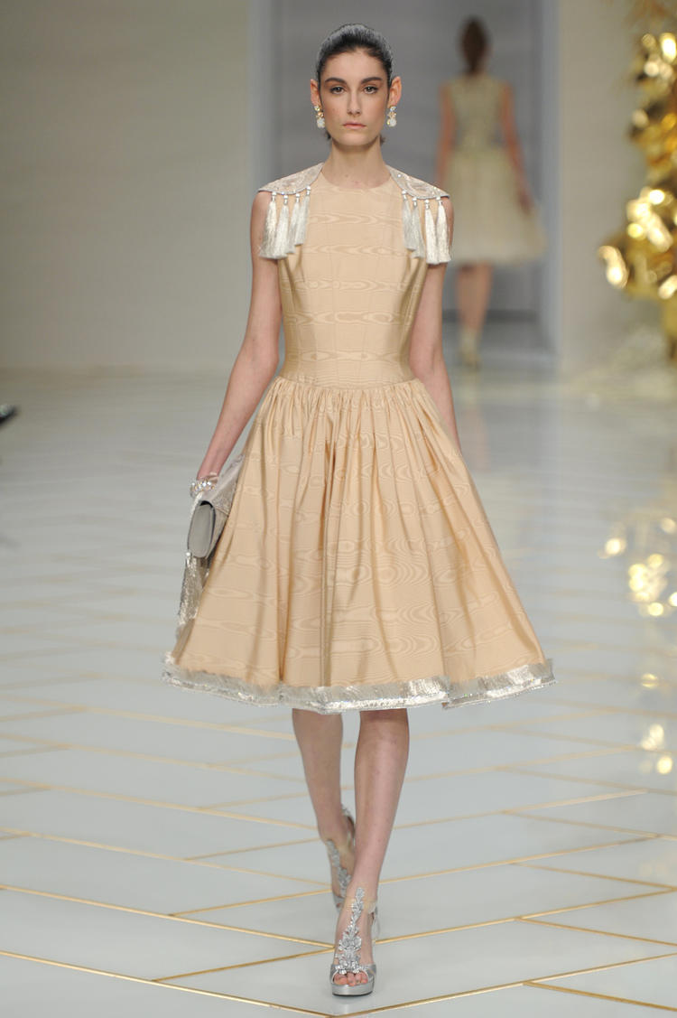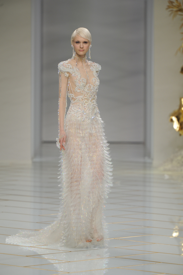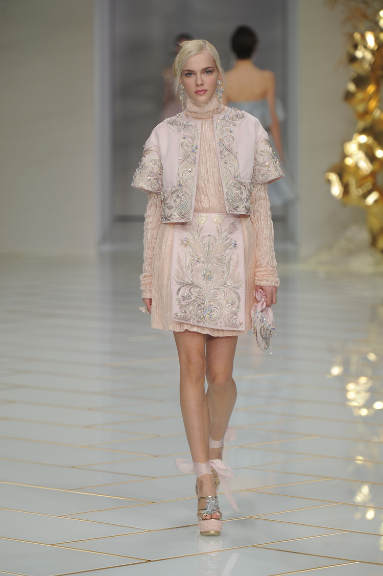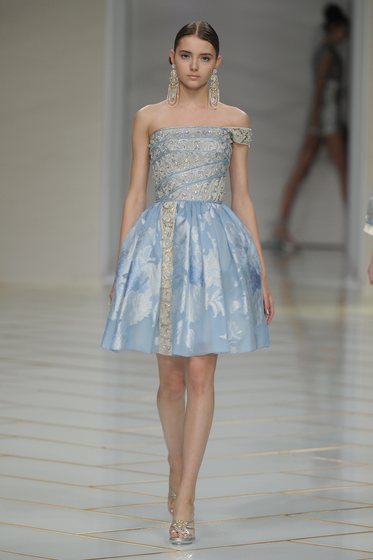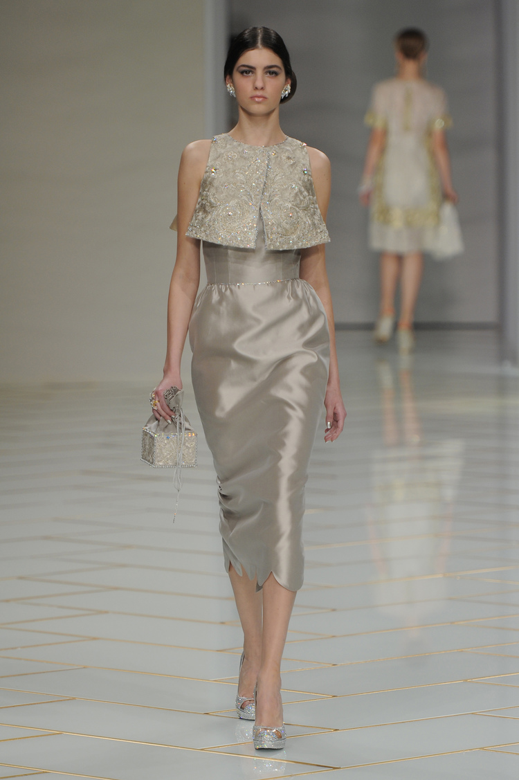 Dans un décor digne d’un jardin zen et d’un palais chinois, avec des lumières rouge et jaune or rappelant les couleurs traditionnelles de la Chine, avec des dalles de marbre blanches posées au sol évoquant la pureté. La collection est inspirée de la culture française et de la culture chinoise, ce « mariage » transcende la beauté et l’élégance de la femme qui évolue dans ce décor telle une impératrice. La culture chinoise est tout de même l’inspiration principale de la collection avec l’insertion par des broderies du symbole du phénix, symbole très important dans la culture chinoise car il incarne les 5 vertus de la bienveillance, il est annonciateur de paix et de prospérité pour le peuple et le pays.