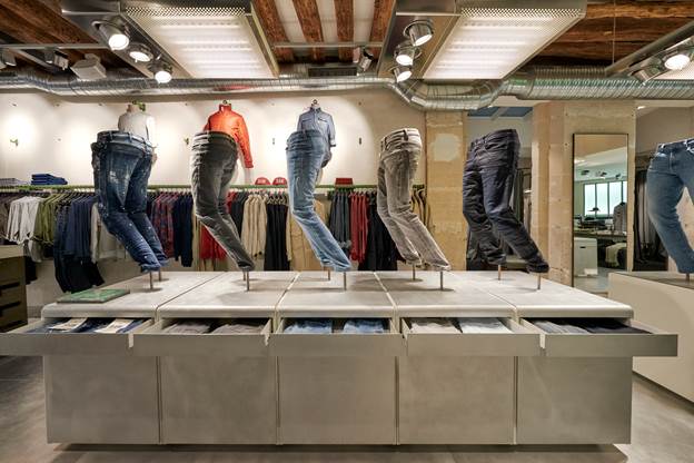 Avec un rez-de chaussée dédié à l’homme et un premier étage consacré aux collections femme, le jean est au cœur de l’ensemble de la boutique. En complément du traditionnel mur de denim, sur chaque niveau un espace central met en avant les jeans phares de la marque. Cette présentation scénographique du produit permet aux clients d’expérimenter à la fois les matières, le savoir-faire denim et d’appréhender d’un coup d’œil les nouvelles techniques innovantes et coupes. Le résultat: un concept magasin qui va à l’essentiel, un design qui aide le consommateur à trouver rapidement son jean.