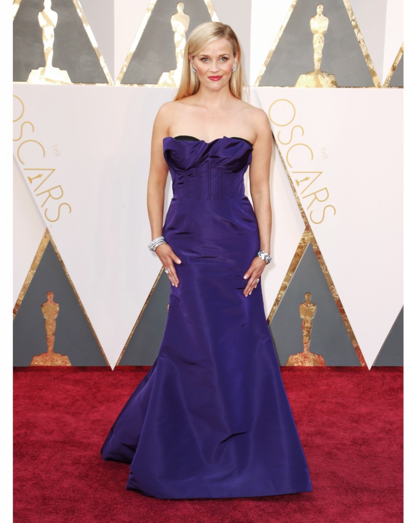 Reese WITHERSPOON porte des boucles d’oreilles et des bracelets et bagues Tiffany & Co en platine et diamants.