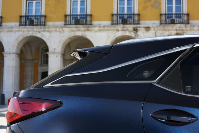 Le motif frontal du double trapèze se retrouve à l’arrière, donnant ainsi à l’ensemble du RX un équilibre et une cohérence esthétiques. Détail inédit chez Lexus, les combinés arrière à DEL en forme de L avec clignotants séquentiels enveloppent le hayon et se prolongent vers les ailes. Tout en accentuant la stature large et bien campée, ils améliorent la visibilité de l’arrière du véhicule. On notera au passage un autre élément stylistique inédit chez Lexus : le montant arrière coupé par une partie noire qui donne l’impression d’un toit flottant.