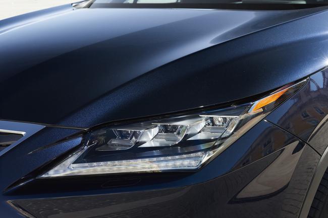 La face avant adopte une version magnifiée de la calandre Lexus en double trapèze, soulignée par une bordure chromée et encadrée de triples projecteurs à diodes électroluminescentes (DEL) en forme de L. L’ensemble se complète de nouveaux antibrouillards et clignotants à diodes qui confèrent au RX une dimension élégante et futuriste.