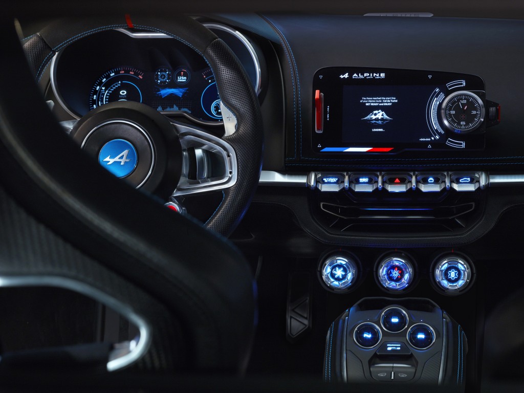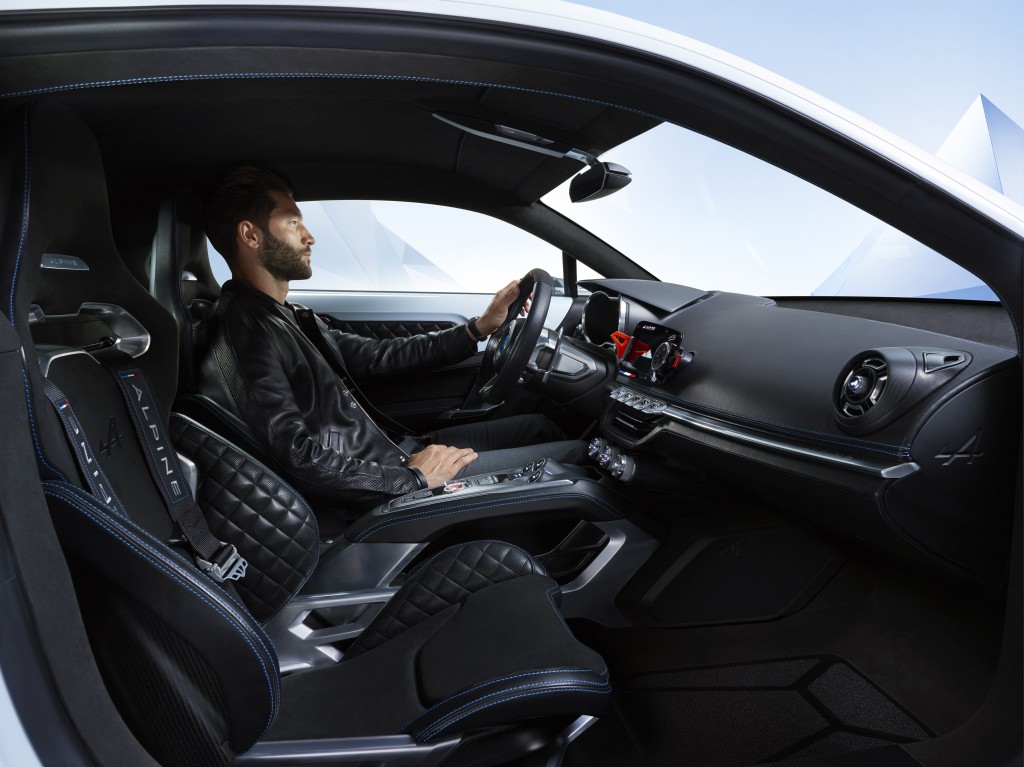 En faisant appel au cuir, aux microfibres, à l’aluminium et au carbone, l’habitacle joue la carte d’une atmosphère contemporaine. Les éléments high-tech marient les pièces évoquant la compétition et celles se référant à l’héritage Alpine. Ainsi, la commande d’ouverture de portière rétroéclairée contraste avec le garnissage de cuir noir damassé, souligné de surpiqûres blanches, habillant les contreportes. Les sièges aussi interprètent ce jeu d’oppositions créateur de tensions. De style baquet, ils intègrent un harnais à boucle de fermeture en aluminium brossé inspiré de la compétition. Le cuir matelassé les habillant s’associe à un tissu micro bre sensuel et technique à la fois.