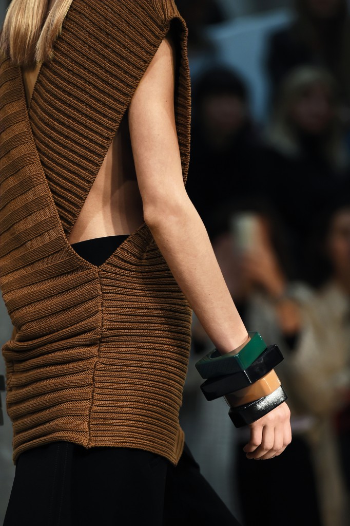 Les grands bracelets angulaires en résine se portent en accumulation sur le poignet, à la manière d’une construction moderniste et épurée.