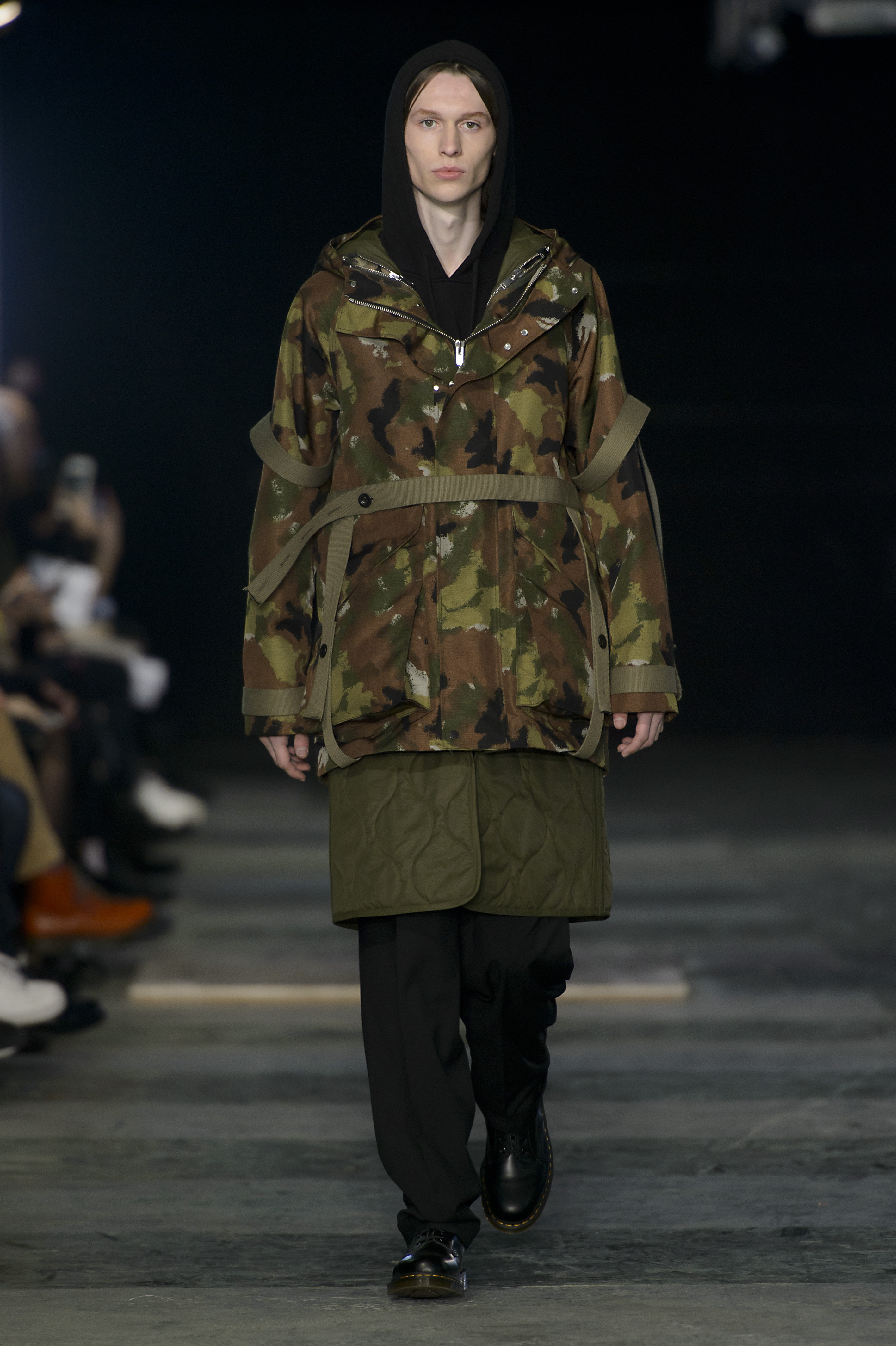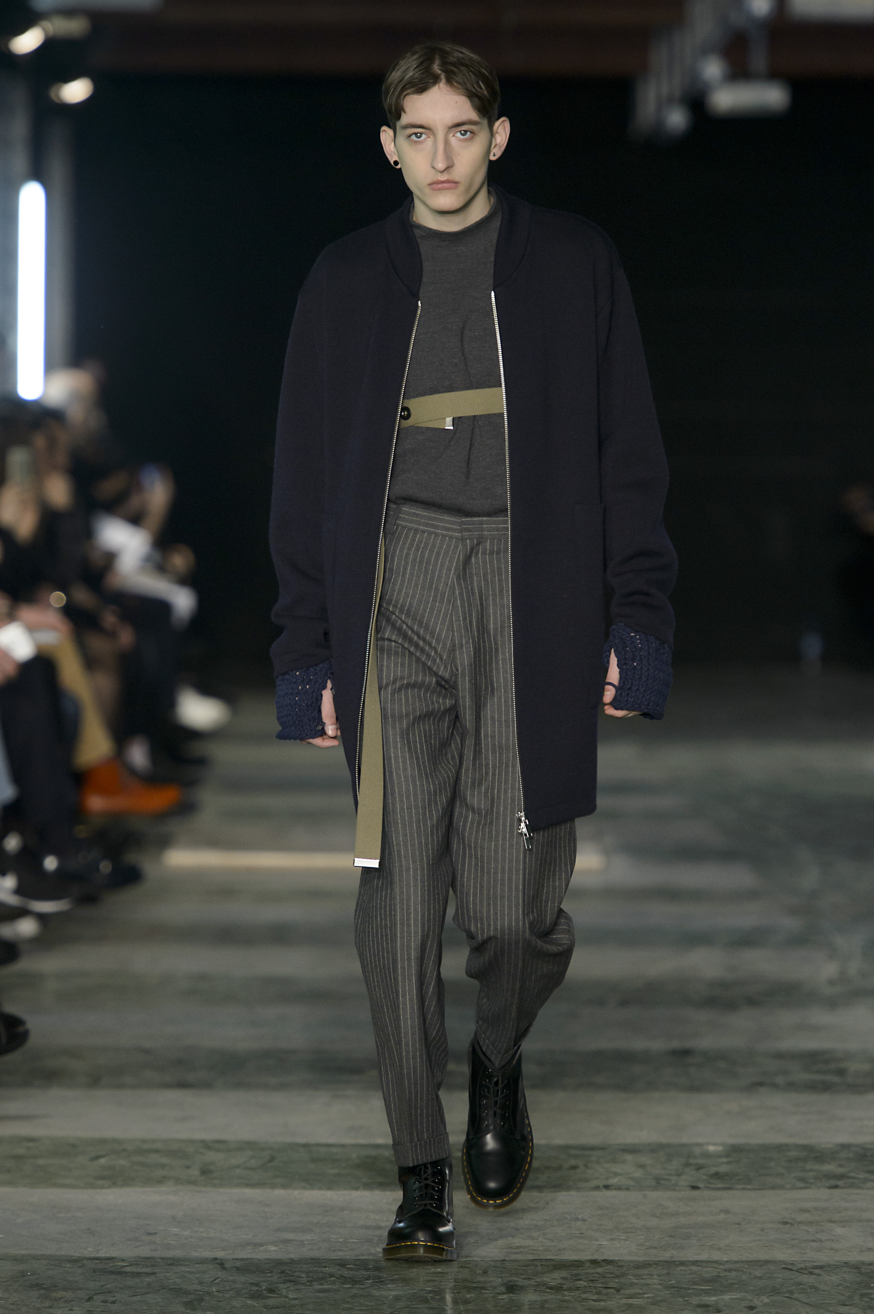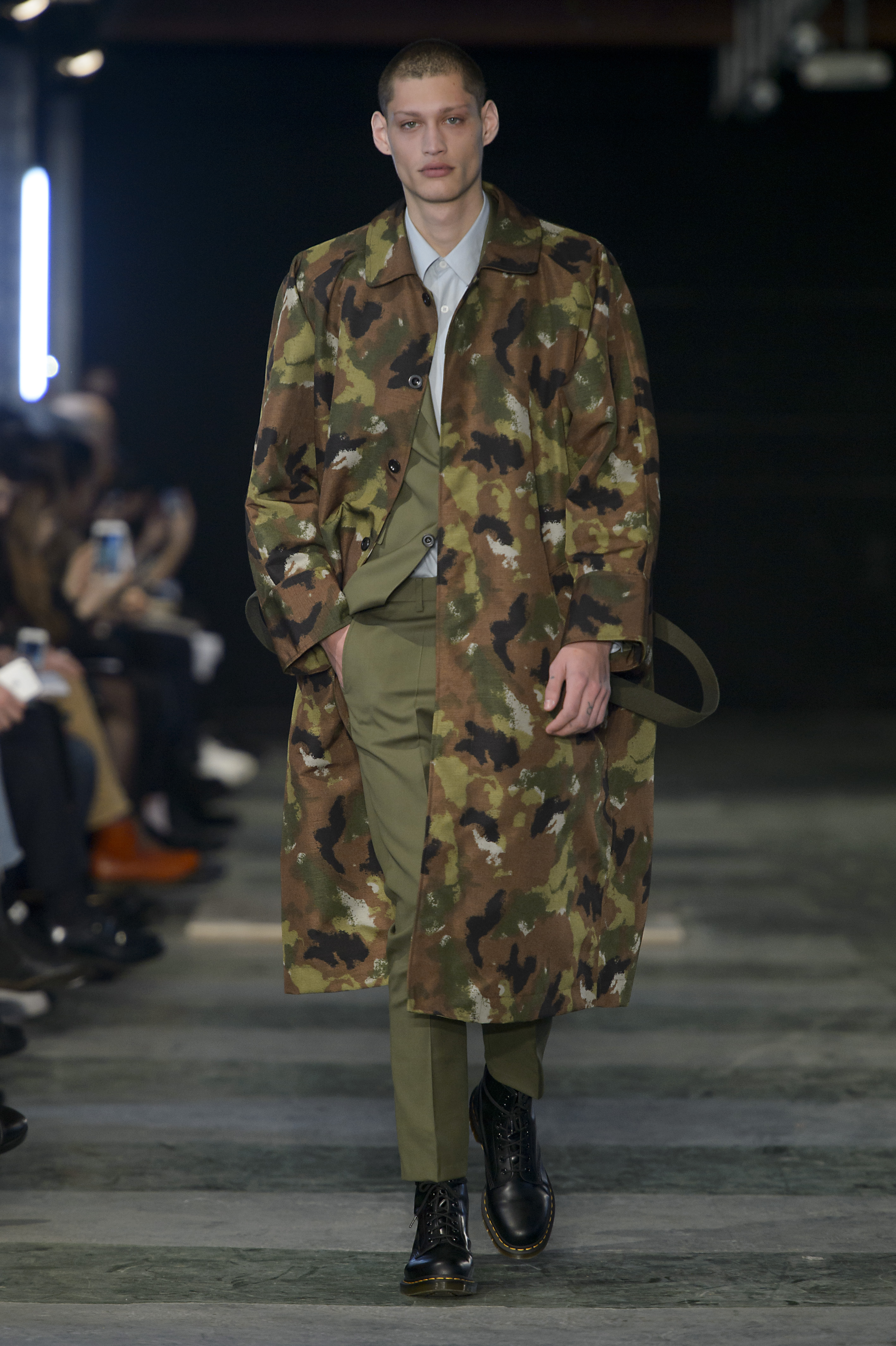 On mélange donc les inspirations tribales de ces cultures avec des lignes plus pures proche du costume. La palette des couleurs plonge dans le militaire : khaki, bleu marine et olive, avec une touche d’orange. Les silhouettes sont graphiques, carrés. Des capuches, des bombers, des manteaux amples. Des matières denses, de la laine, du jacquard chevron, du jersey imprimé.