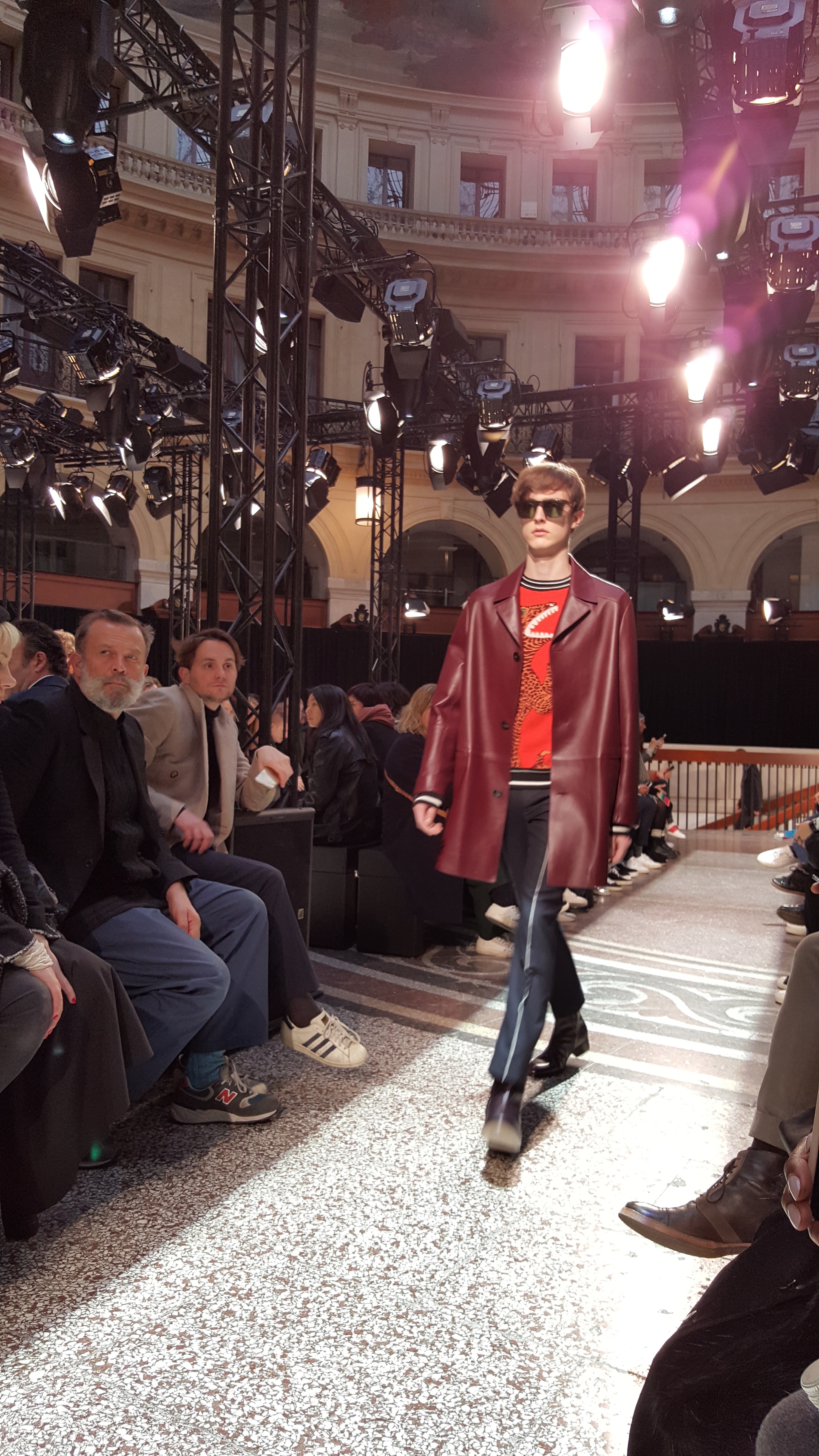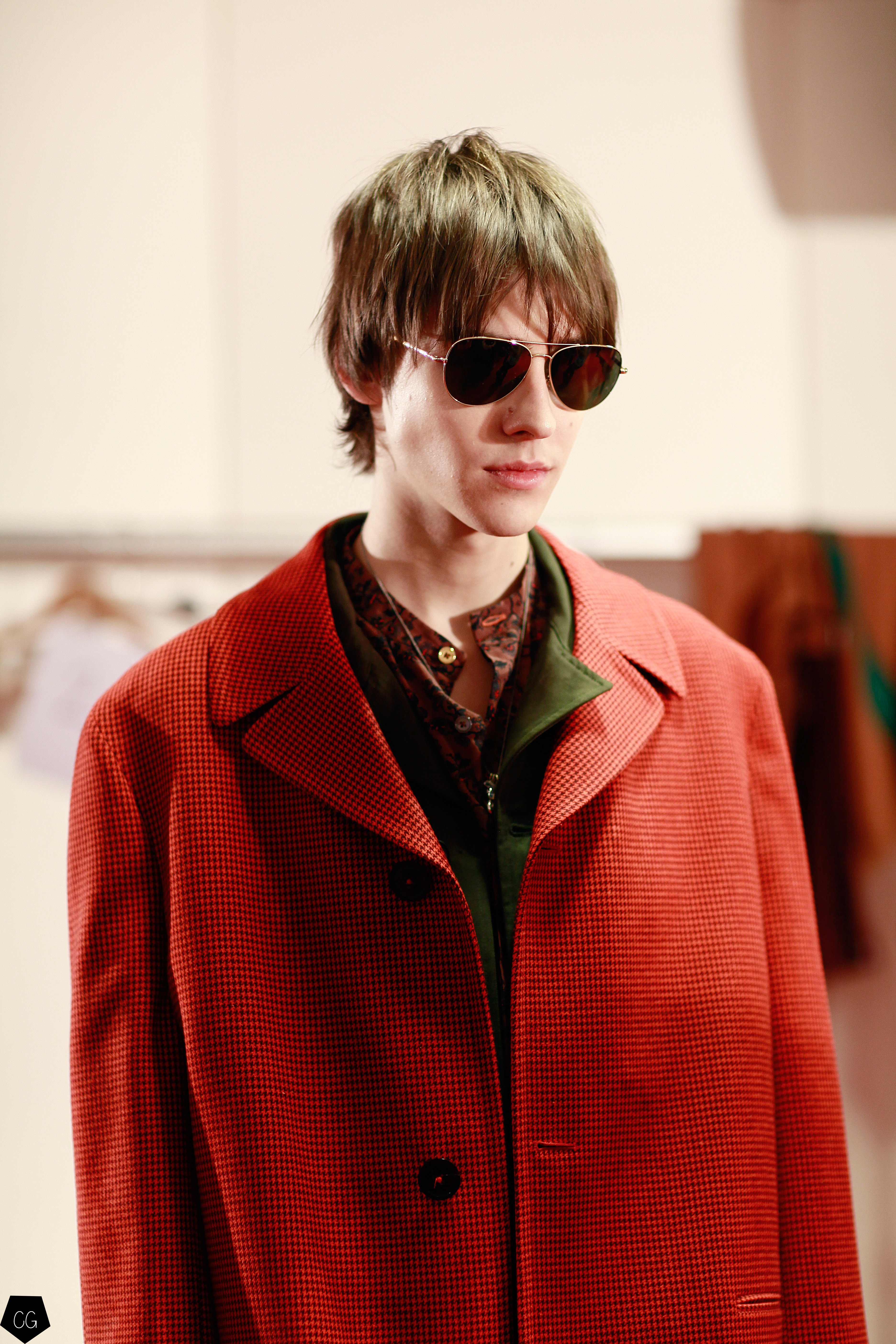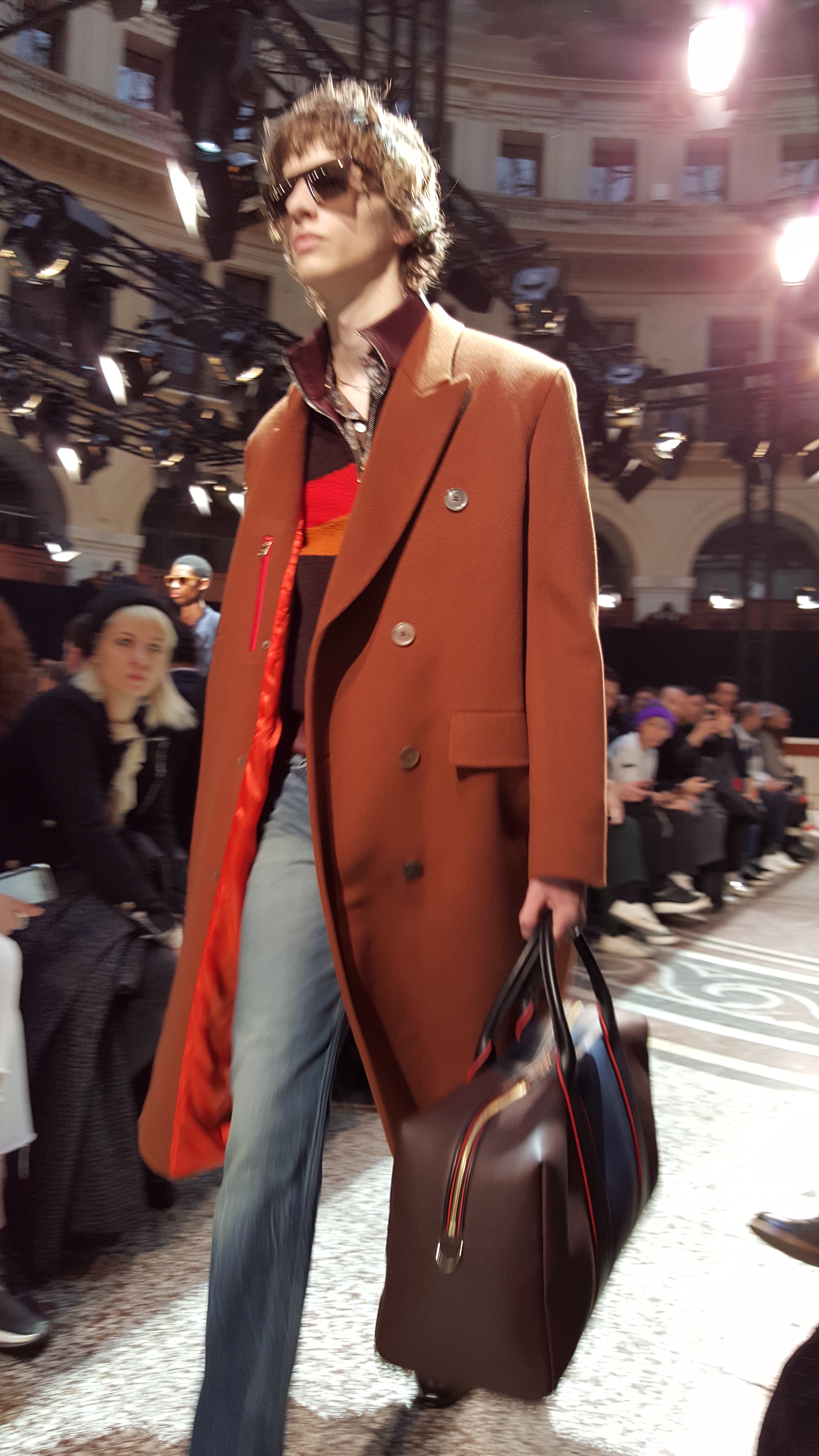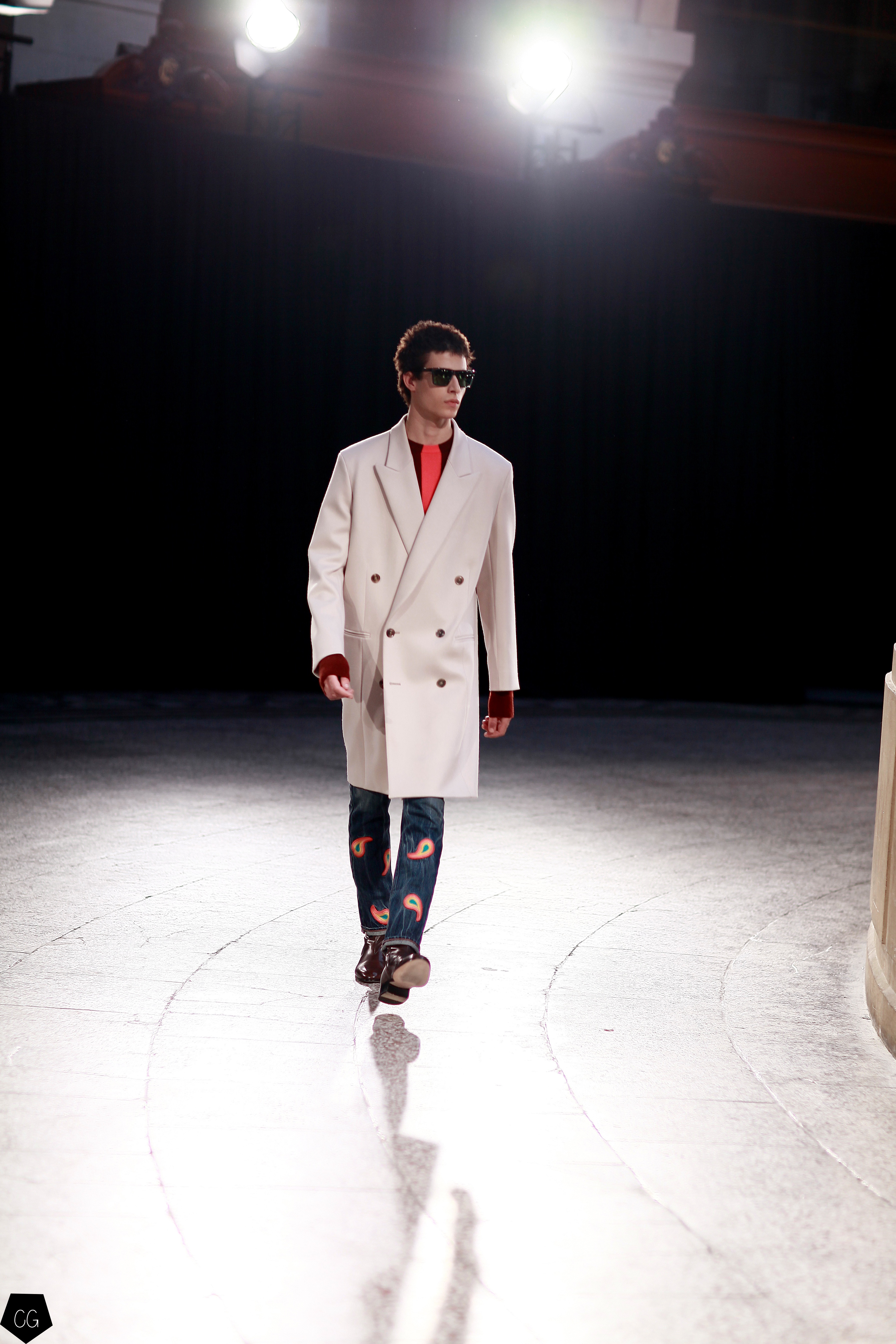 On retrouve donc des lignes. On en retrouve sur des mailles cashmeres, sur des manteaux tailor. On retrouve des broderies dinosaures, des imprimés digitaux péchés dans les archives de la maison, des bombers aux imprimés photos.