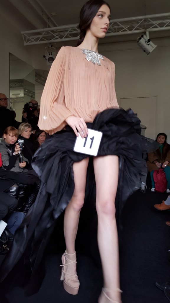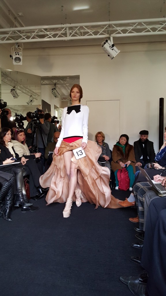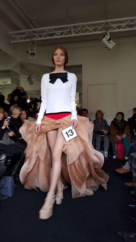 Faussement sages, les blouses transparentes à noeud cravate s’accompagnent de jupes « cascades » en organza; de grands jupons de ballets en tulle et faille plissées s’agrémentent d’un pull de daim couleur peau, brodé en 3 dimensions.