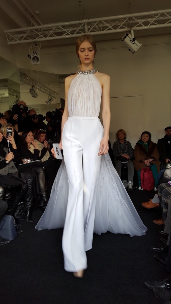 Un fourreau blanc laisse glisser sur une épaule une étole de crêpe brodée de plumes en silicone. Les combinaisons pantalon, constantes de Stephane Rolland, jouent de tournures en traînes ou manches géantes.