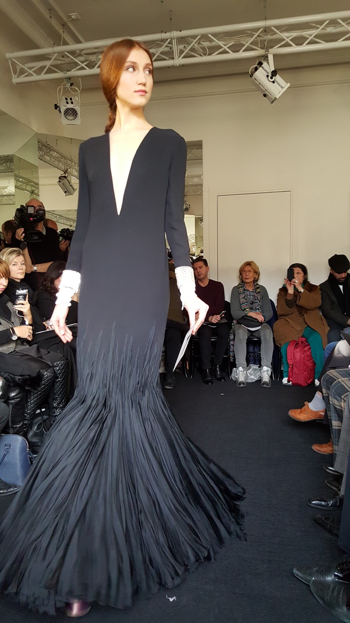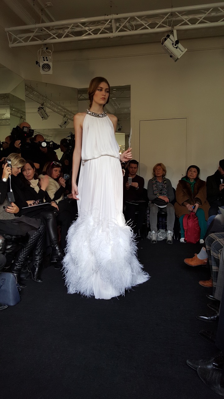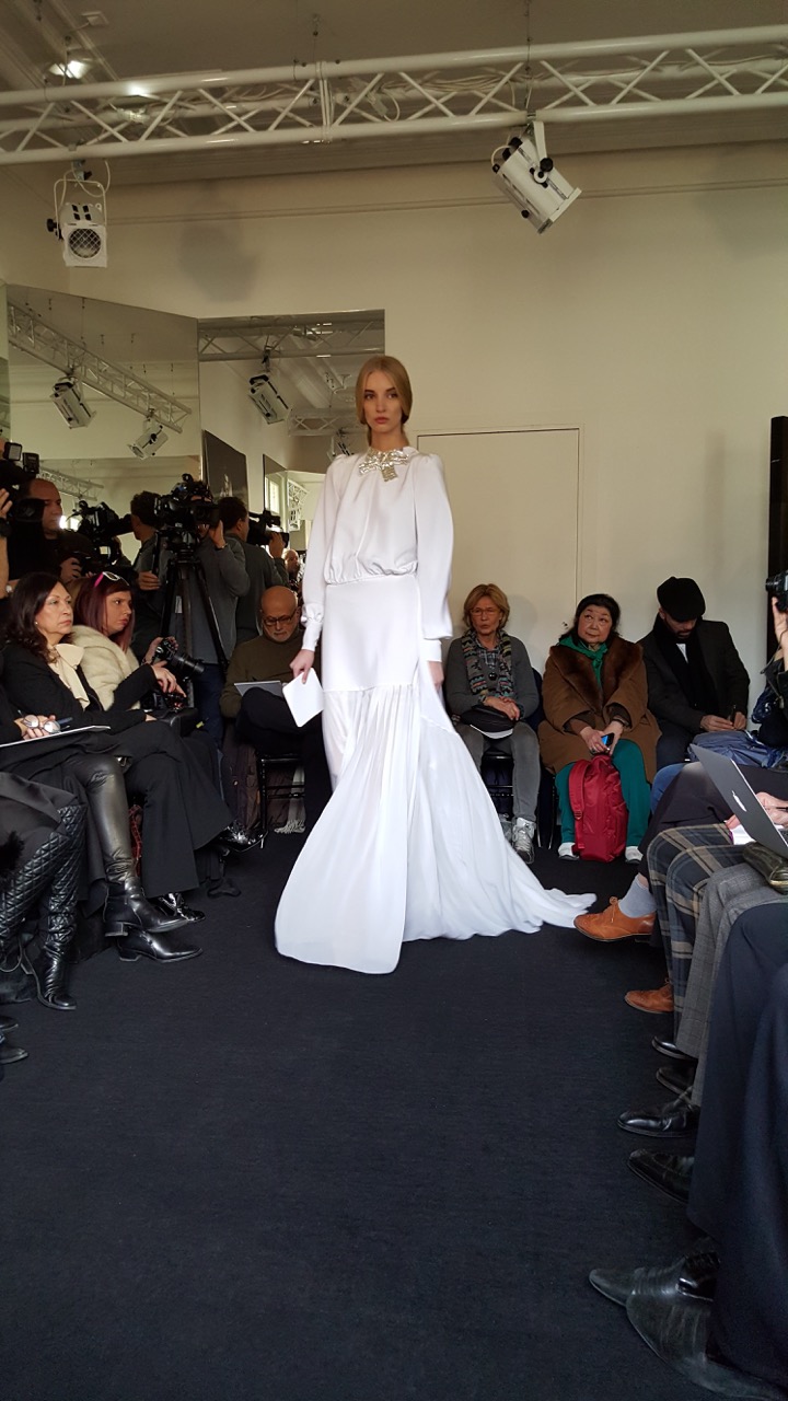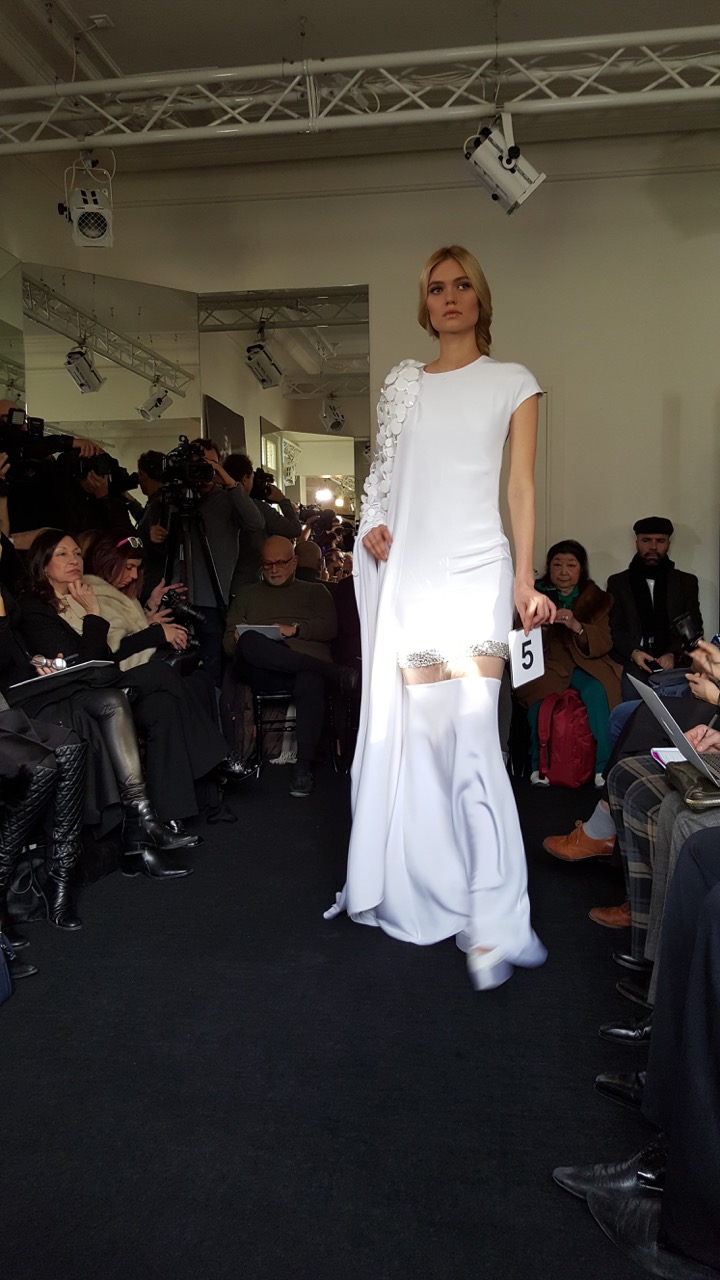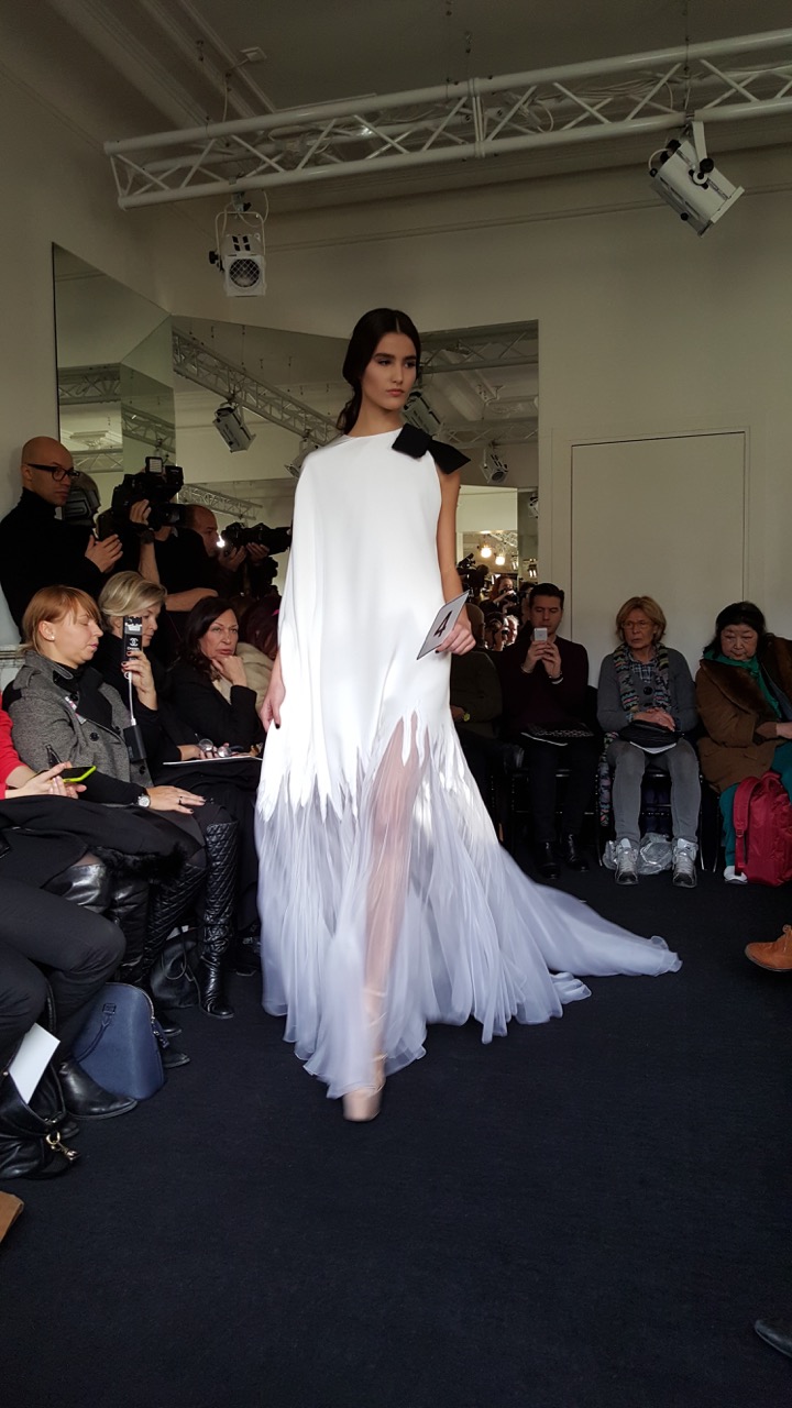 Un fourreau blanc laisse glisser sur une épaule une étole de crêpe brodée de plumes en silicone. Les combinaisons pantalon, constantes de Stephane Rolland, jouent de tournures en traînes ou manches géantes.