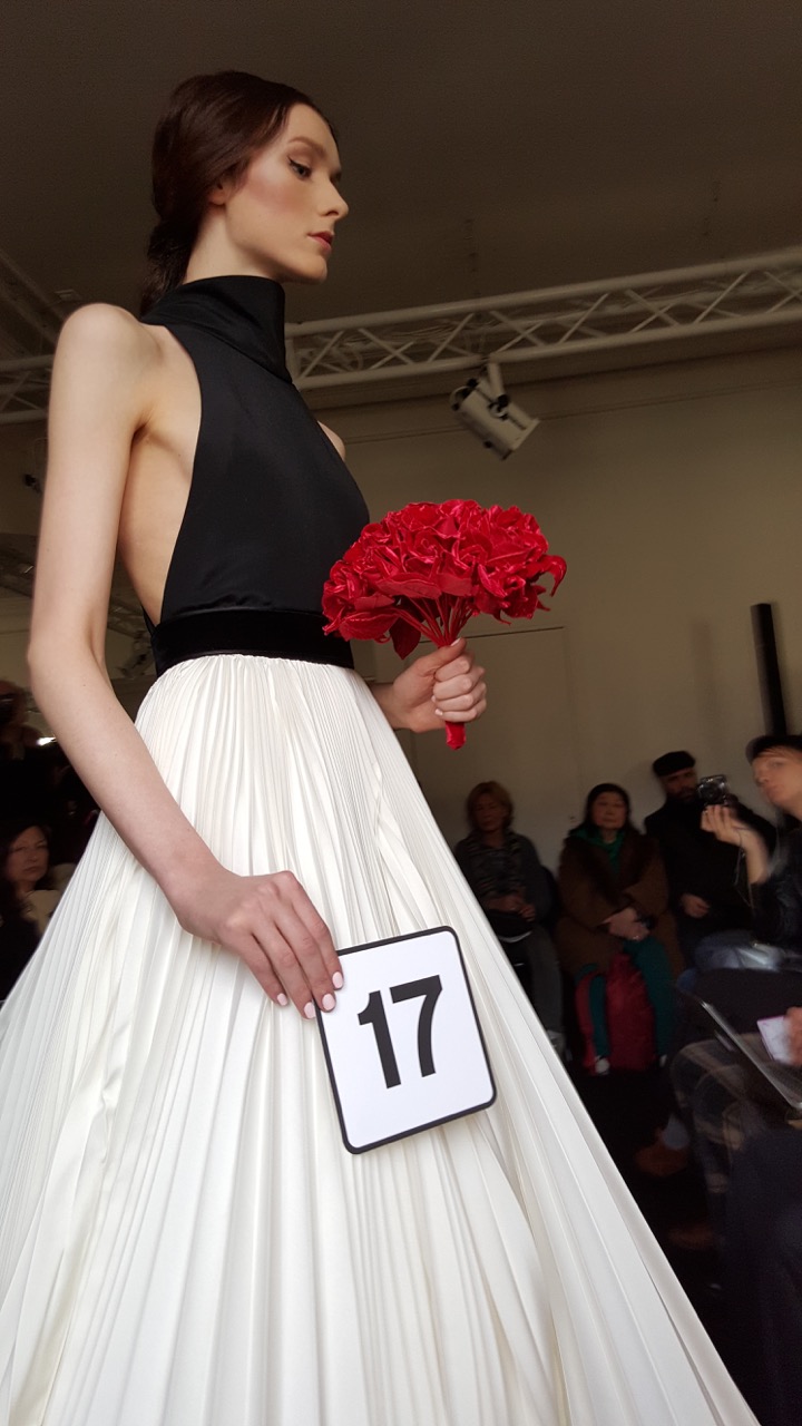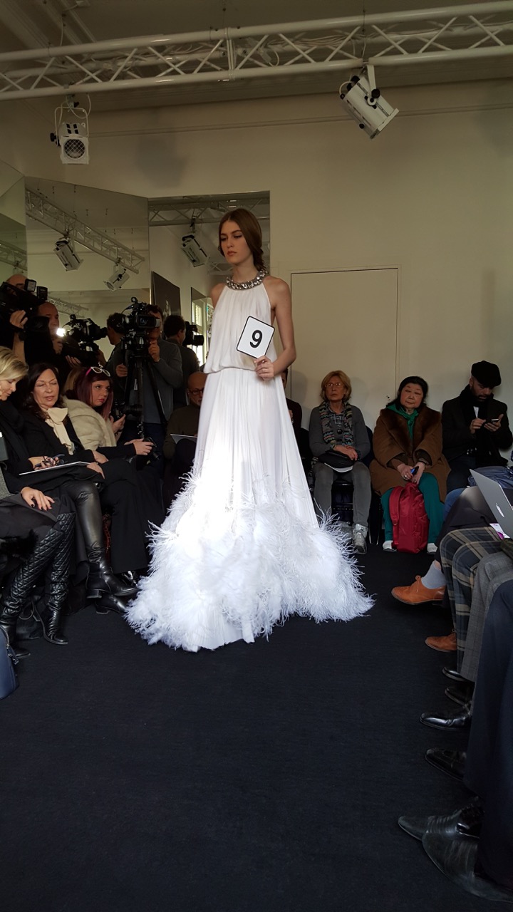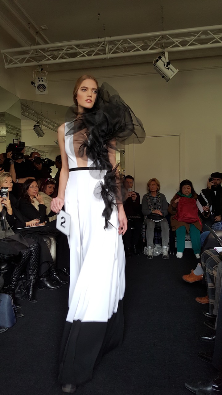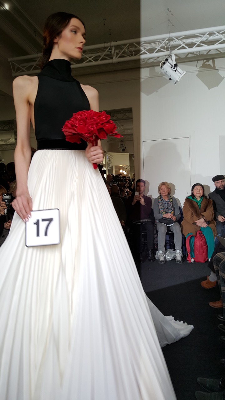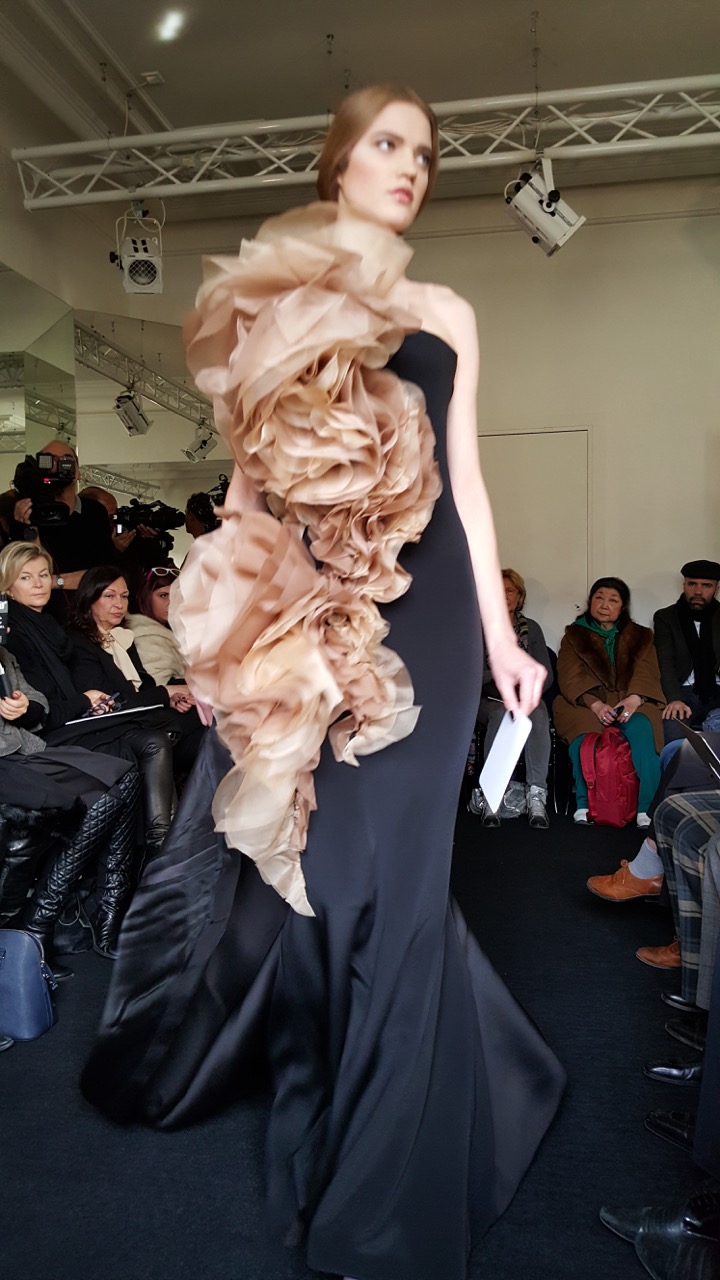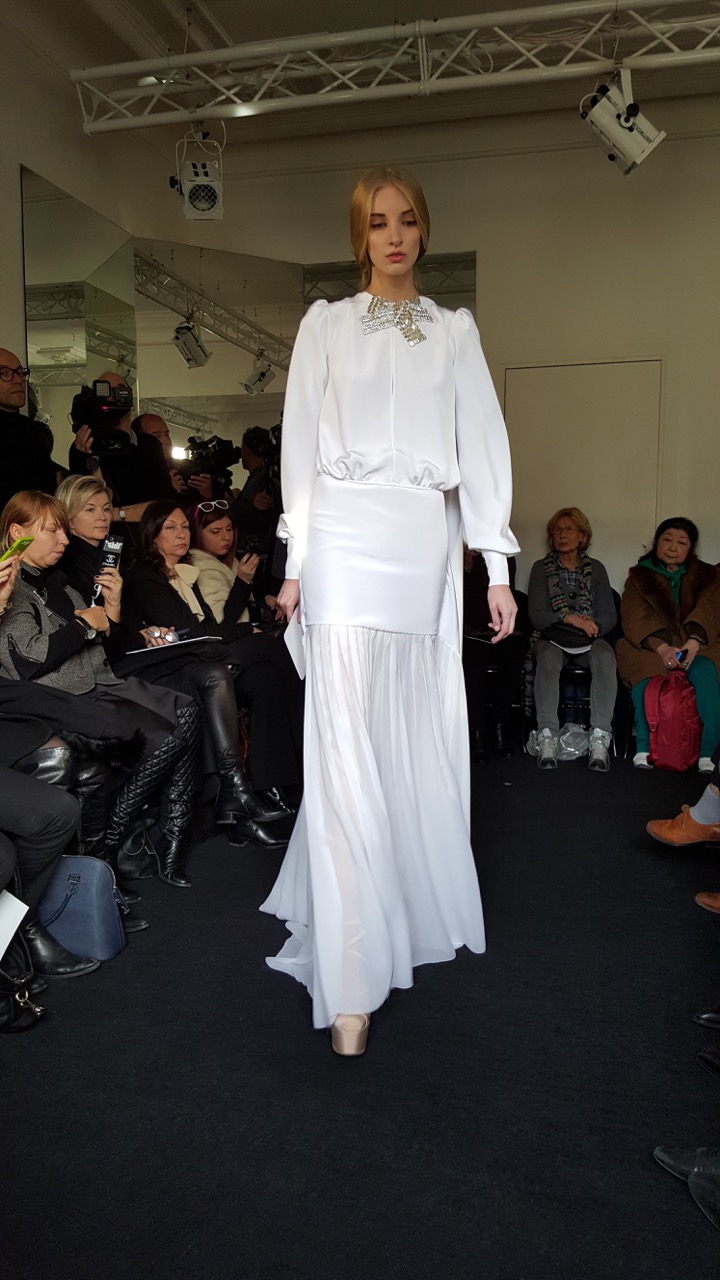 Un fourreau blanc laisse glisser sur une épaule une étole de crêpe brodée de plumes en silicone. Les combinaisons pantalon, constantes de Stephane Rolland, jouent de tournures en traînes ou manches géantes.
