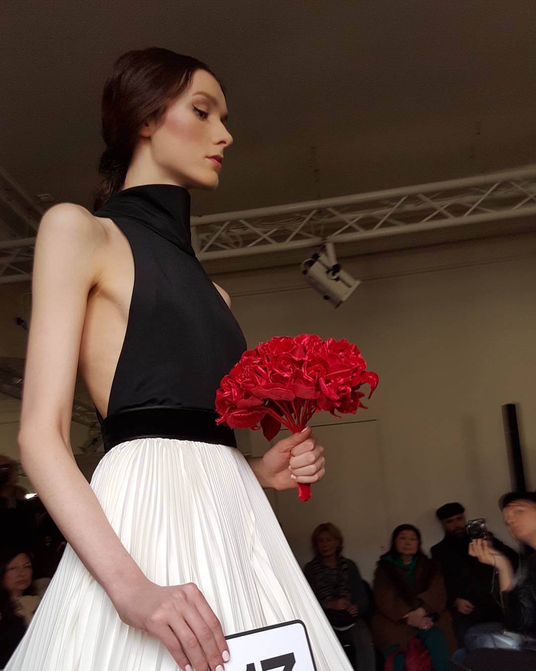 La silhouette est à la fois gracile, fluide, presque fragile telle une étoile du Palais Garnier, en crêpe fin blanc, noir ou peau, et orné de nuages d’organza froissé ou de plumes blanches qui accentuent chacun des pas …