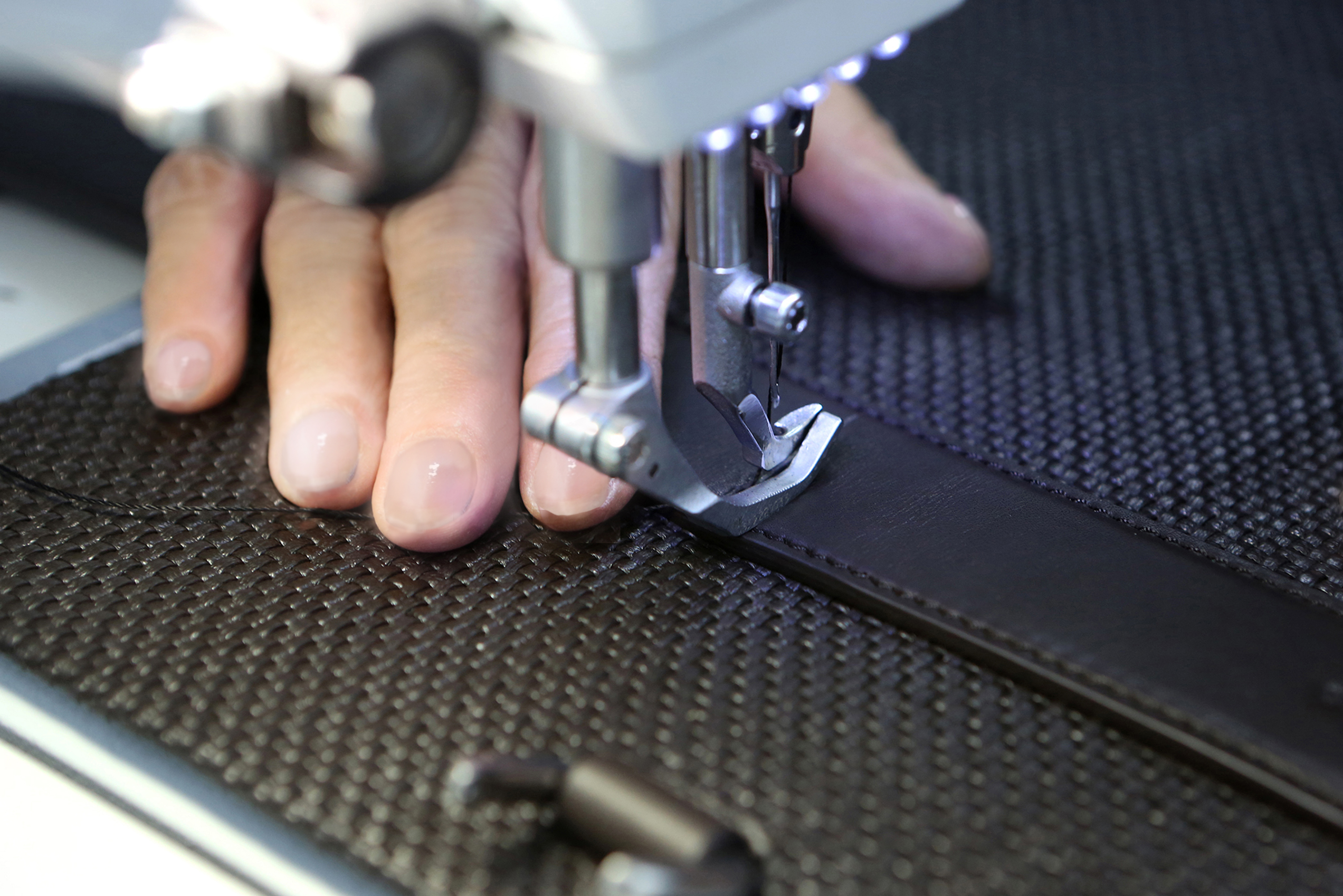 Des lanières de cuir nappa de 1,6/1,7 mm de largeur qui constituent la chaîne sont disposées sur un métier à tisser spécial et sont littéralement entrelacées avec des lanières horizontales qui constituent la trame, selon la méthode de tissage traditionnelle ; ce qui permet d’obtenir au final un véritable « tissu » issu du cuir.