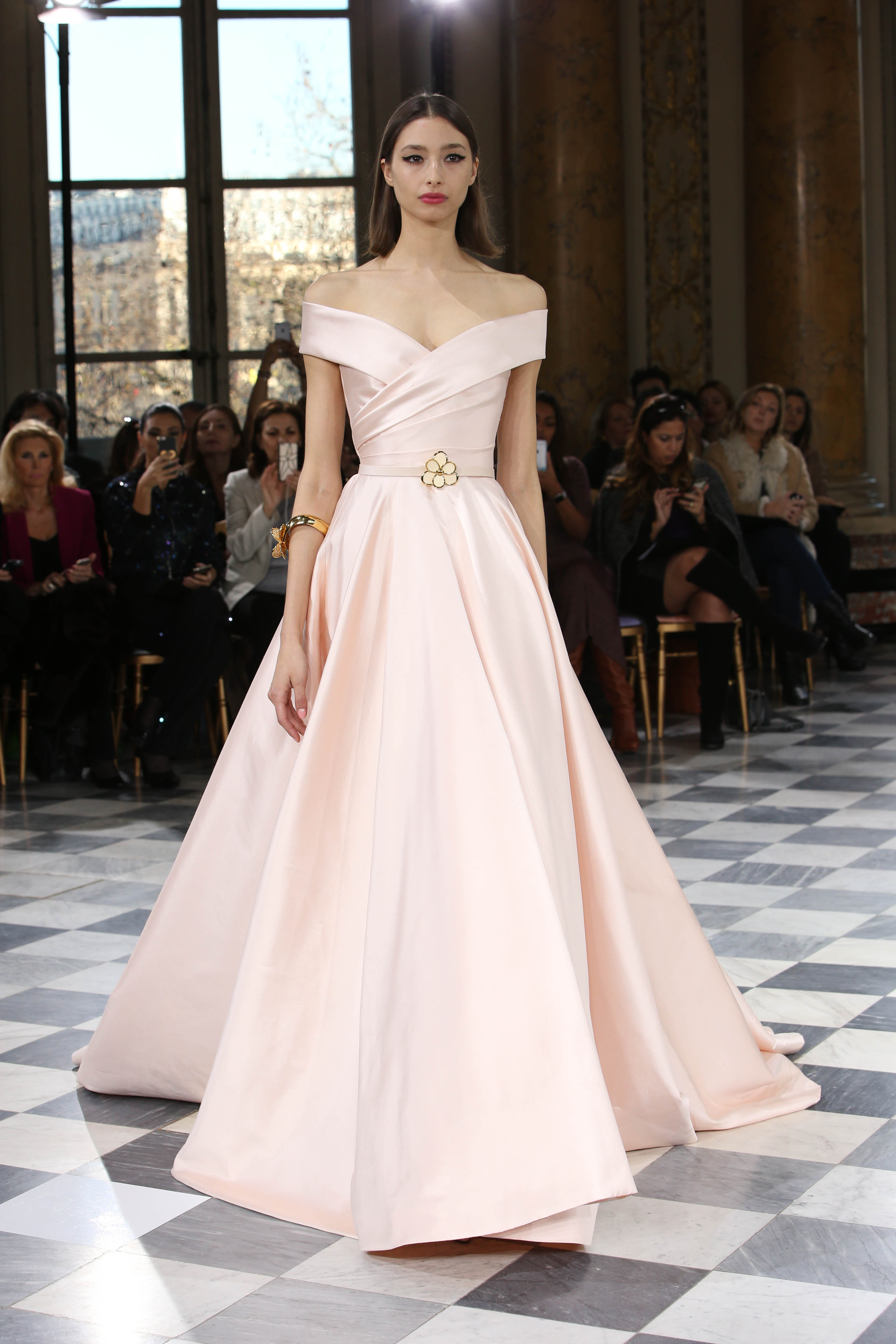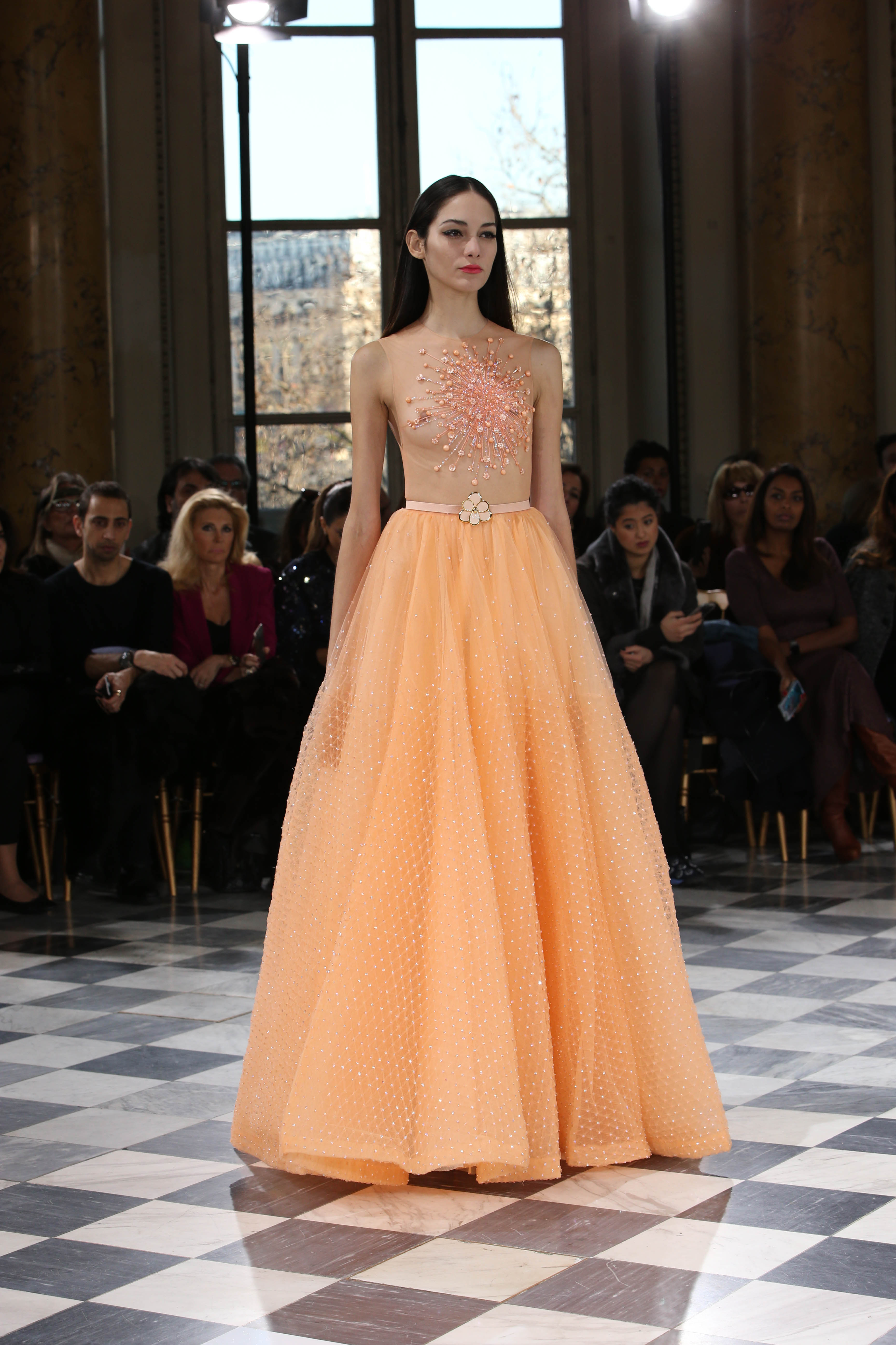 Subtile, la palette de couleur gagnent en intensité au contact des matières : un tulle rosé voile de mystère une mousseline vert amande, un dégradé de parme veloute de chaleur le chatoiement d’un bleu glacé, un camaïeu de pêches, d’abricots, de mandarines et de melons illumine une symphonie chromatique gourmande et fruitée, tandis que la crêpe de soie, la ziberline, la dentelle et l’organza traduisent avec somptuosité le message d’espoir et le secret caché derrière cette printanière floraison.