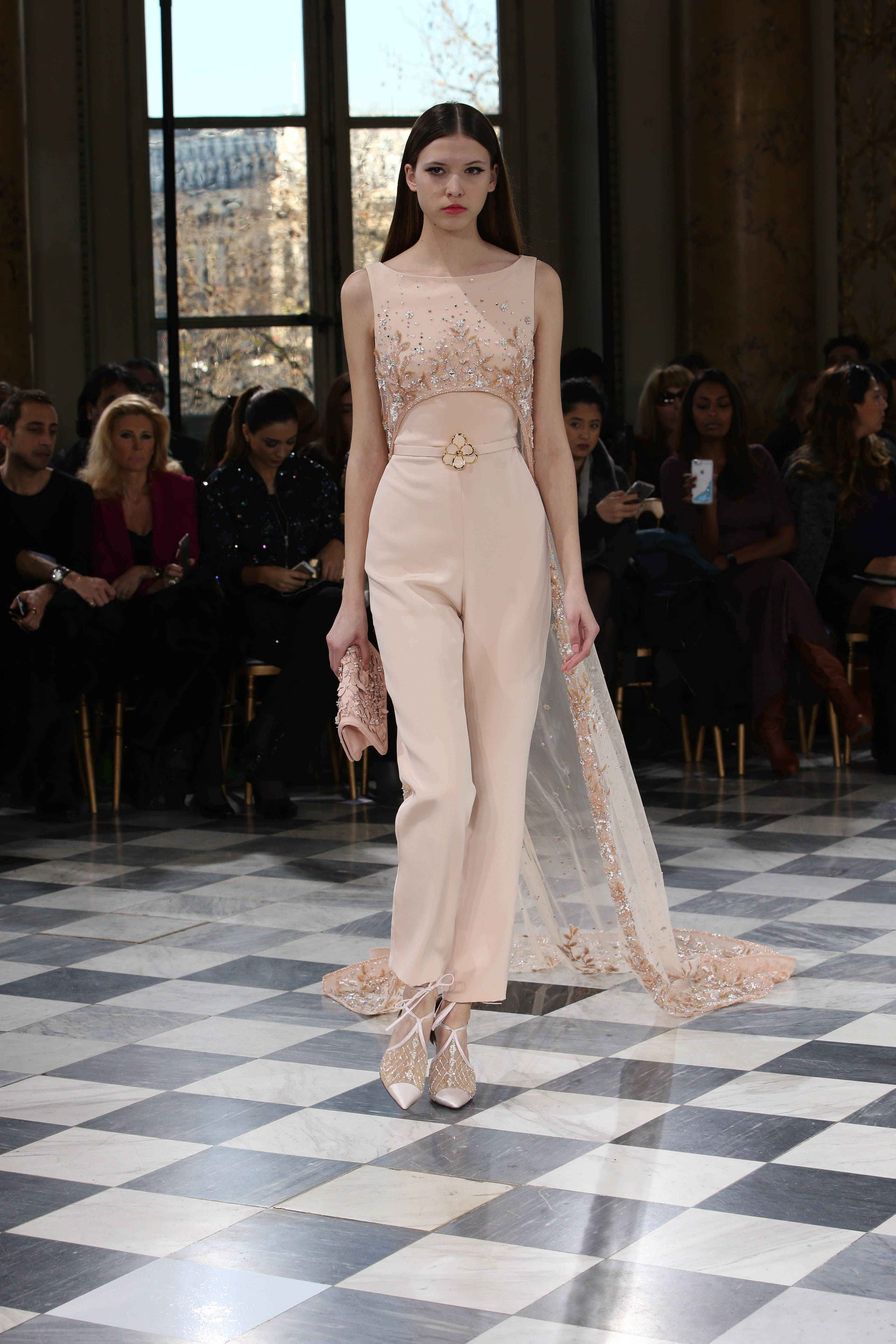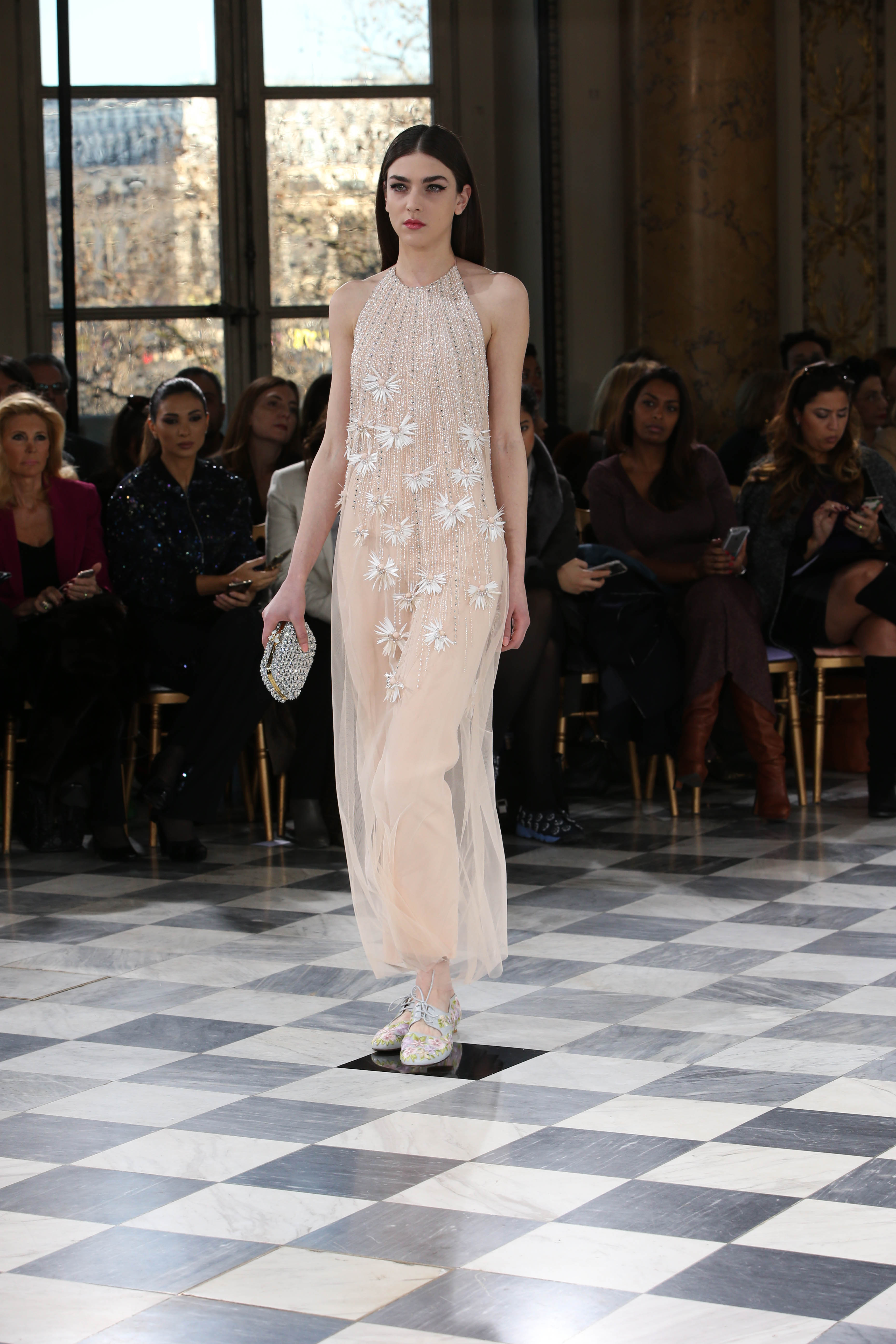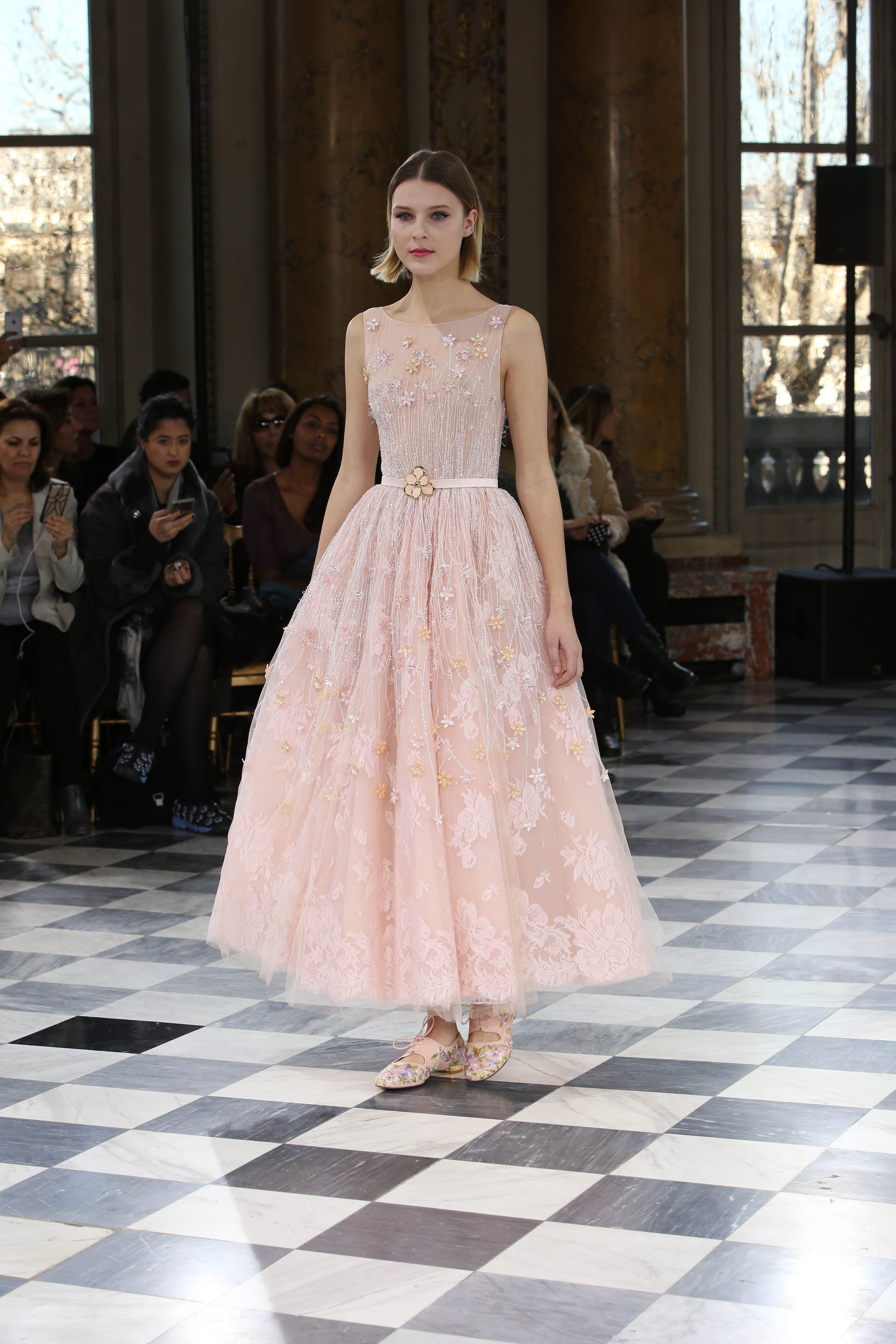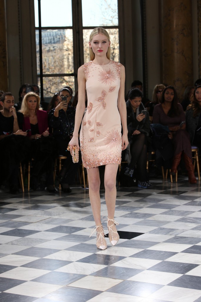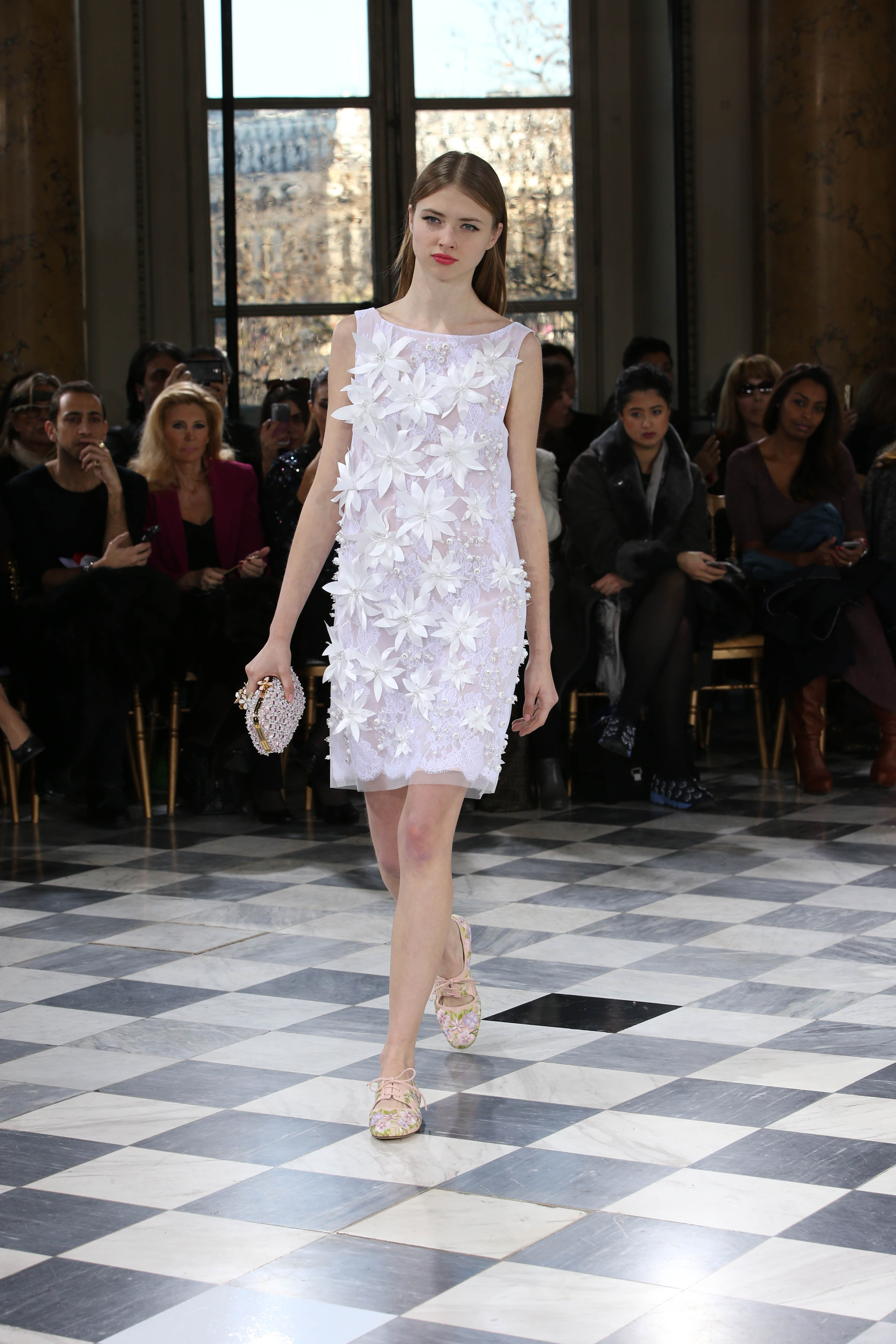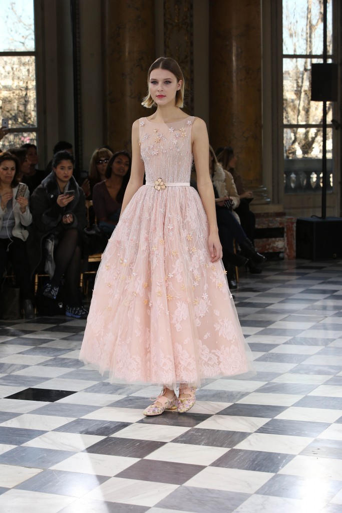 Faisant écho aux créations fondatrices de la Maison, un florilège de motifs floraux s’épanouit sur des broderies lumineuses, des bouquets de cristaux scintillants, des gerbes de couleurs délicates, des aigrettes de paillettes plumeuses, des gouttelettes de perles brillantes, des baies mattes et charnues, pour mieux sublimer les coupes modernes de tenues élégantes et aériennes. Parfois, un motif nid d’abeille – creusé en panneau de dentelle ou directement structuré à-même le tulle – atteste le savoir-faire suprême des ateliers maisons et sublime la noblesse d’une longue silhouette évanescente. La fluidité des capes-traînes exalte la féminité absolue de sculpturales robes fourreaux tandis que les corolles d’une jupe confèrent à un ensemble-tailleur l’espièglerie d’un bouquet en pleine éclosion. Véritable travail d’orfèvre, les accessoires traduisent ces accents bucoliques sur des petits sacs ouvragés ou des bijoux chatoyants somptueusement émaillés.