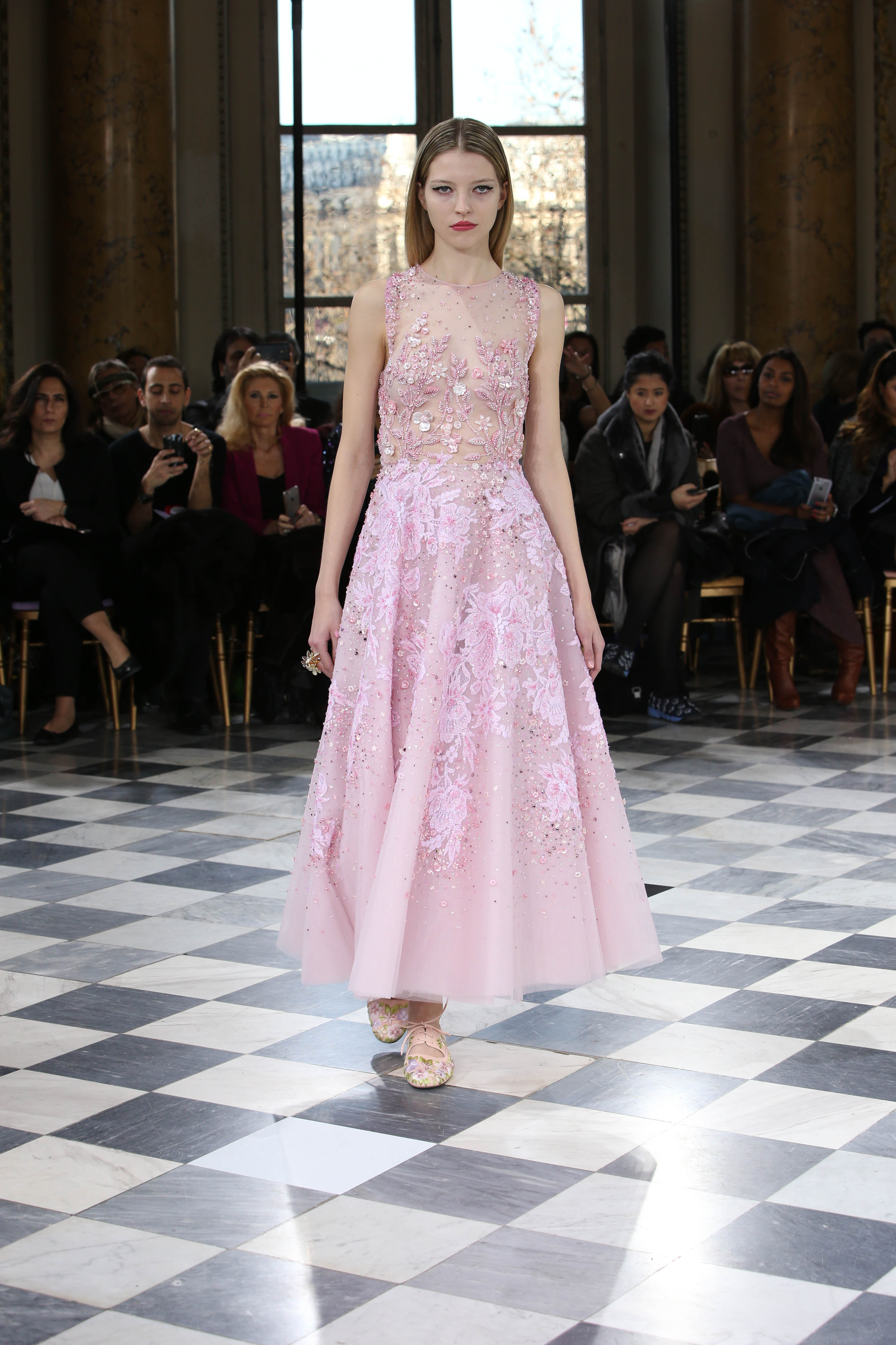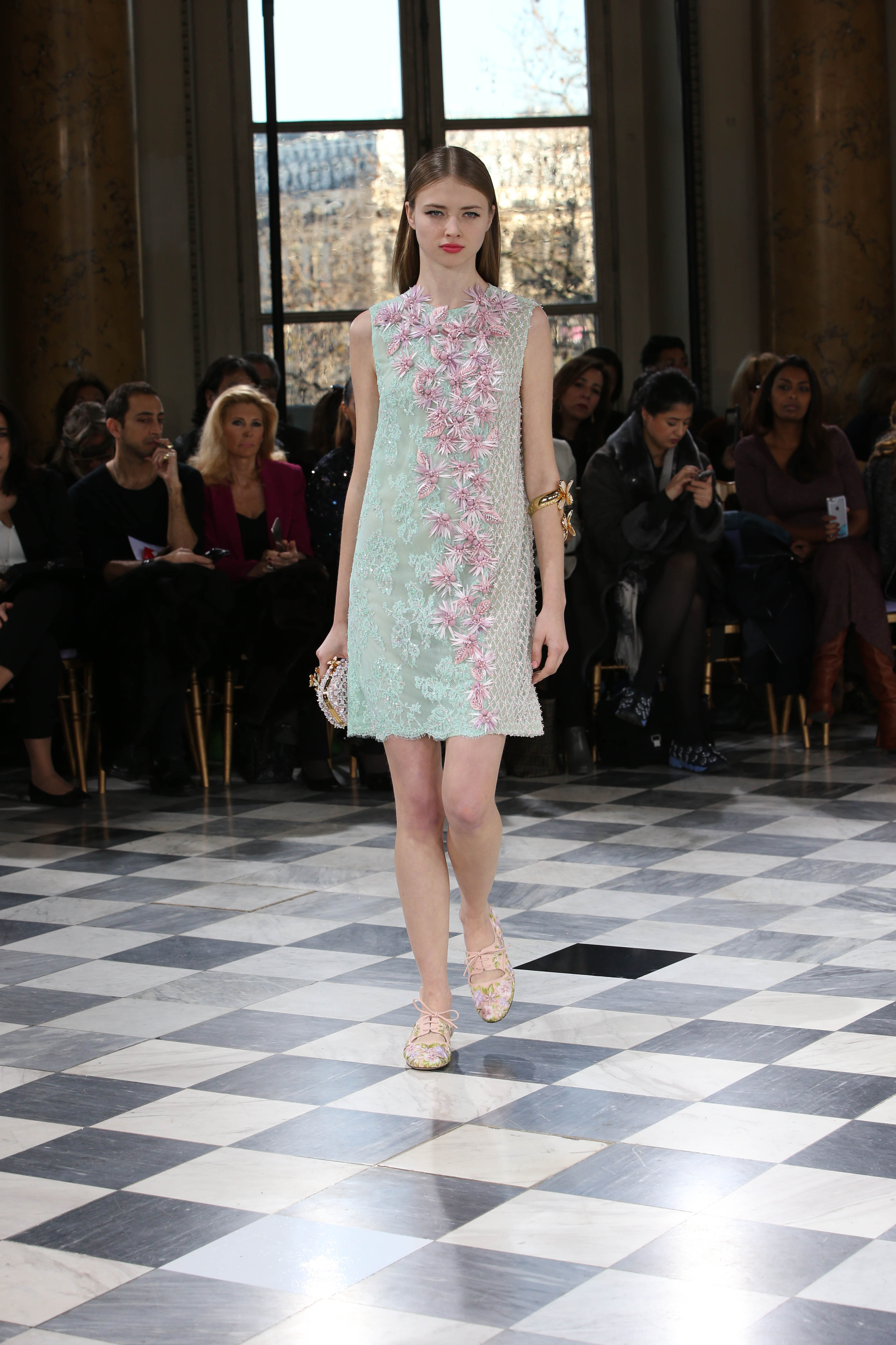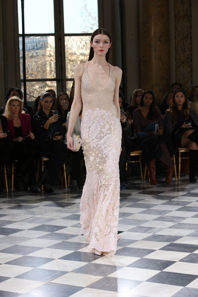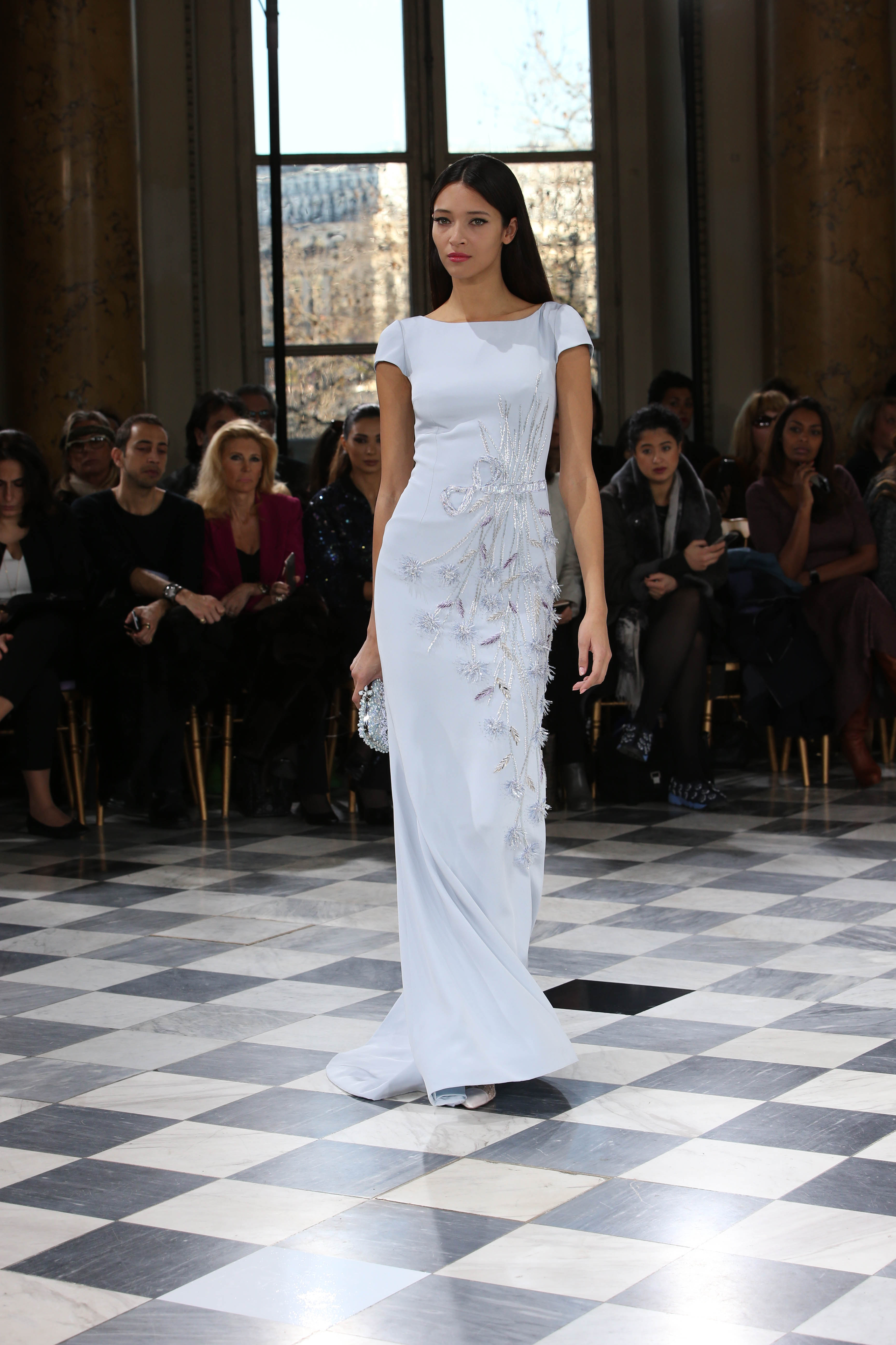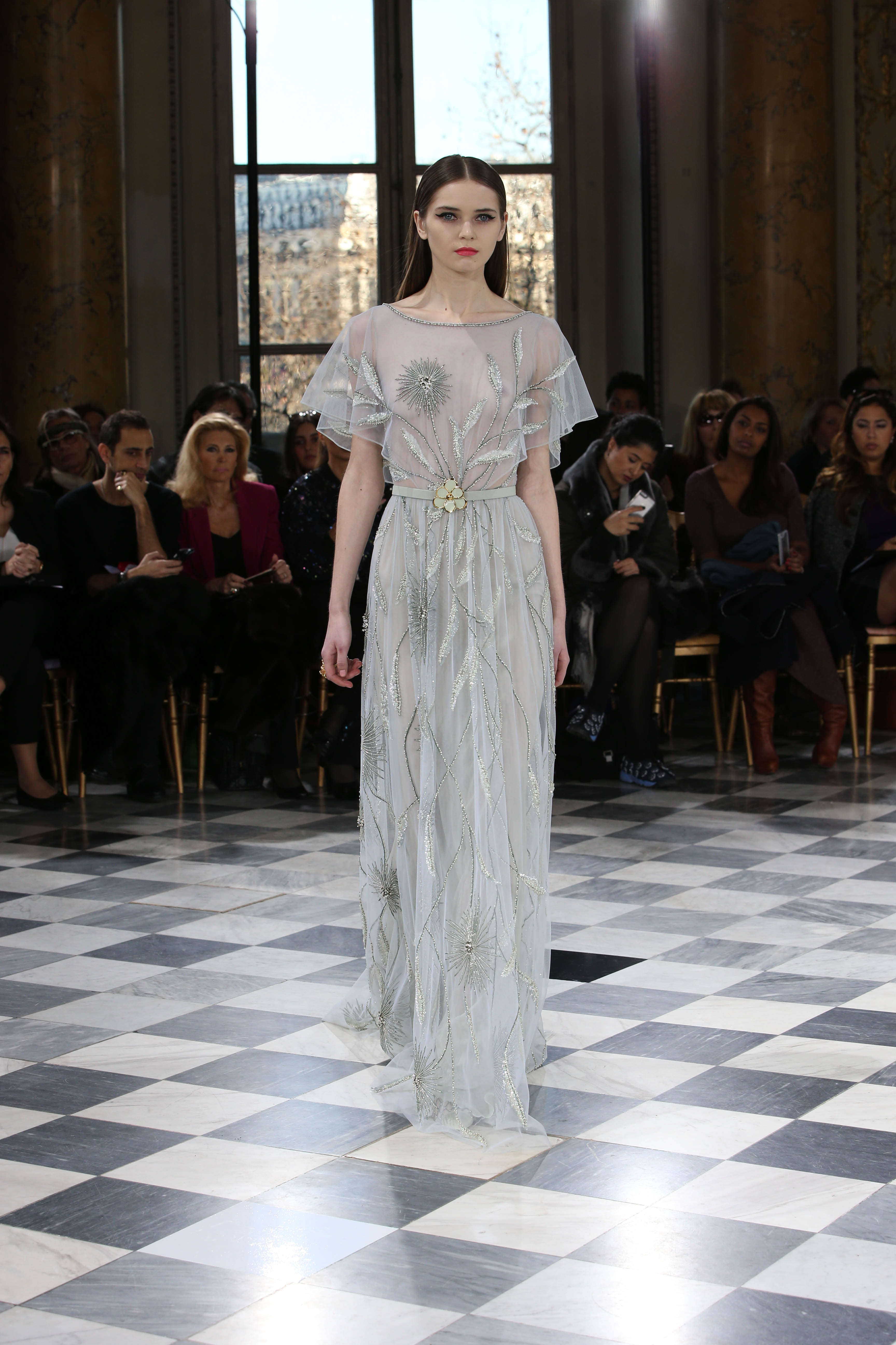 Faisant écho aux créations fondatrices de la Maison, un florilège de motifs floraux s’épanouit sur des broderies lumineuses, des bouquets de cristaux scintillants, des gerbes de couleurs délicates, des aigrettes de paillettes plumeuses, des gouttelettes de perles brillantes, des baies mattes et charnues, pour mieux sublimer les coupes modernes de tenues élégantes et aériennes. Parfois, un motif nid d’abeille – creusé en panneau de dentelle ou directement structuré à-même le tulle – atteste le savoir-faire suprême des ateliers maisons et sublime la noblesse d’une longue silhouette évanescente. La fluidité des capes-traînes exalte la féminité absolue de sculpturales robes fourreaux tandis que les corolles d’une jupe confèrent à un ensemble-tailleur l’espièglerie d’un bouquet en pleine éclosion. Véritable travail d’orfèvre, les accessoires traduisent ces accents bucoliques sur des petits sacs ouvragés ou des bijoux chatoyants somptueusement émaillés.