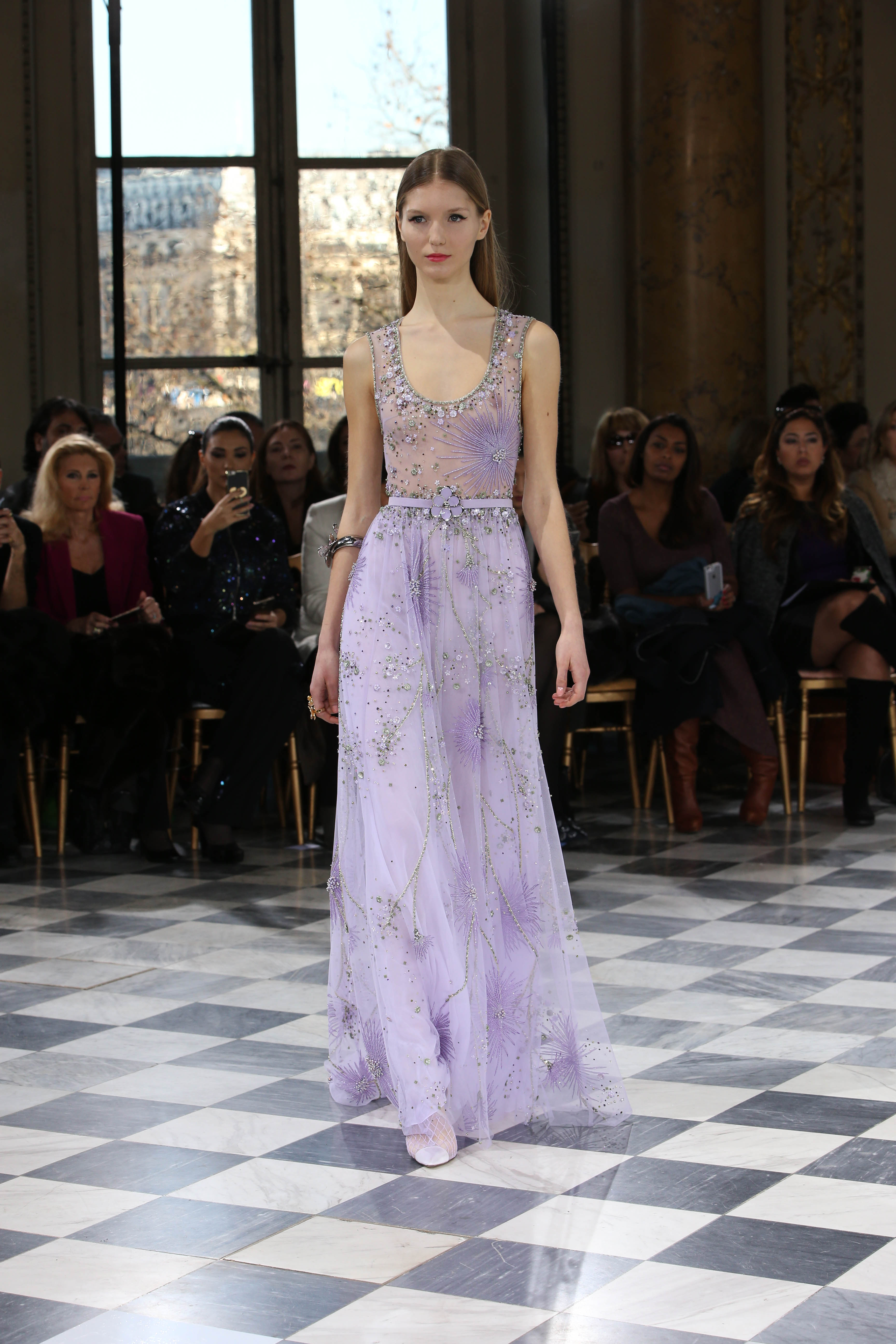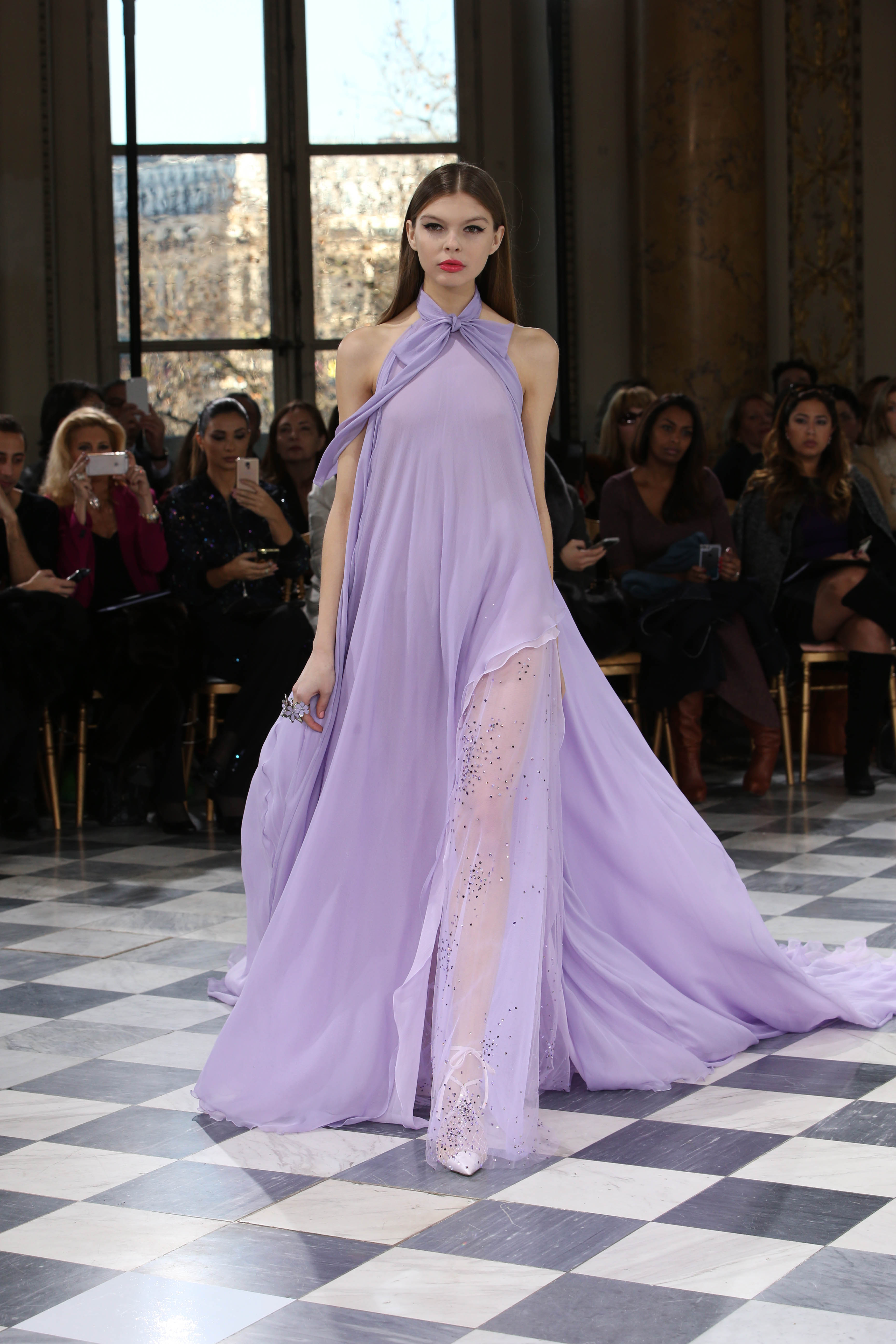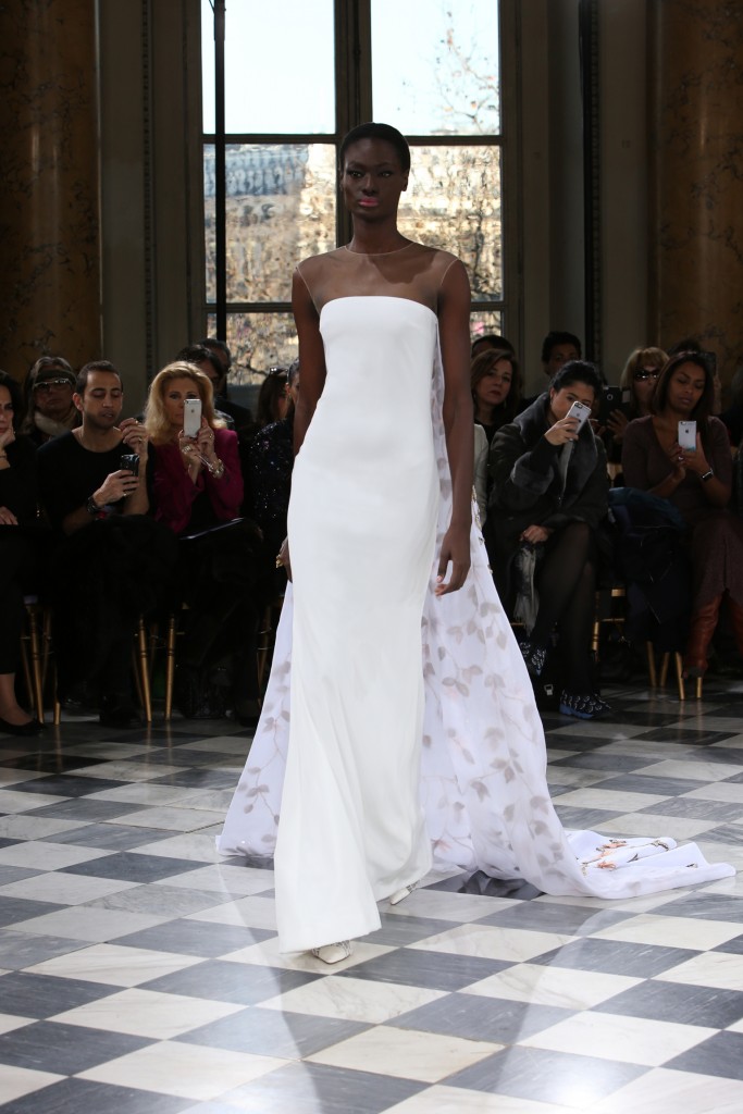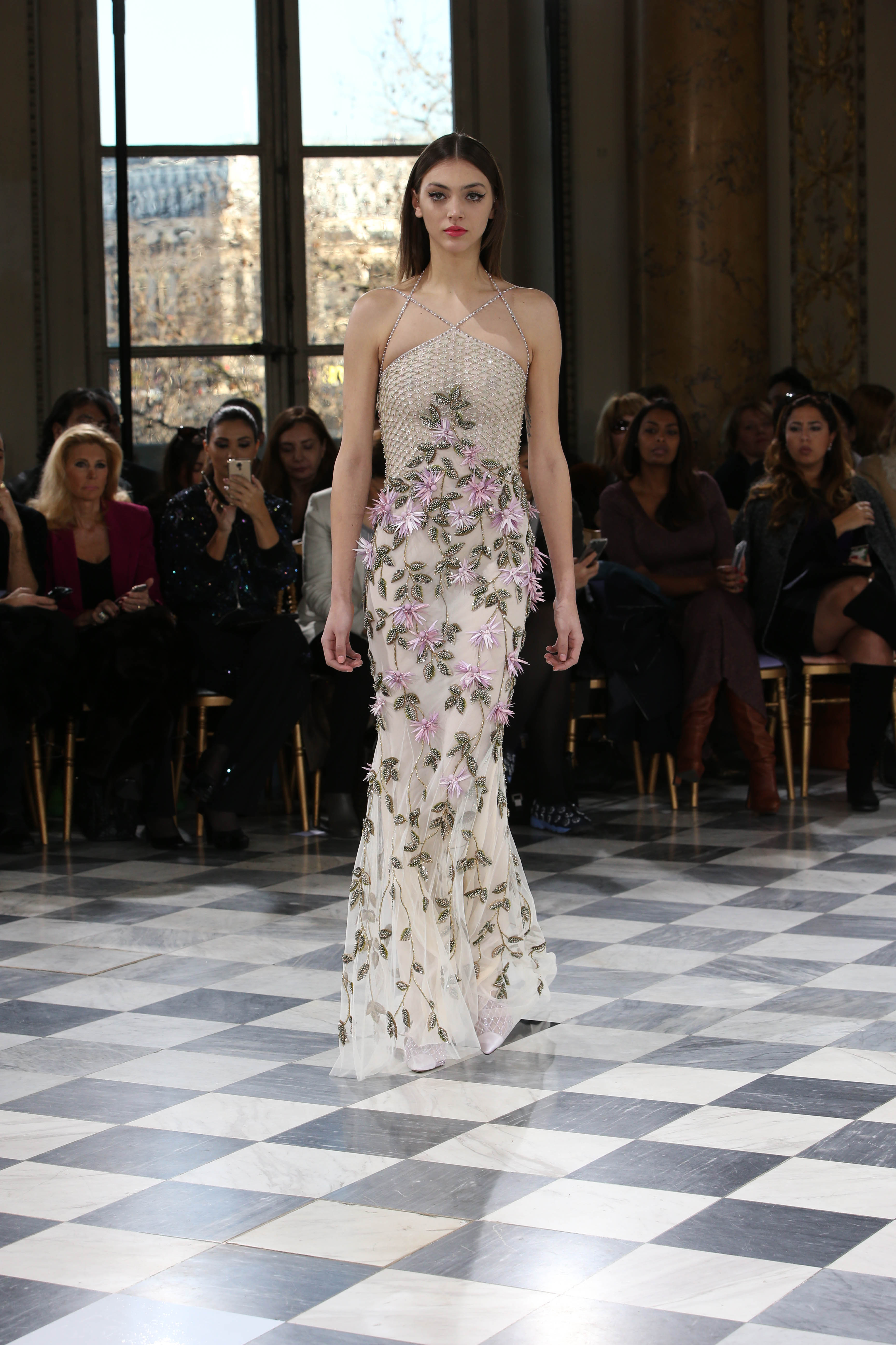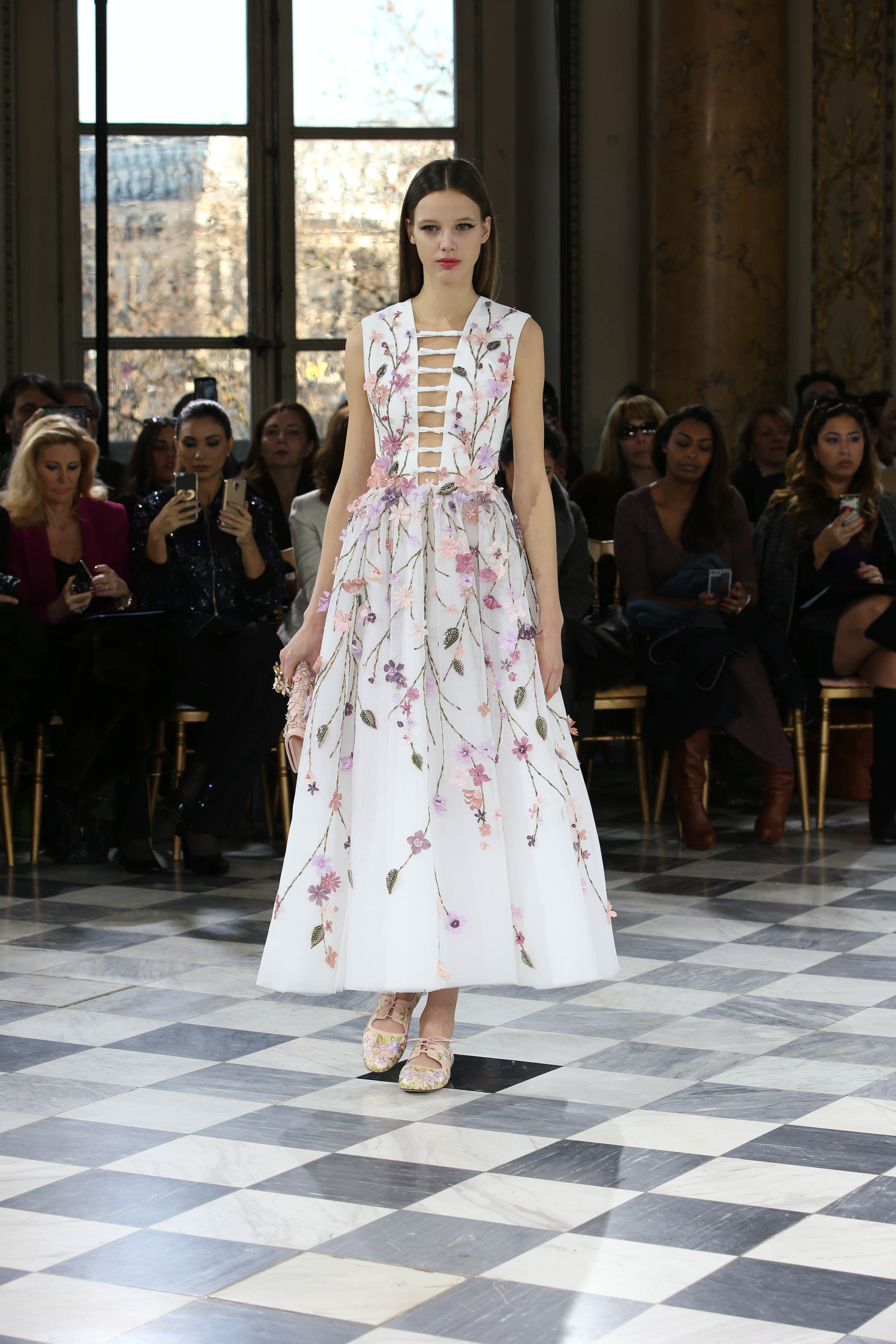 Faisant écho aux créations fondatrices de la Maison, un florilège de motifs floraux s’épanouit sur des broderies lumineuses, des bouquets de cristaux scintillants, des gerbes de couleurs délicates, des aigrettes de paillettes plumeuses, des gouttelettes de perles brillantes, des baies mattes et charnues, pour mieux sublimer les coupes modernes de tenues élégantes et aériennes. Parfois, un motif nid d’abeille – creusé en panneau de dentelle ou directement structuré à-même le tulle – atteste le savoir-faire suprême des ateliers maisons et sublime la noblesse d’une longue silhouette évanescente. La fluidité des capes-traînes exalte la féminité absolue de sculpturales robes fourreaux tandis que les corolles d’une jupe confèrent à un ensemble-tailleur l’espièglerie d’un bouquet en pleine éclosion. Véritable travail d’orfèvre, les accessoires traduisent ces accents bucoliques sur des petits sacs ouvragés ou des bijoux chatoyants somptueusement émaillés.