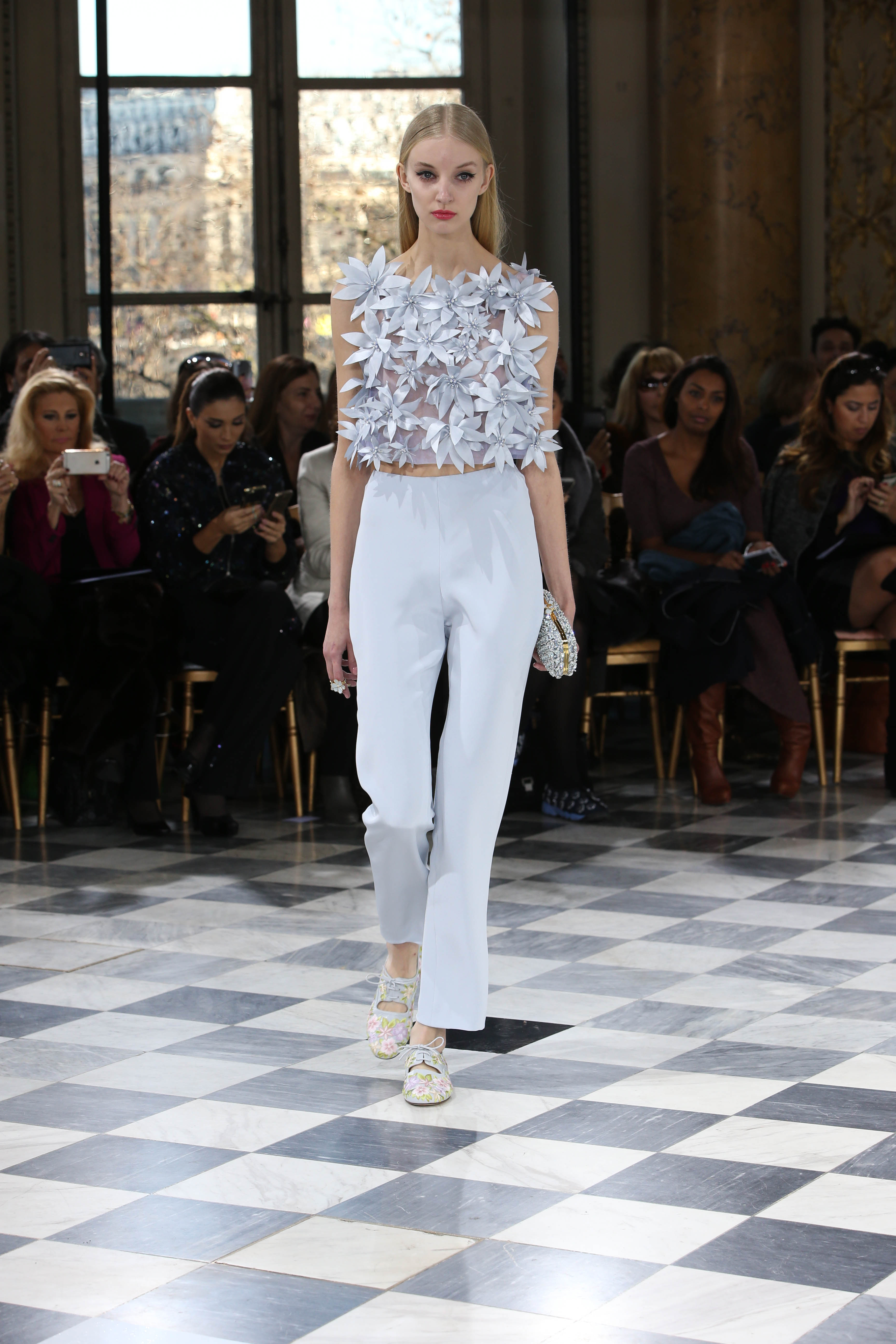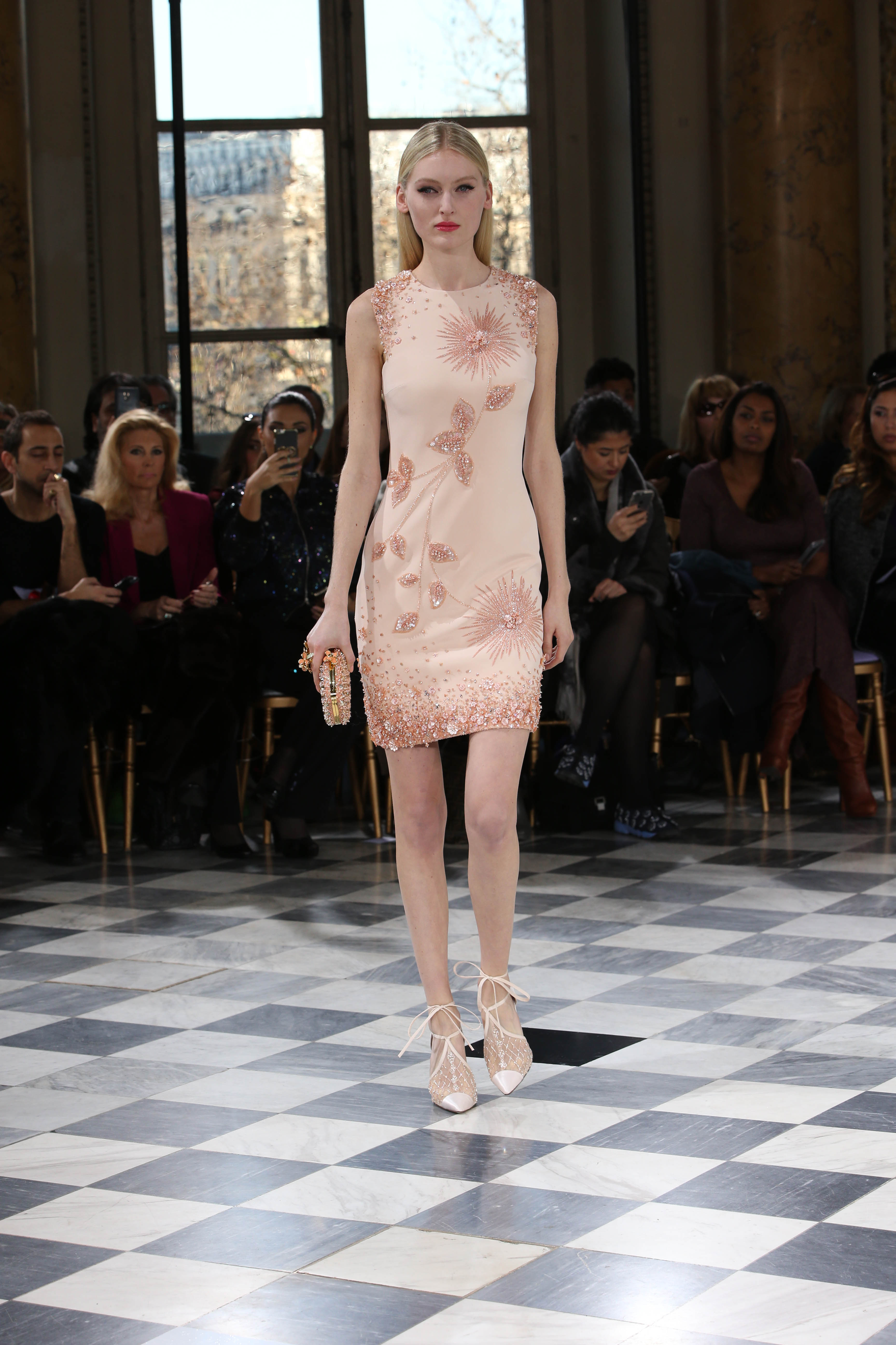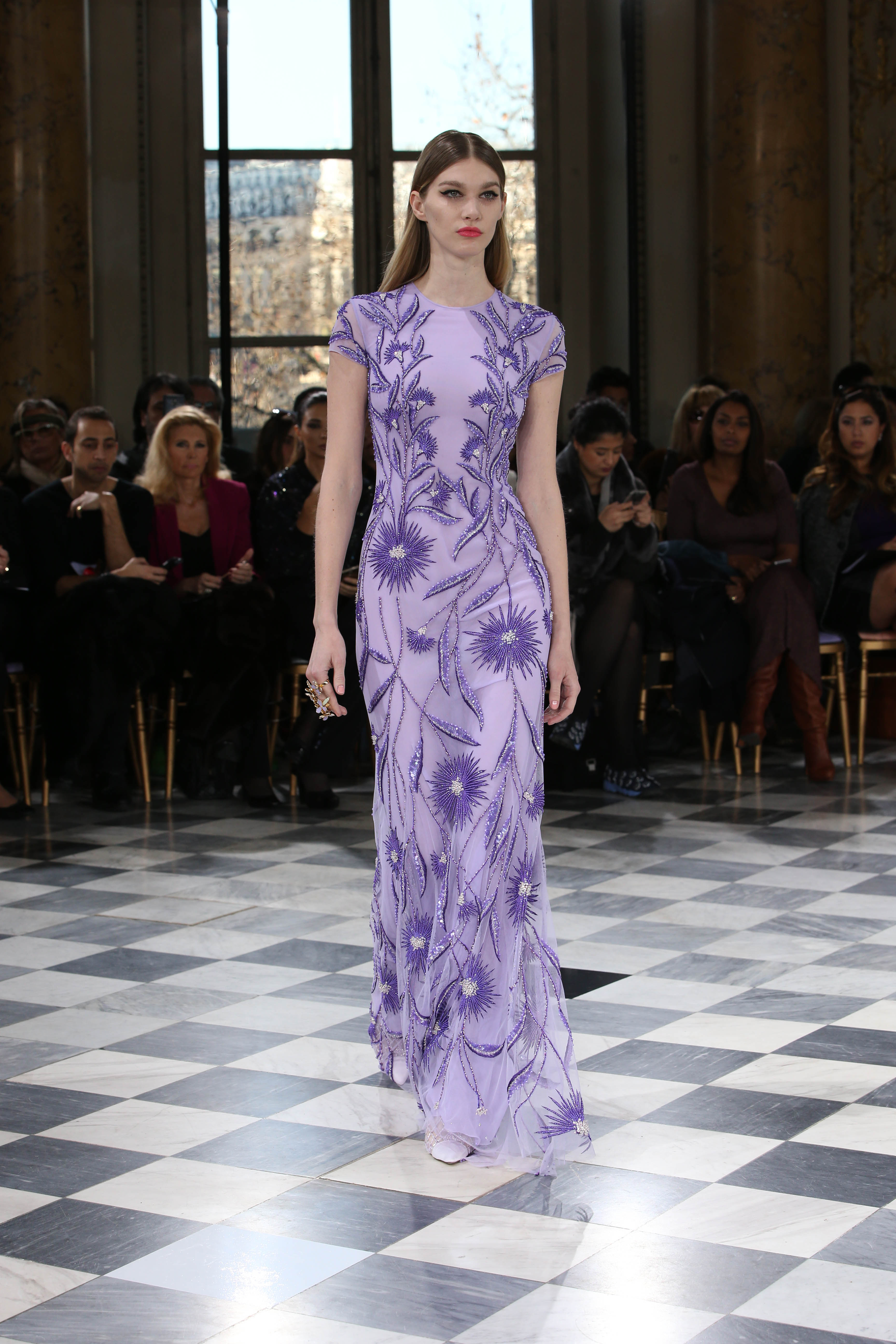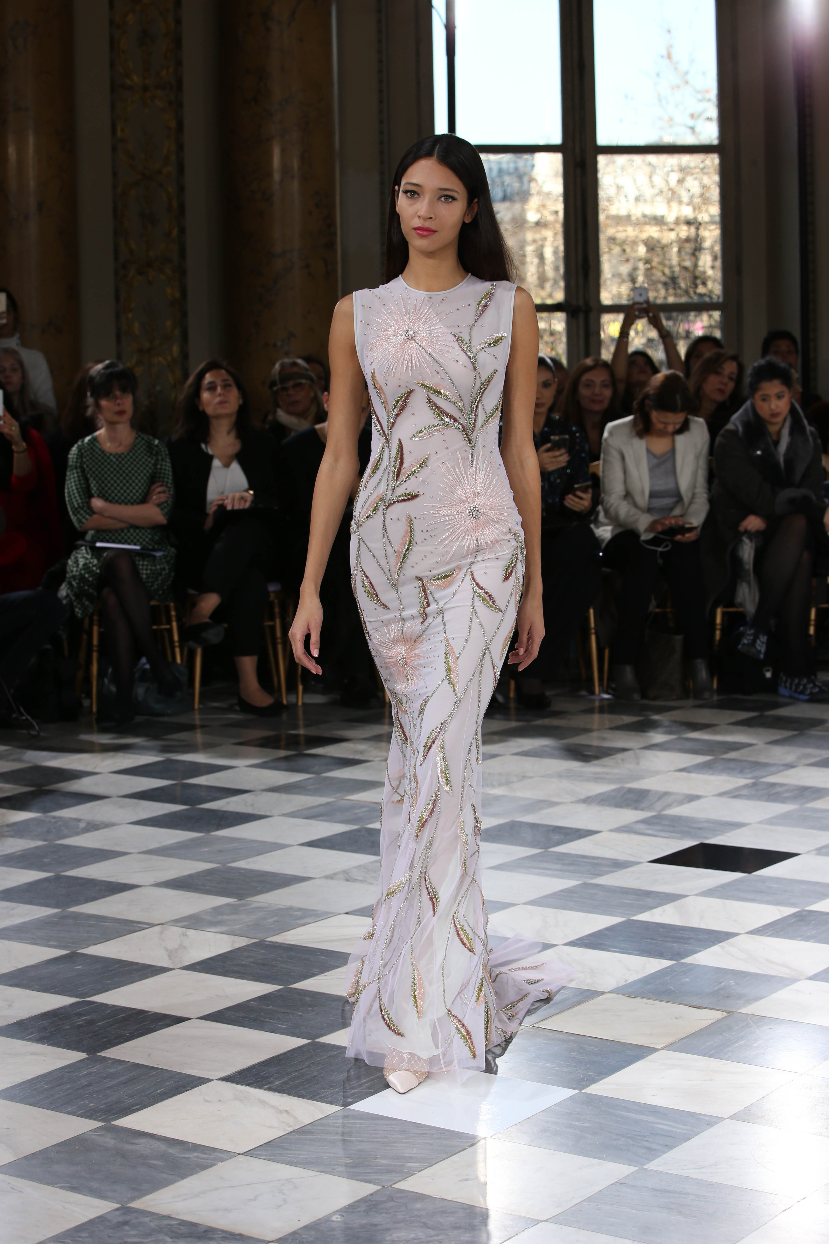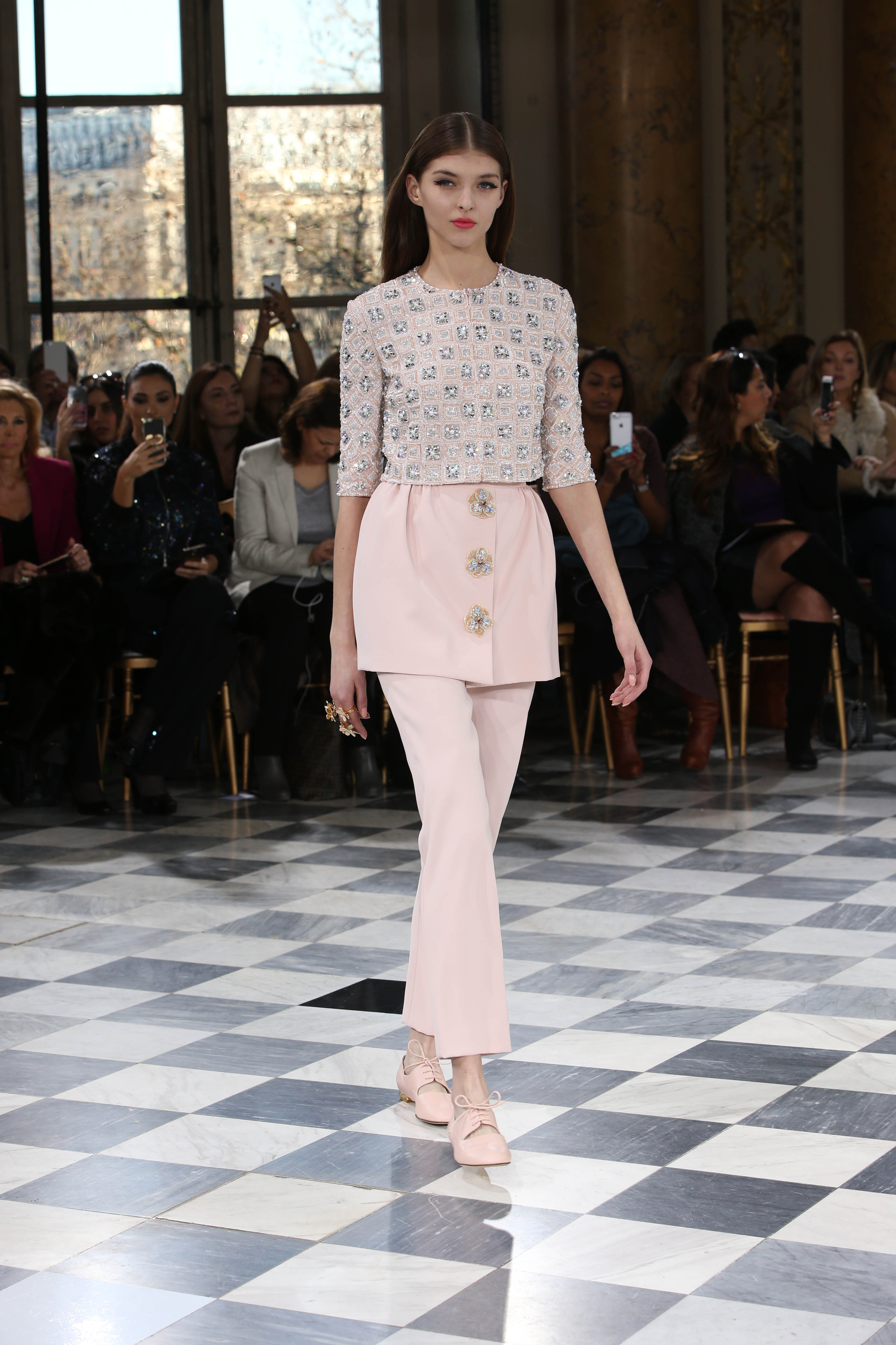 Faisant écho aux créations fondatrices de la Maison, un florilège de motifs floraux s’épanouit sur des broderies lumineuses, des bouquets de cristaux scintillants, des gerbes de couleurs délicates, des aigrettes de paillettes plumeuses, des gouttelettes de perles brillantes, des baies mattes et charnues, pour mieux sublimer les coupes modernes de tenues élégantes et aériennes. Parfois, un motif nid d’abeille – creusé en panneau de dentelle ou directement structuré à-même le tulle – atteste le savoir-faire suprême des ateliers maisons et sublime la noblesse d’une longue silhouette évanescente. La fluidité des capes-traînes exalte la féminité absolue de sculpturales robes fourreaux tandis que les corolles d’une jupe confèrent à un ensemble-tailleur l’espièglerie d’un bouquet en pleine éclosion. Véritable travail d’orfèvre, les accessoires traduisent ces accents bucoliques sur des petits sacs ouvragés ou des bijoux chatoyants somptueusement émaillés.
