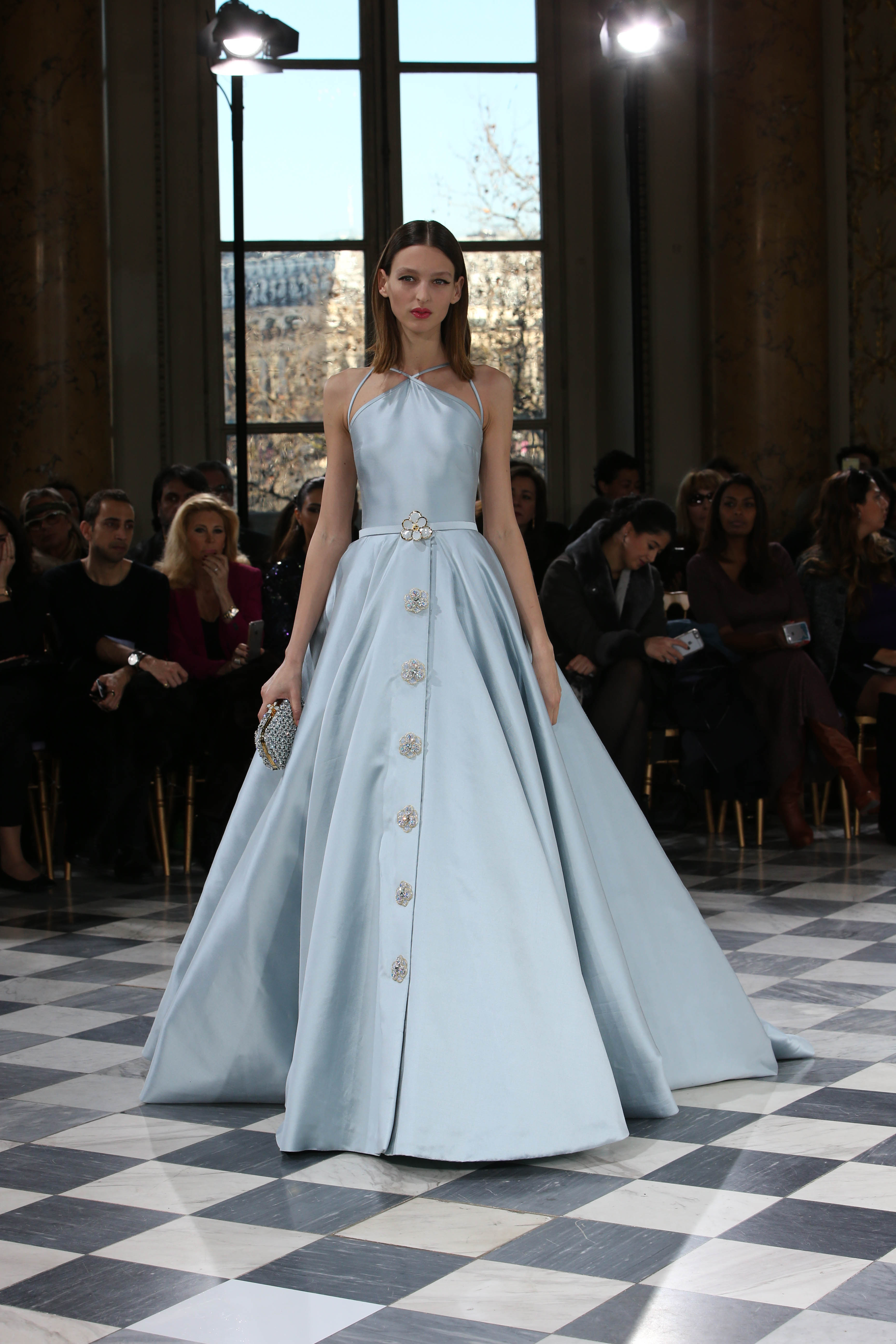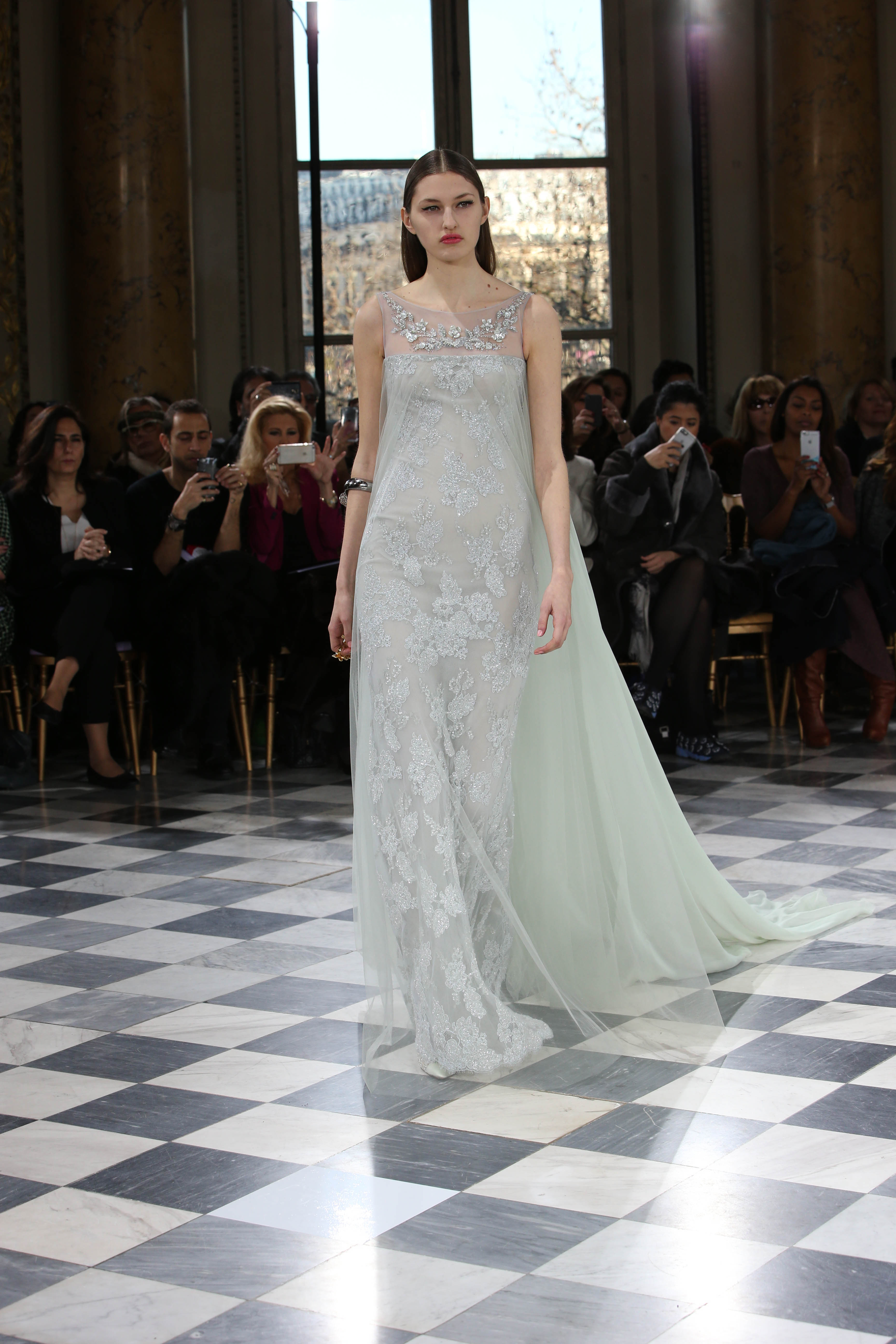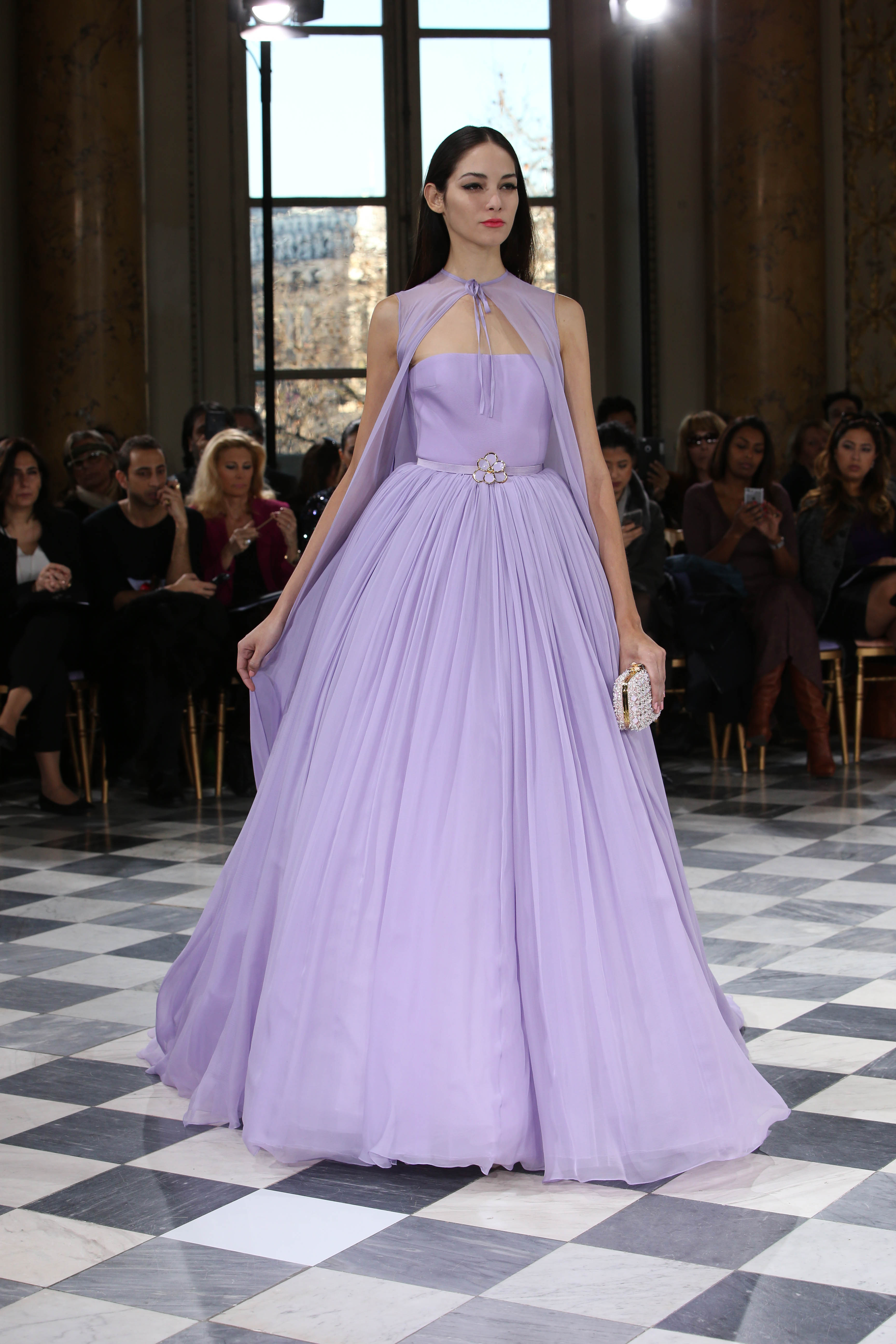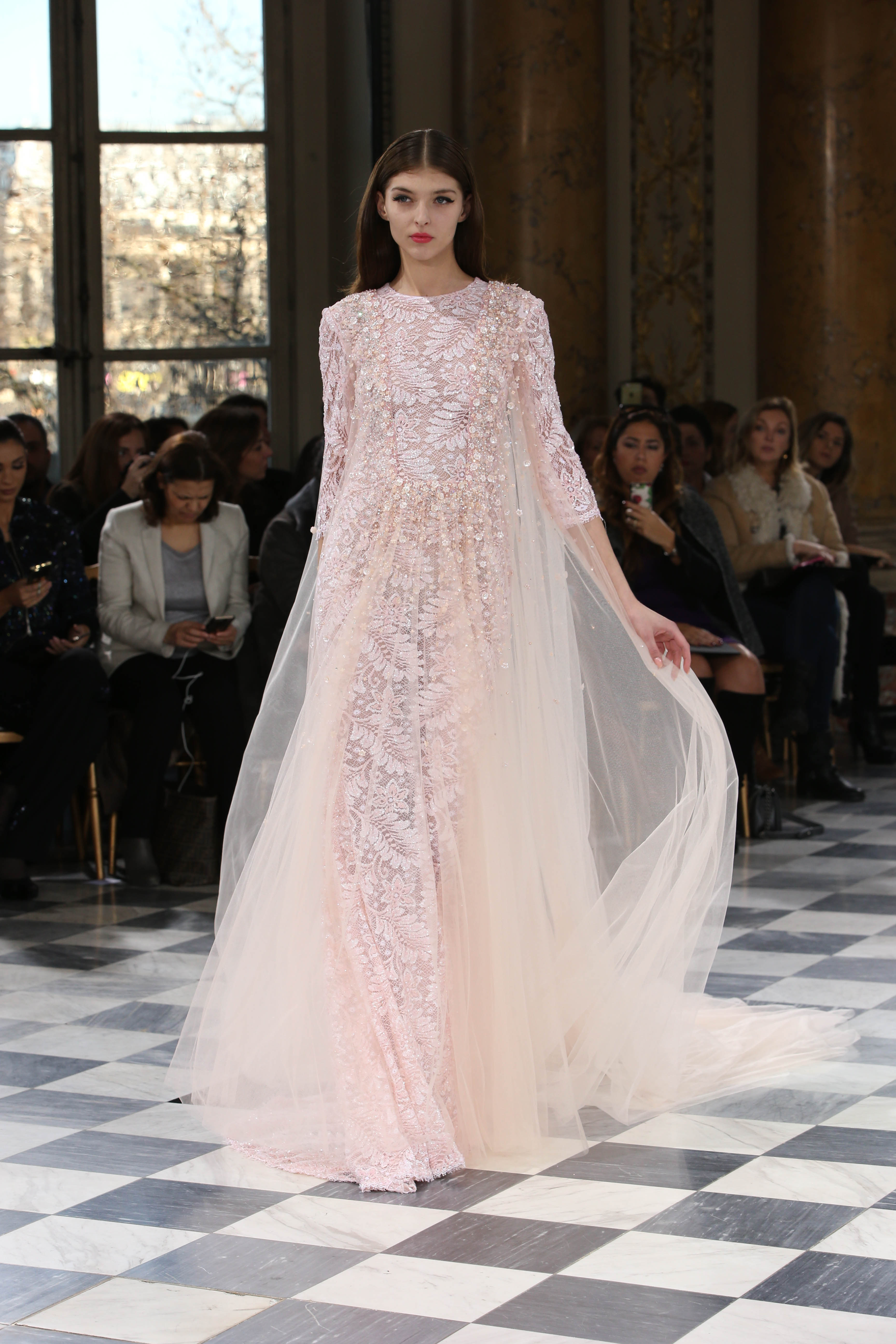 Faisant écho aux créations fondatrices de la Maison, un florilège de motifs floraux s’épanouit sur des broderies lumineuses, des bouquets de cristaux scintillants, des gerbes de couleurs délicates, des aigrettes de paillettes plumeuses, des gouttelettes de perles brillantes, des baies mattes et charnues, pour mieux sublimer les coupes modernes de tenues élégantes et aériennes. Parfois, un motif nid d’abeille – creusé en panneau de dentelle ou directement structuré à-même le tulle – atteste le savoir-faire suprême des ateliers maisons et sublime la noblesse d’une longue silhouette évanescente. La fluidité des capes-traînes exalte la féminité absolue de sculpturales robes fourreaux tandis que les corolles d’une jupe confèrent à un ensemble-tailleur l’espièglerie d’un bouquet en pleine éclosion. Véritable travail d’orfèvre, les accessoires traduisent ces accents bucoliques sur des petits sacs ouvragés ou des bijoux chatoyants somptueusement émaillés.
