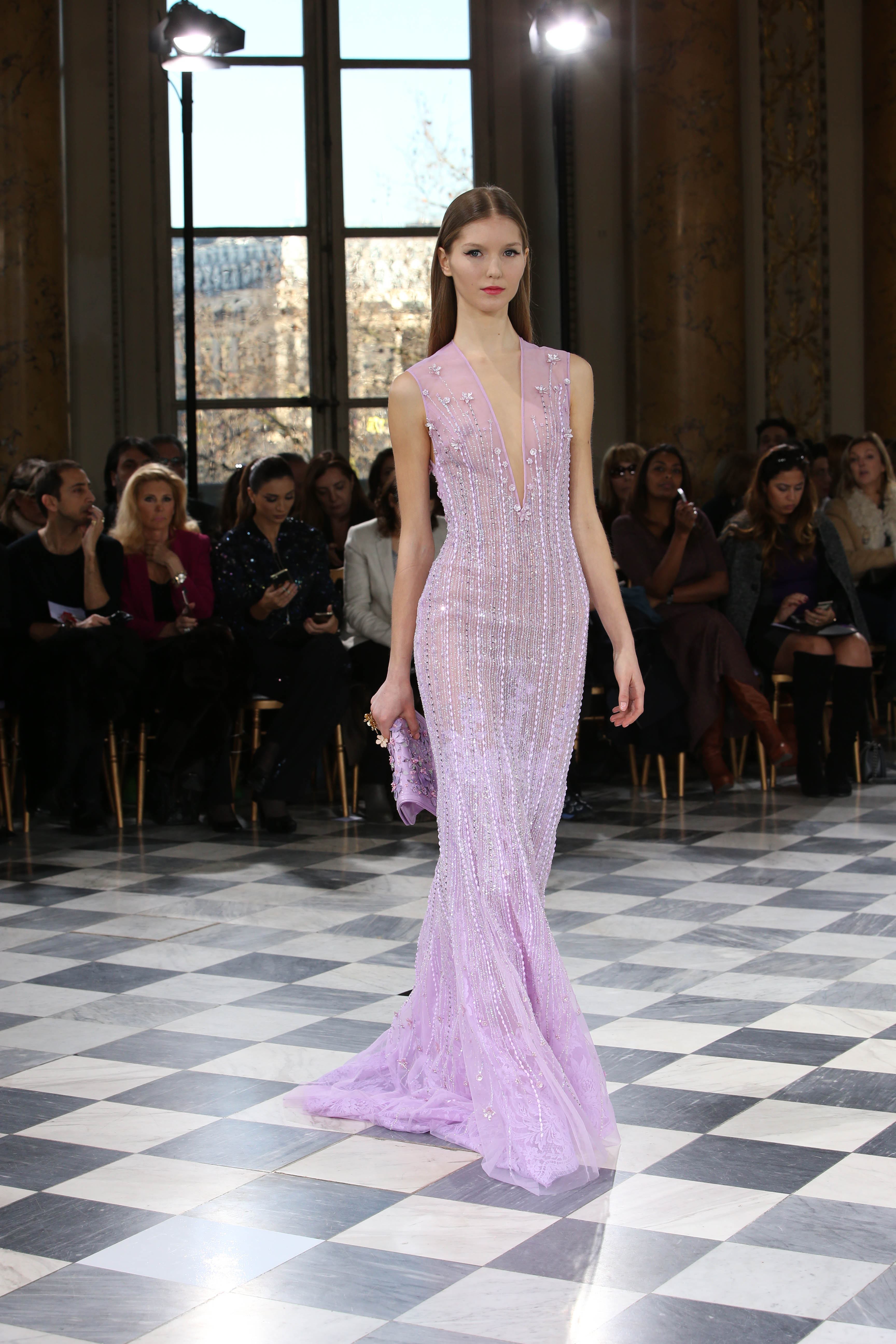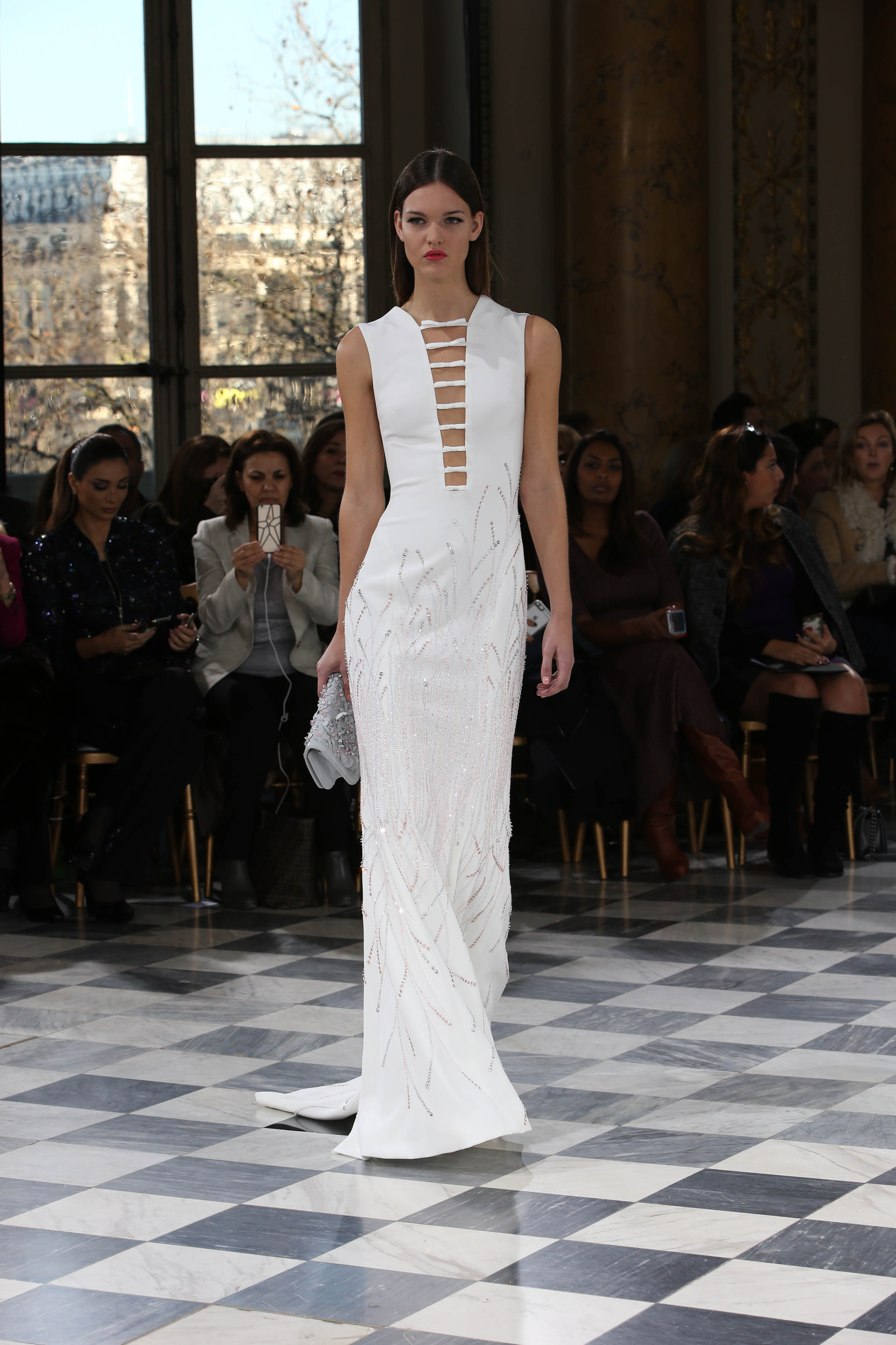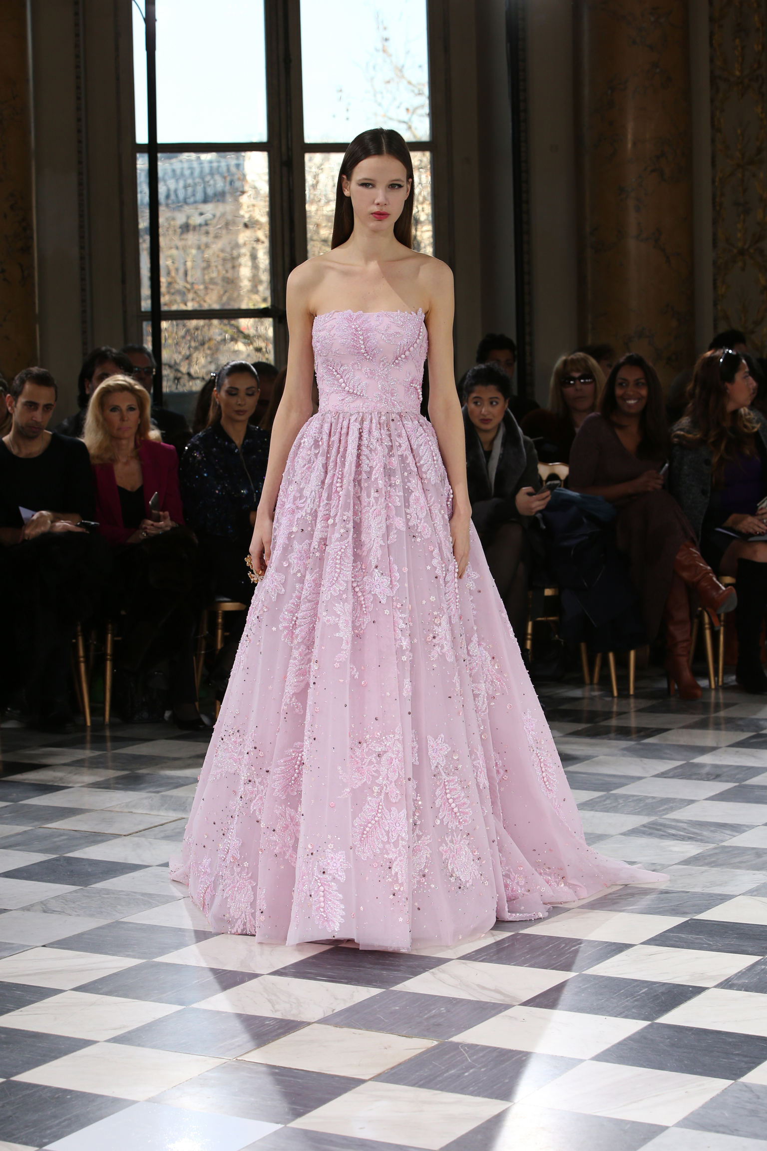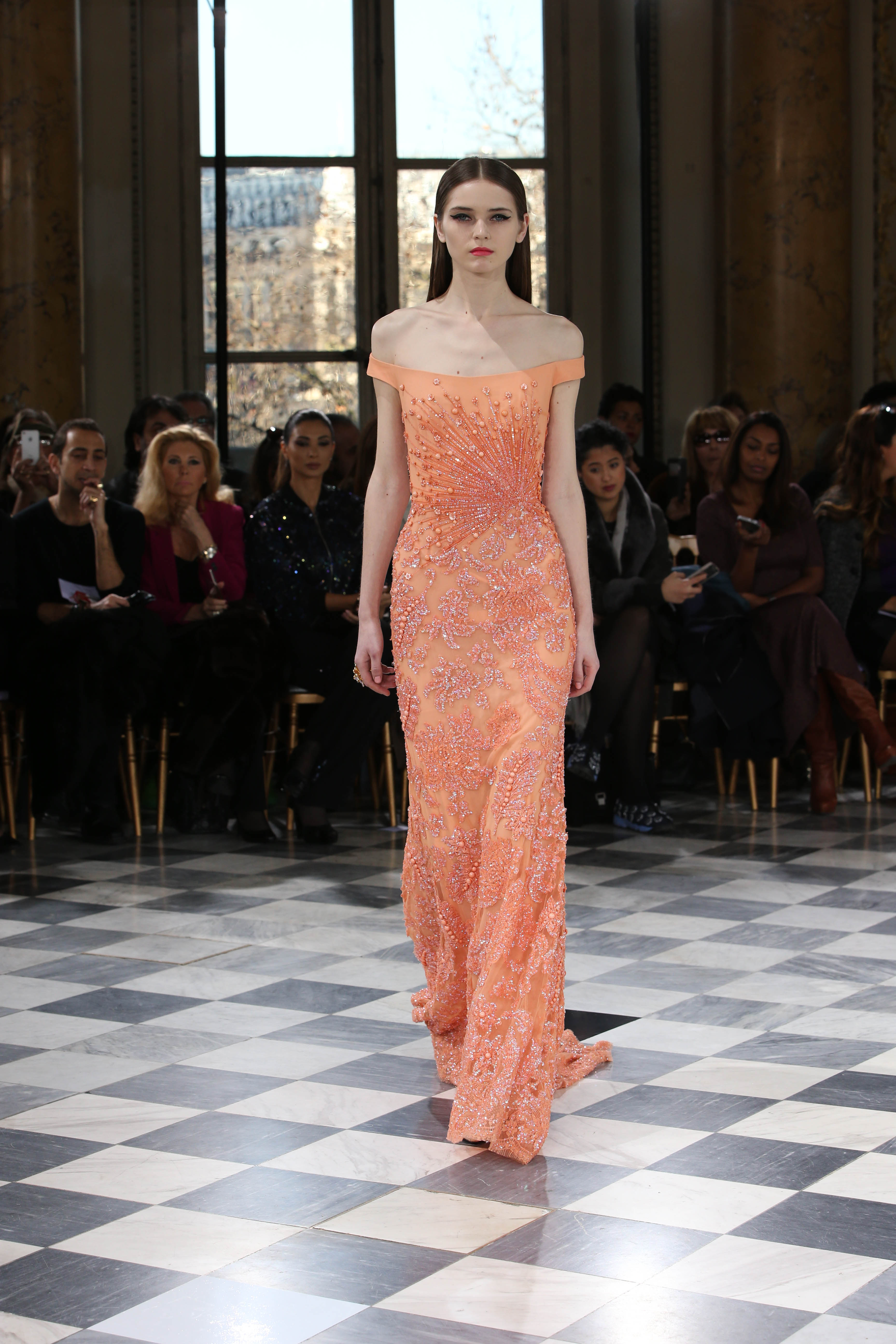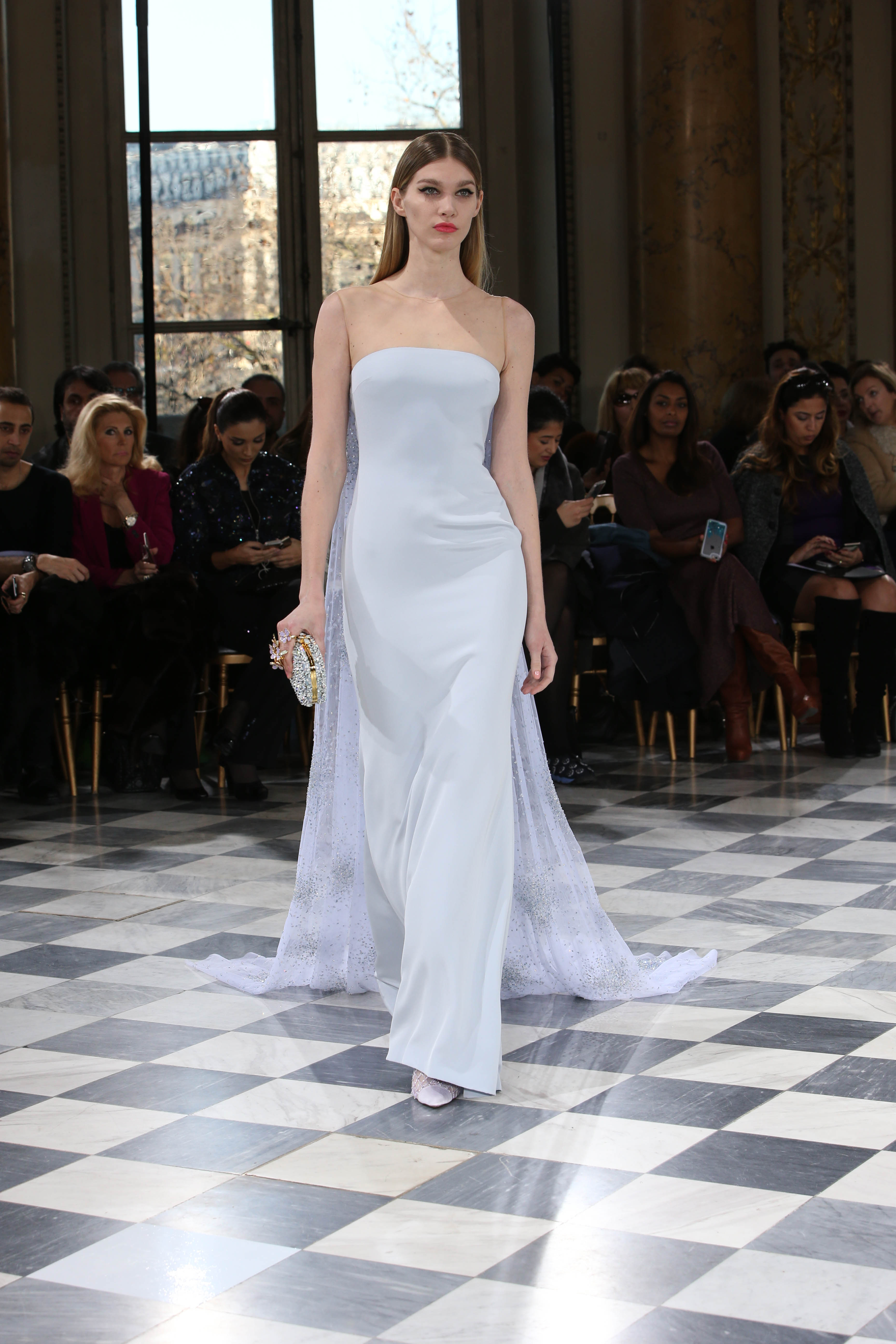 Faisant écho aux créations fondatrices de la Maison, un florilège de motifs floraux s’épanouit sur des broderies lumineuses, des bouquets de cristaux scintillants, des gerbes de couleurs délicates, des aigrettes de paillettes plumeuses, des gouttelettes de perles brillantes, des baies mattes et charnues, pour mieux sublimer les coupes modernes de tenues élégantes et aériennes. Parfois, un motif nid d’abeille – creusé en panneau de dentelle ou directement structuré à-même le tulle – atteste le savoir-faire suprême des ateliers maisons et sublime la noblesse d’une longue silhouette évanescente. La fluidité des capes-traînes exalte la féminité absolue de sculpturales robes fourreaux tandis que les corolles d’une jupe confèrent à un ensemble-tailleur l’espièglerie d’un bouquet en pleine éclosion. Véritable travail d’orfèvre, les accessoires traduisent ces accents bucoliques sur des petits sacs ouvragés ou des bijoux chatoyants somptueusement émaillés.