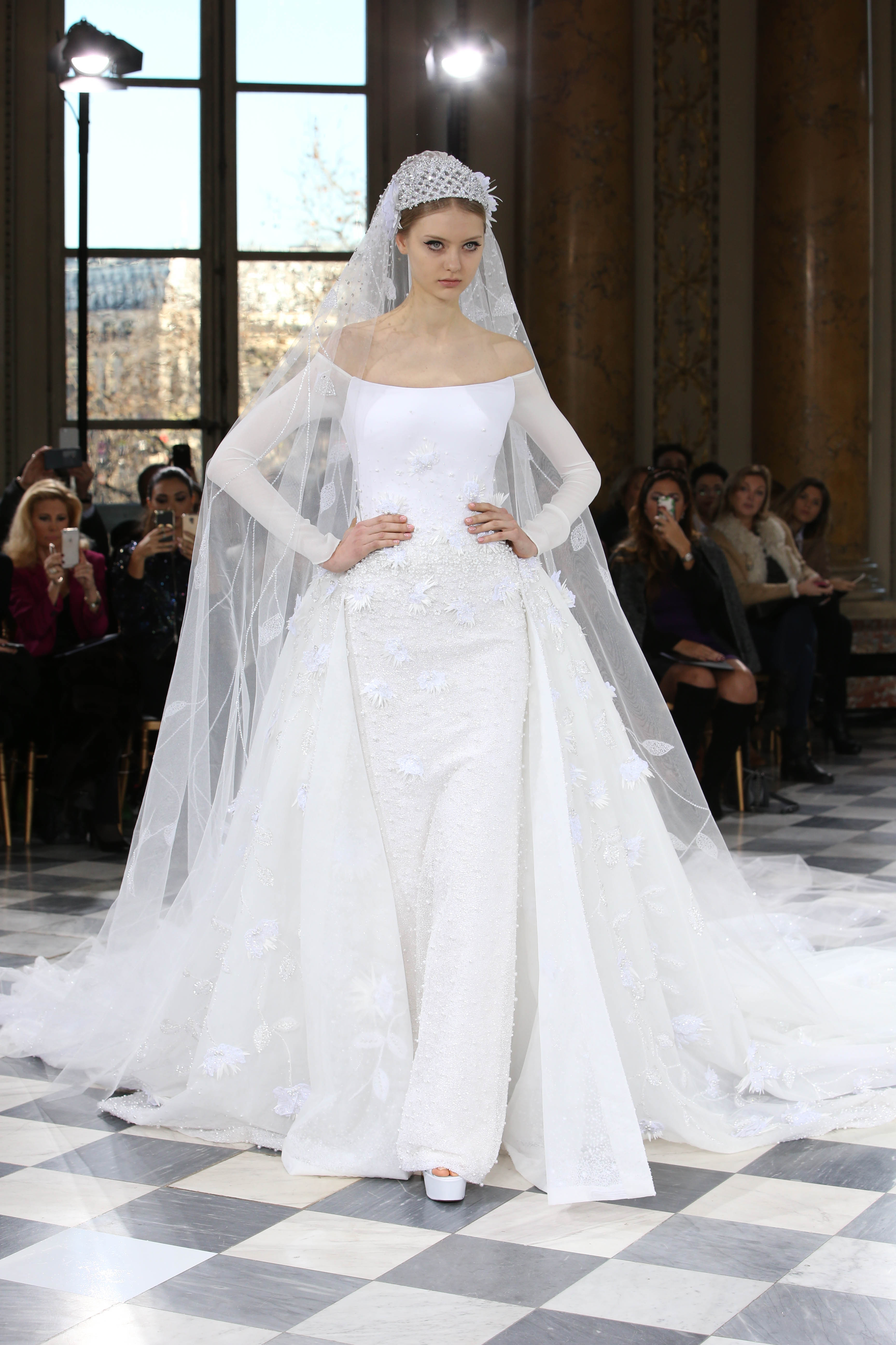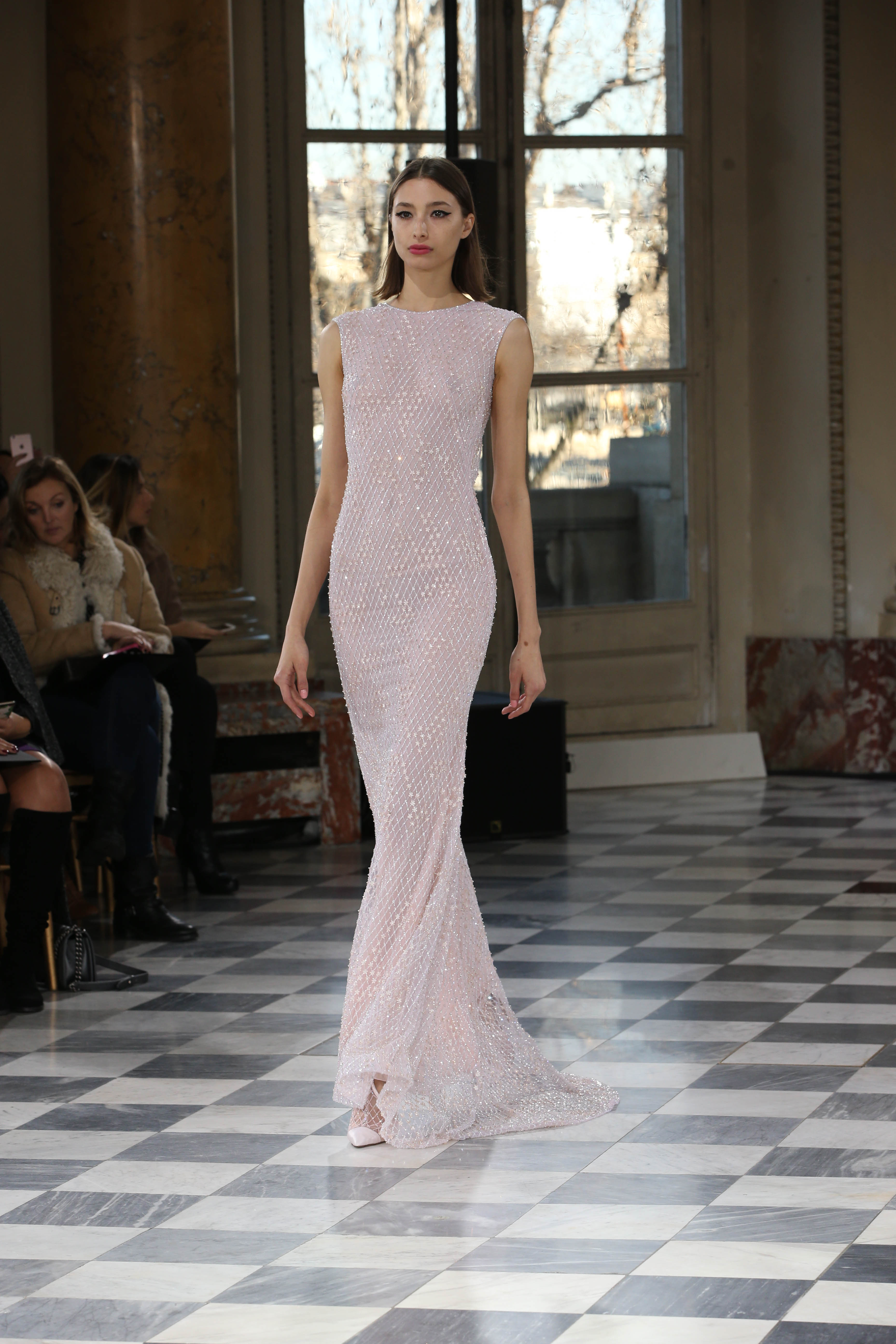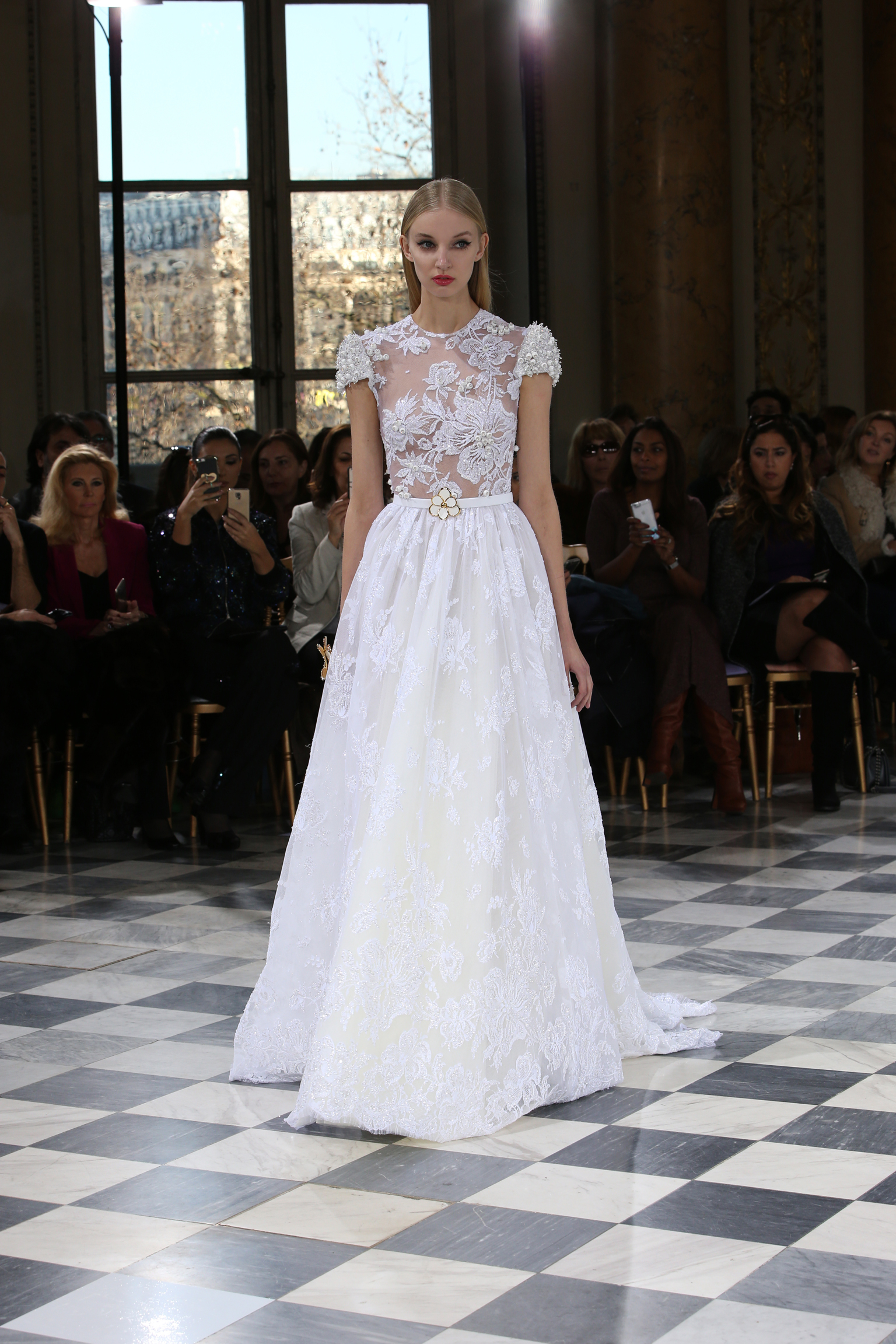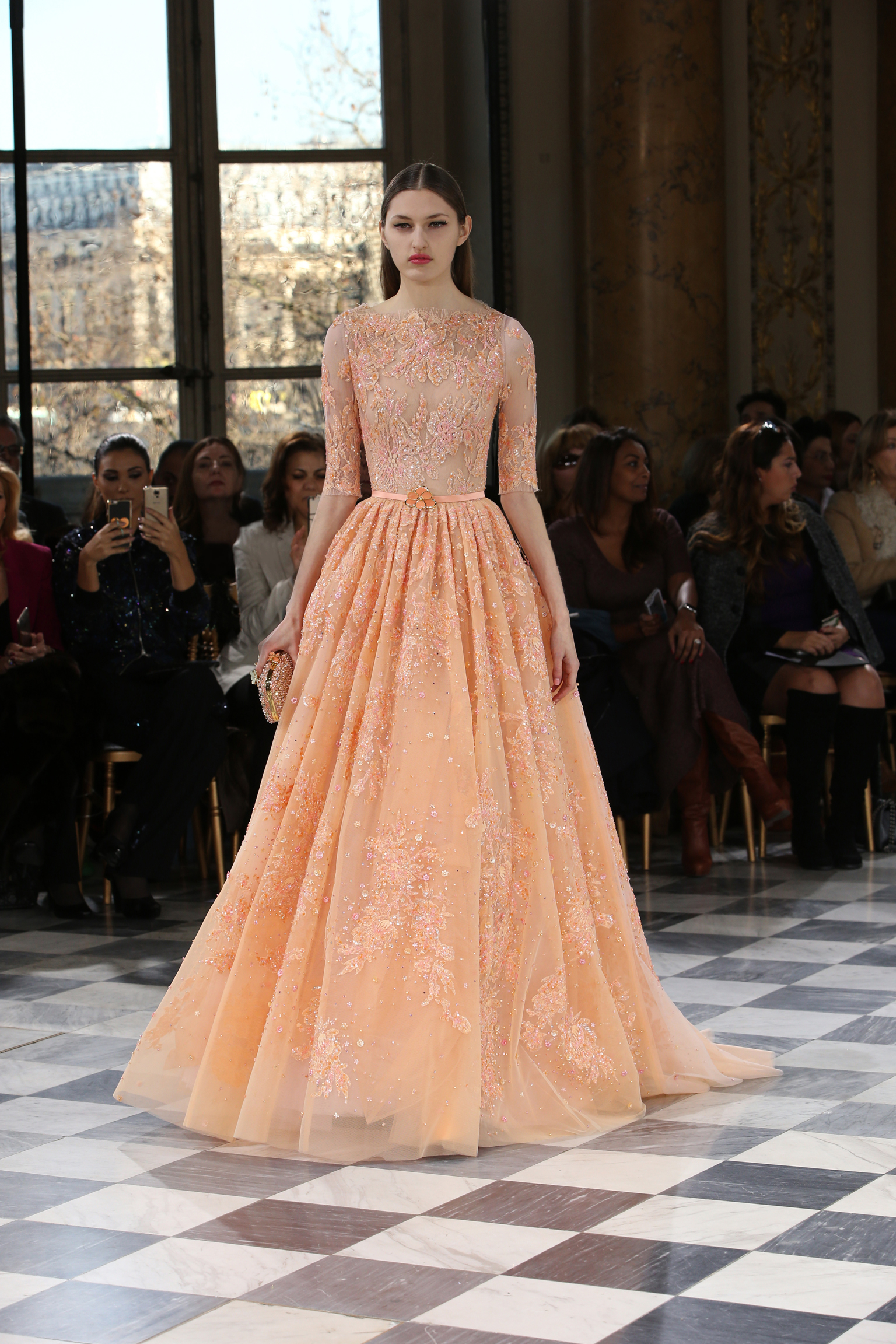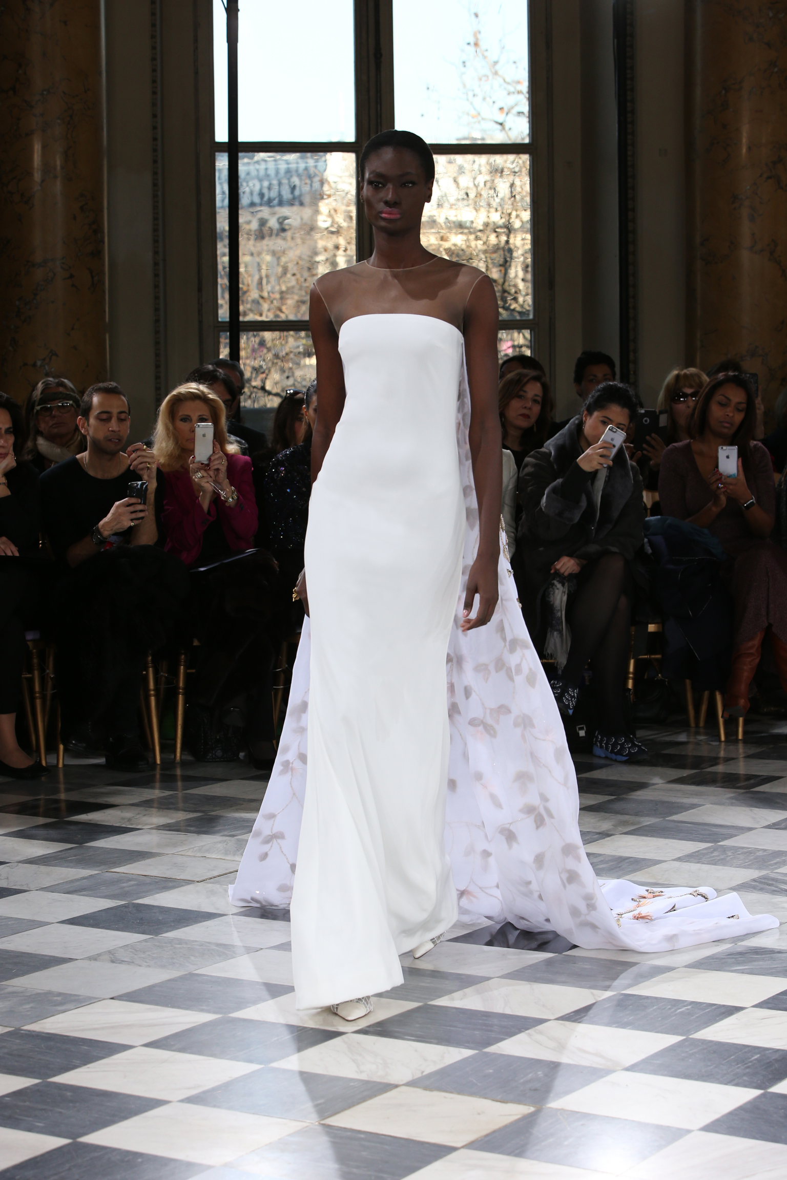 Faisant écho aux créations fondatrices de la Maison, un florilège de motifs floraux s’épanouit sur des broderies lumineuses, des bouquets de cristaux scintillants, des gerbes de couleurs délicates, des aigrettes de paillettes plumeuses, des gouttelettes de perles brillantes, des baies mattes et charnues, pour mieux sublimer les coupes modernes de tenues élégantes et aériennes. Parfois, un motif nid d’abeille – creusé en panneau de dentelle ou directement structuré à-même le tulle – atteste le savoir-faire suprême des ateliers maisons et sublime la noblesse d’une longue silhouette évanescente. La fluidité des capes-traînes exalte la féminité absolue de sculpturales robes fourreaux tandis que les corolles d’une jupe confèrent à un ensemble-tailleur l’espièglerie d’un bouquet en pleine éclosion. Véritable travail d’orfèvre, les accessoires traduisent ces accents bucoliques sur des petits sacs ouvragés ou des bijoux chatoyants somptueusement émaillés.