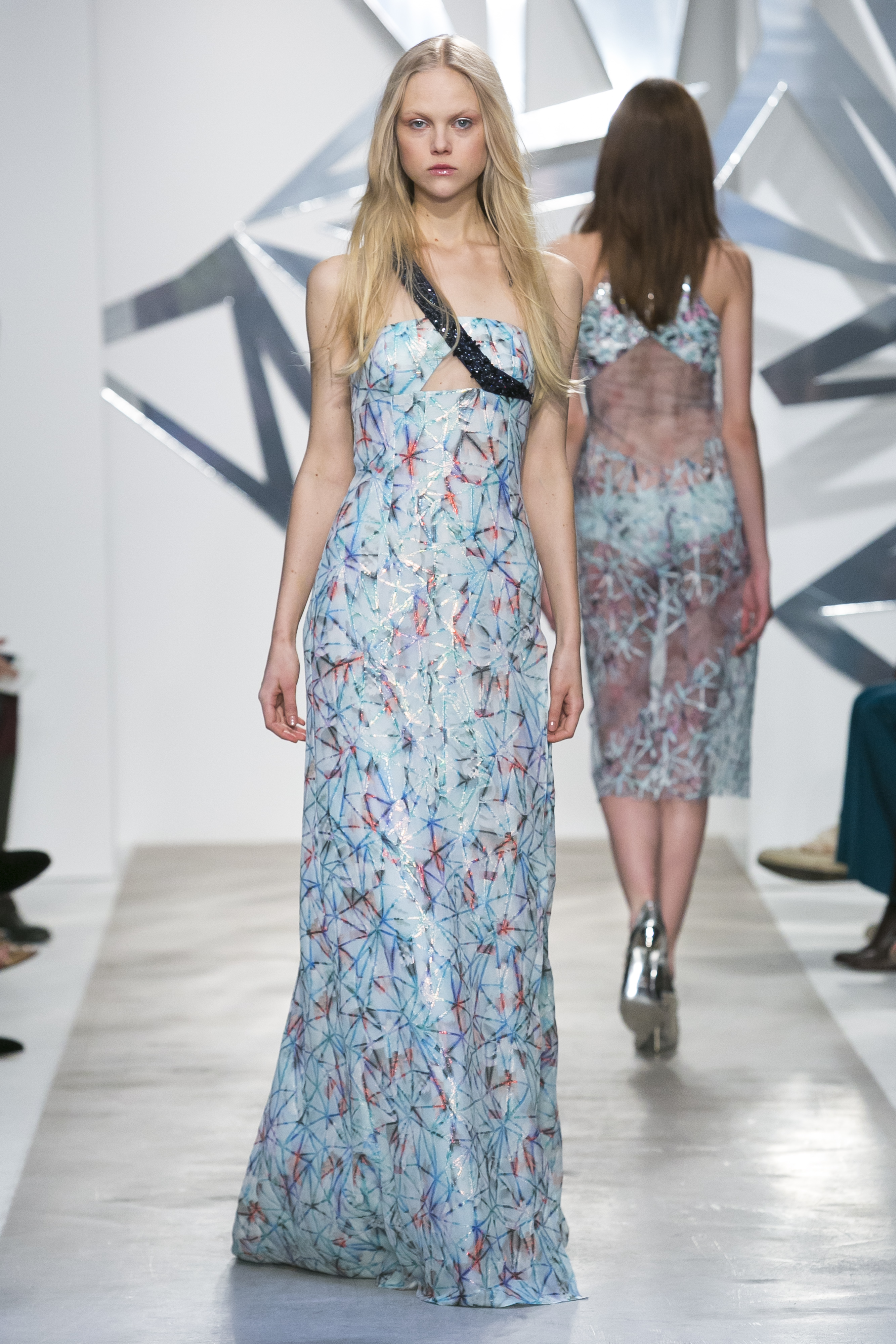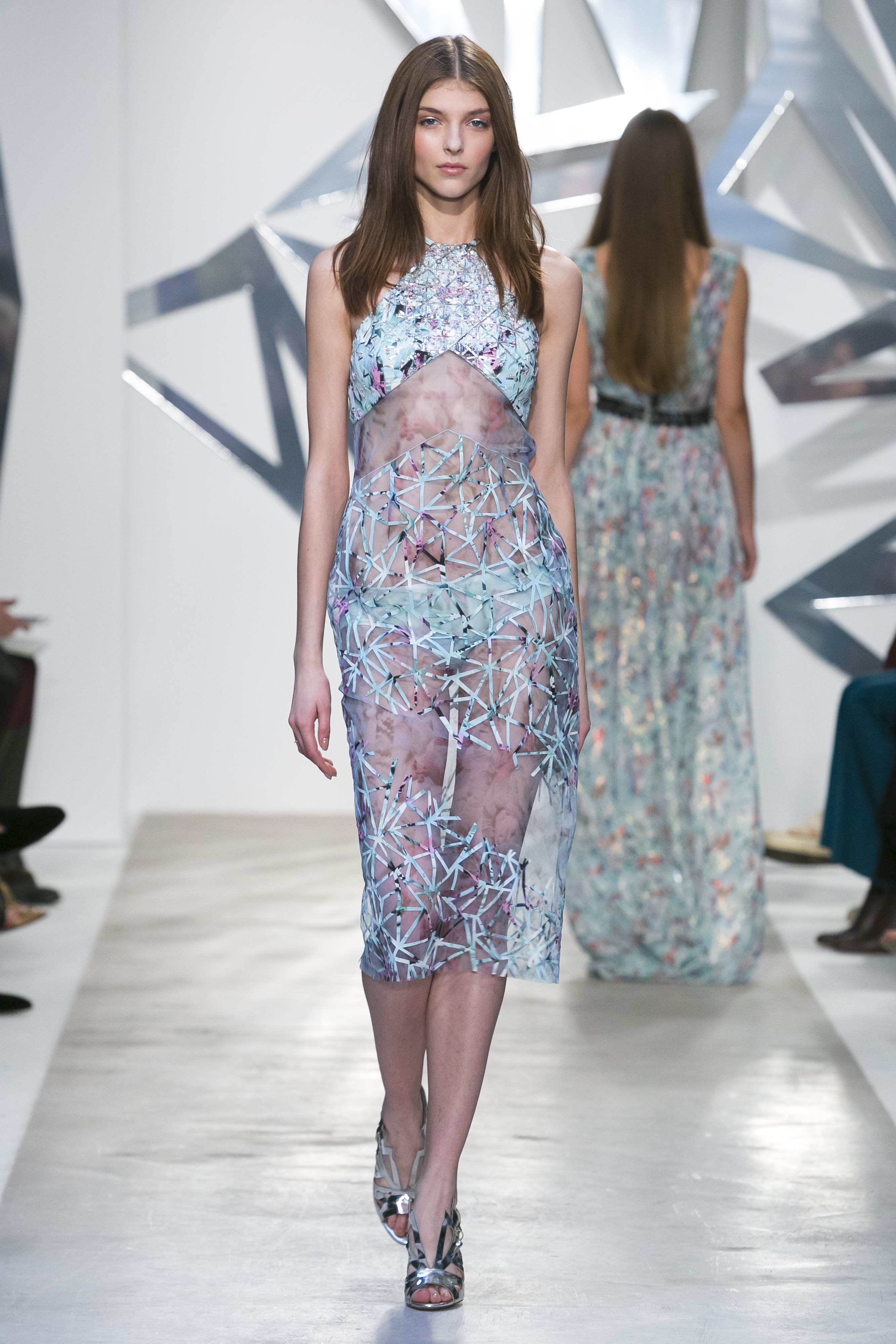 Fil directeur, un imprimé fleuri déstructuré, décliné en plusieurs coloris et répété à l’infini, crée l’illusion d’un kaléidoscope. Dégradé et sublimé sur de l’organza, de la mousseline, de la cotte de maille, du crêpe et de la dentelle, il introduit des jeux géométriques audacieux.