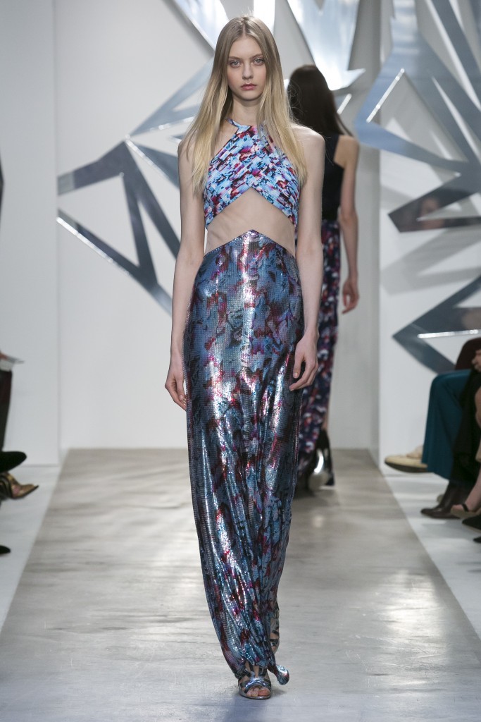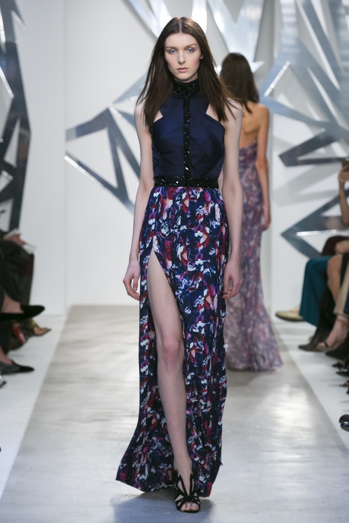 Les pyramides de cristaux, architecturés ou iridescents, parent les jumpsuits, parmi lesquels un modèle en organza noir, animé d’un flocage à ondes kaléidoscope. L’imprimé fleuri est combiné à un bustier coupé plissé bords francs, alliant deux effets géométriques sur une robe courte. Dégradé sur une robe bustier longue, ce même motif floral déstructuré se pare d’une cristallisation géométrique évoquant des gouttes de rosée.