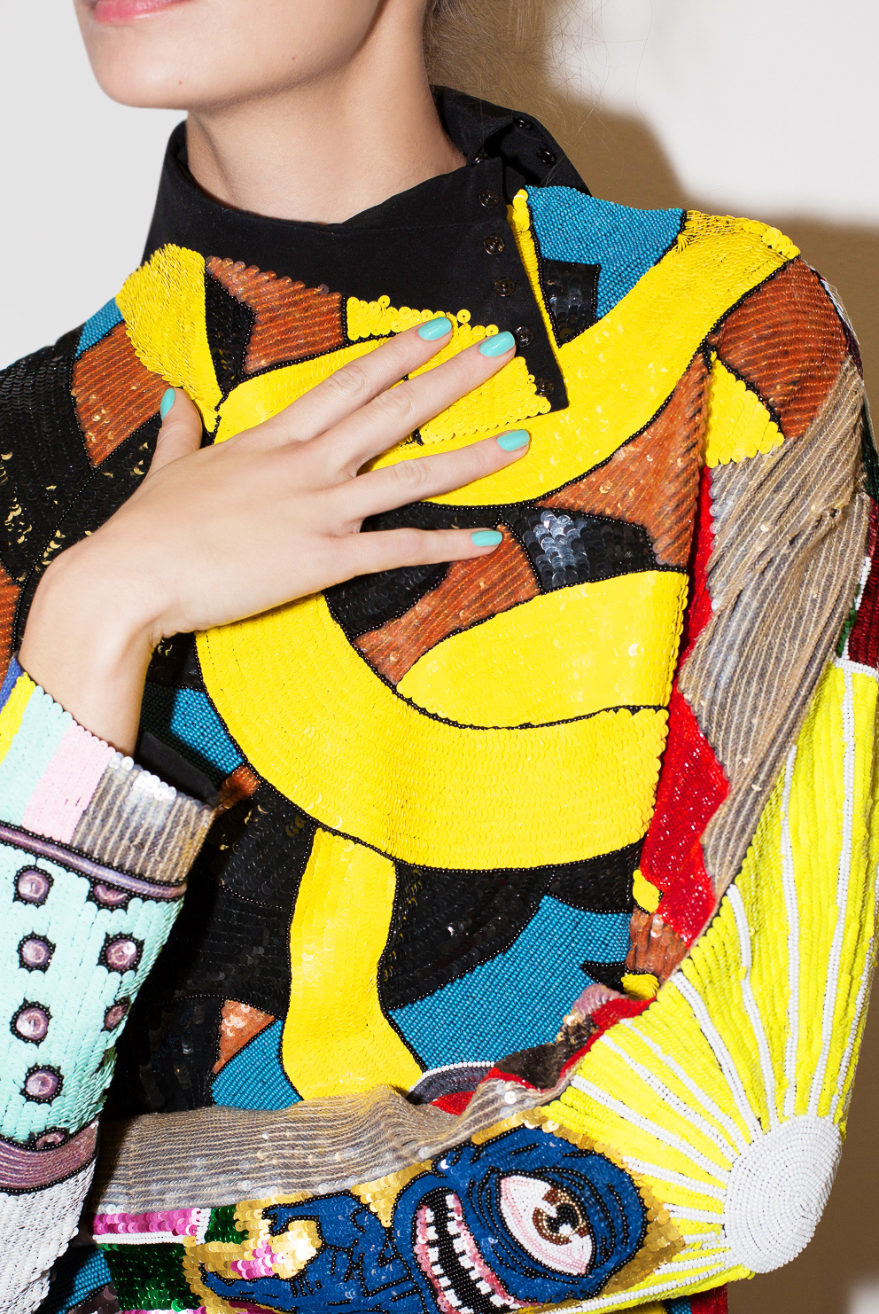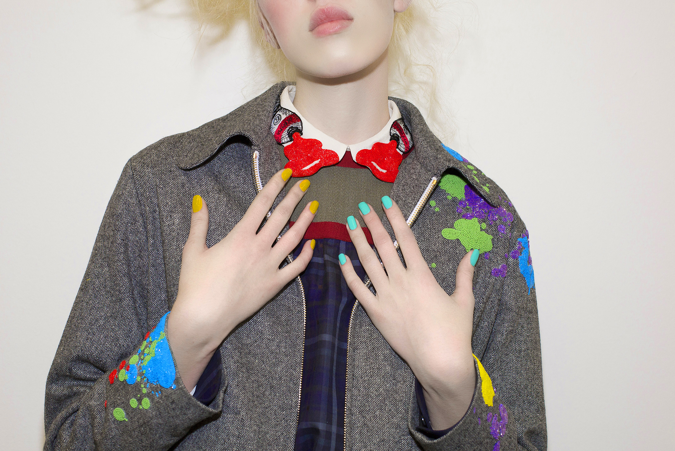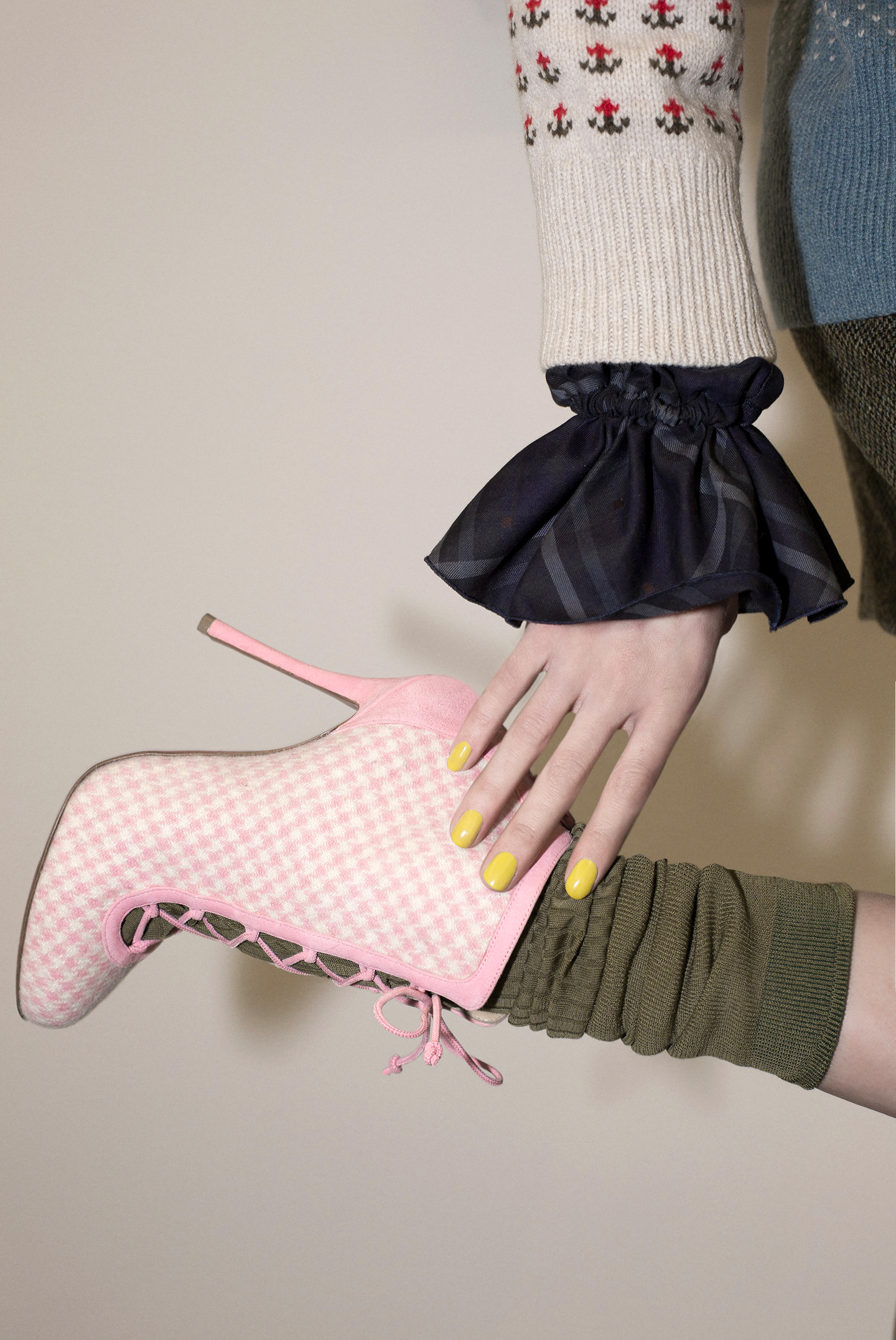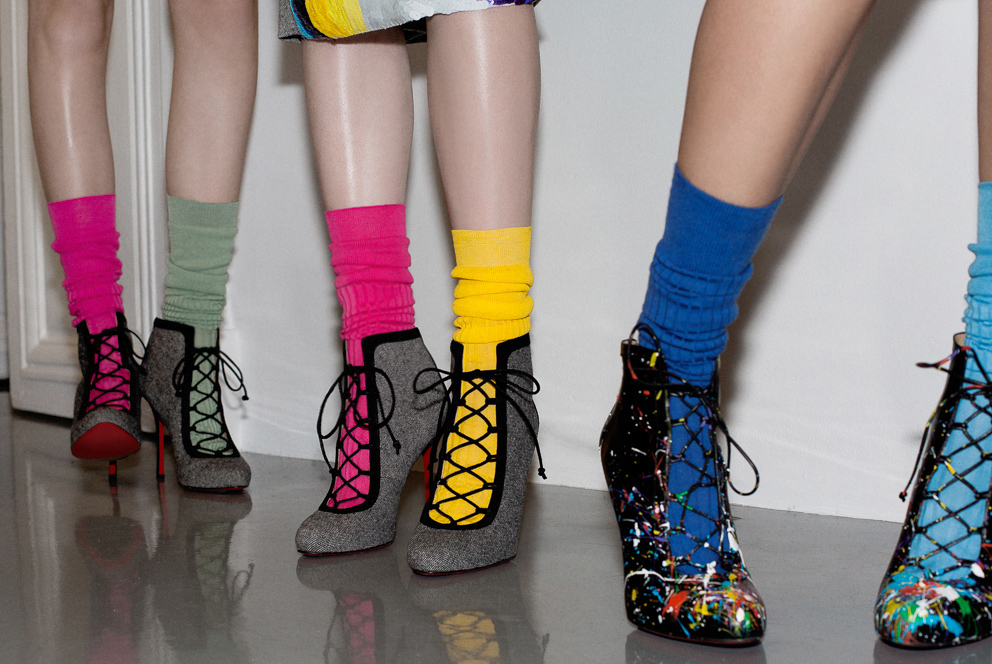 Les souliers Louboutin était pour l’occasion tachetés de peintures multicolores. Le modèle culte Hotero 100, en flanelle ou en vichy, s’accordait avec les chaussettes colorées pour un résultat pop art. Afin de tempérer les tenues les plus kawaï, les Lord Cubano se portait en brun et en noir. Une main aux ongles peint en jaune vitaminé « Mula Lisa », et l’autre en bleu turquoise vibrant » Batignolles » venaient compléter le look.
