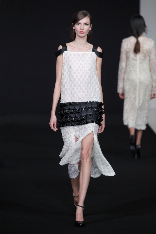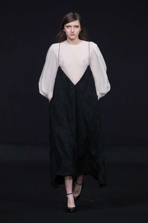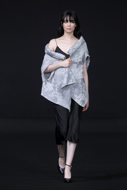 Le créateur a choisi de mettre en avant la délicatesse et l’élégance féminine, à travers des nuances résolument neutres. Du noir, du blanc et du gris ponctués de touches bleu azur et d’imprimés pied de poule, comme pour manifester une perte de contrôle momentanée. De même, les coupes structurées aux tissus rigides laissent parfois place à des parenthèses nonchalantes, avec une veste châle portée négligemment sur les épaules, ou encore un pantalon qui se rabat, comme si de rien n’était.