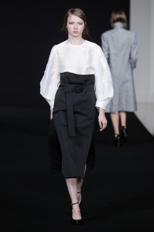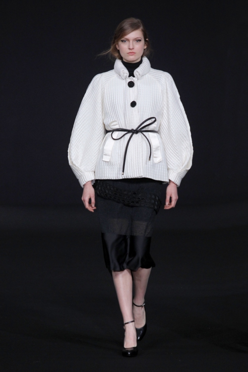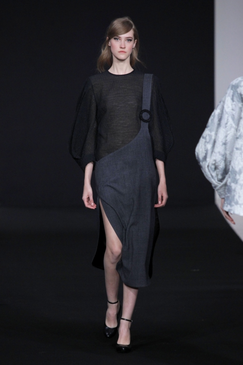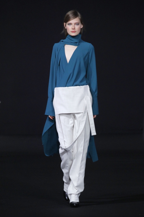 Une architecture du vêtement qui se construit sur deux détails : les volumes façons origami des robes, et l’obsession du cercle. Découpes circulaires, anneaux décoratifs, boucles formées par les ceintures… le rond est roi. Un arrondi qui se retrouve dans les manches, les boutons et les cols des manteaux, mais aussi en détail subtil sur les épaules.