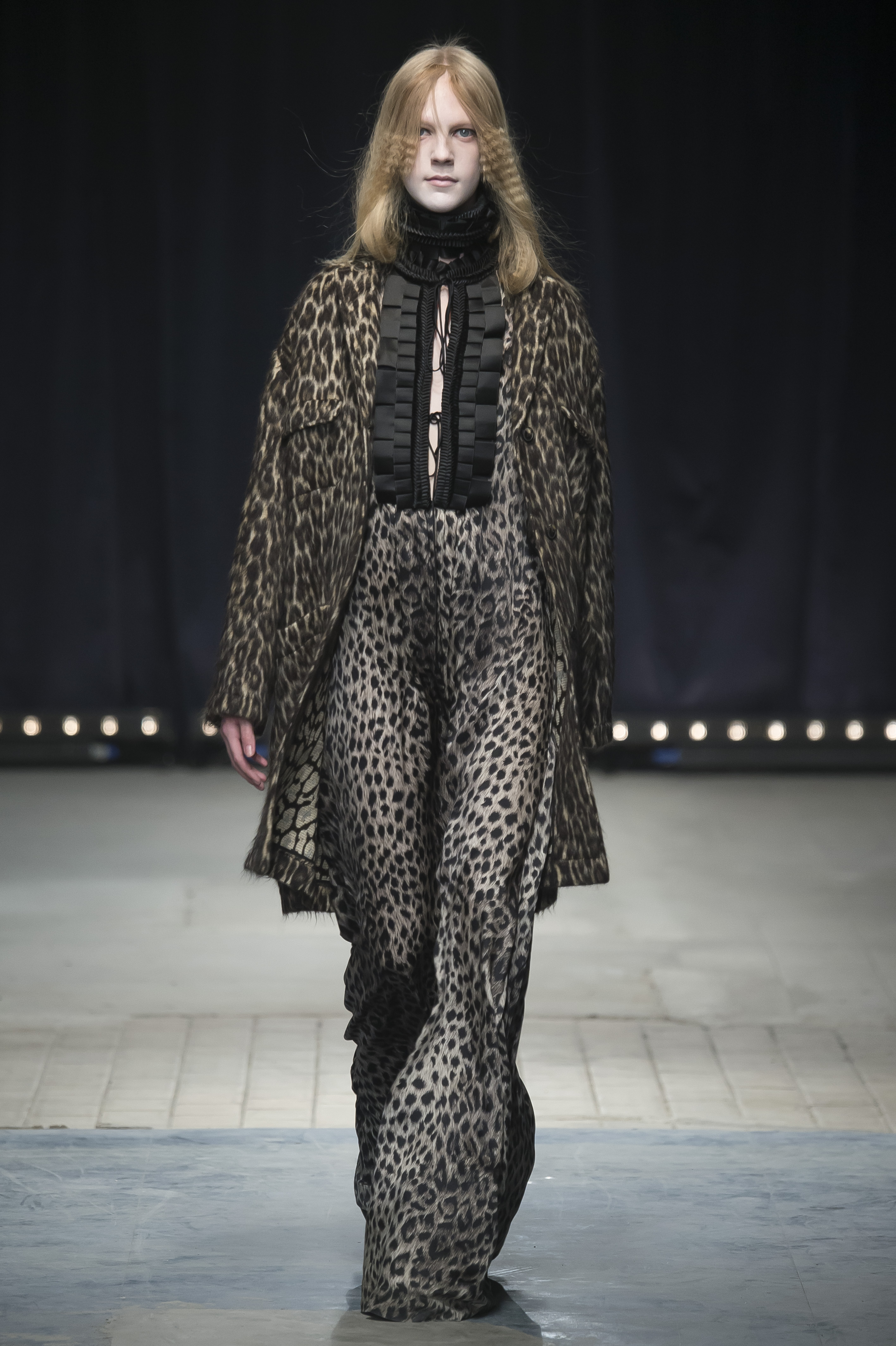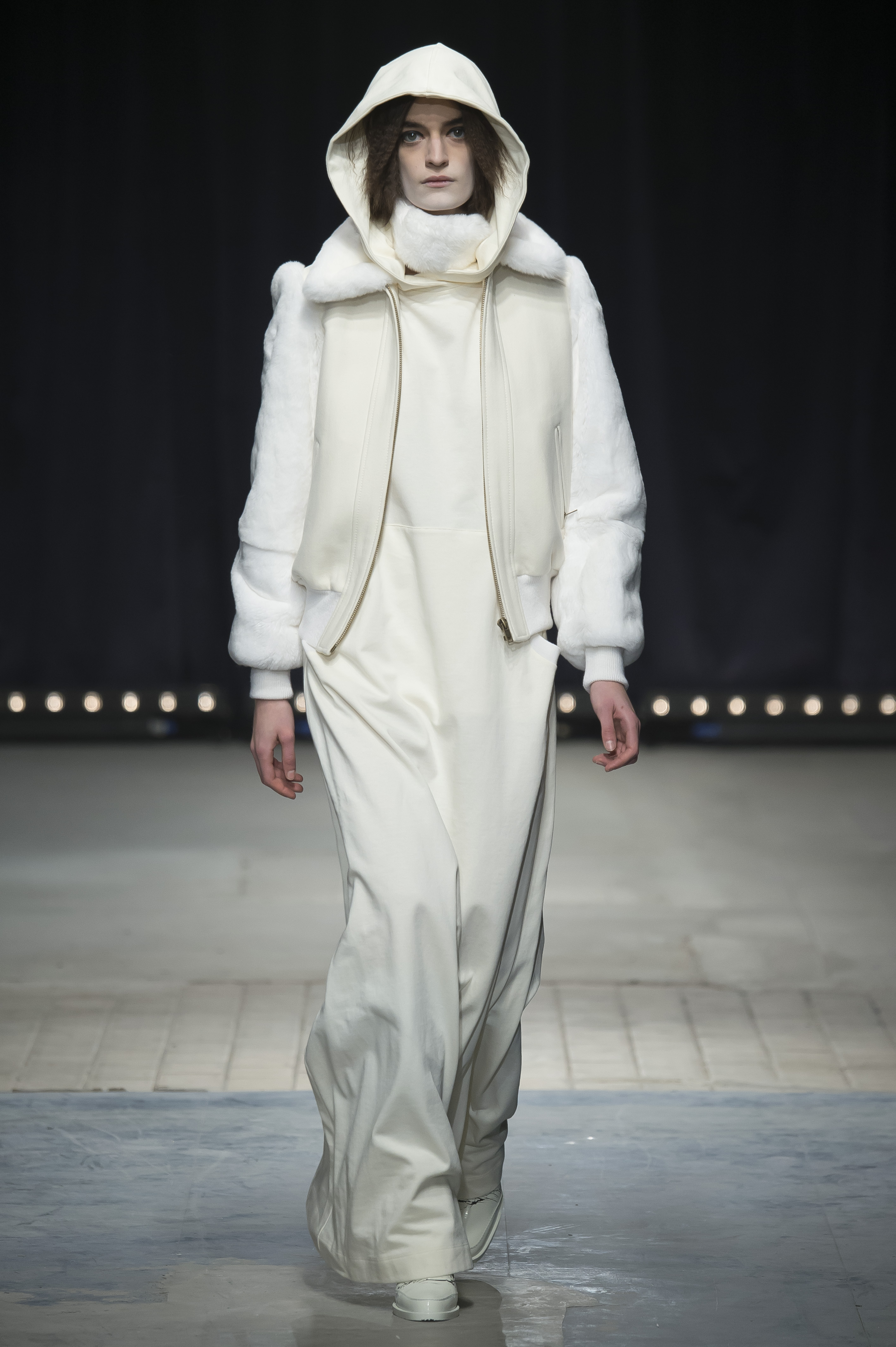 Les robes austères, aux tonalités sombres, presque poussiéreuses, sont pourtant loin d’être sinistres. Elles  se découpent dans du plumetis sensuel, du velours lisse et des paillettes glamours. Le parti pris du mélange des genres se retrouve dans le choix des vestes. Parka fourrée, blazers à carreaux, manteaux léopards poilus et même blousons  à capuche sportwears,  se rejoignent pour célébrer une conception singulière et  efficace des tendances.