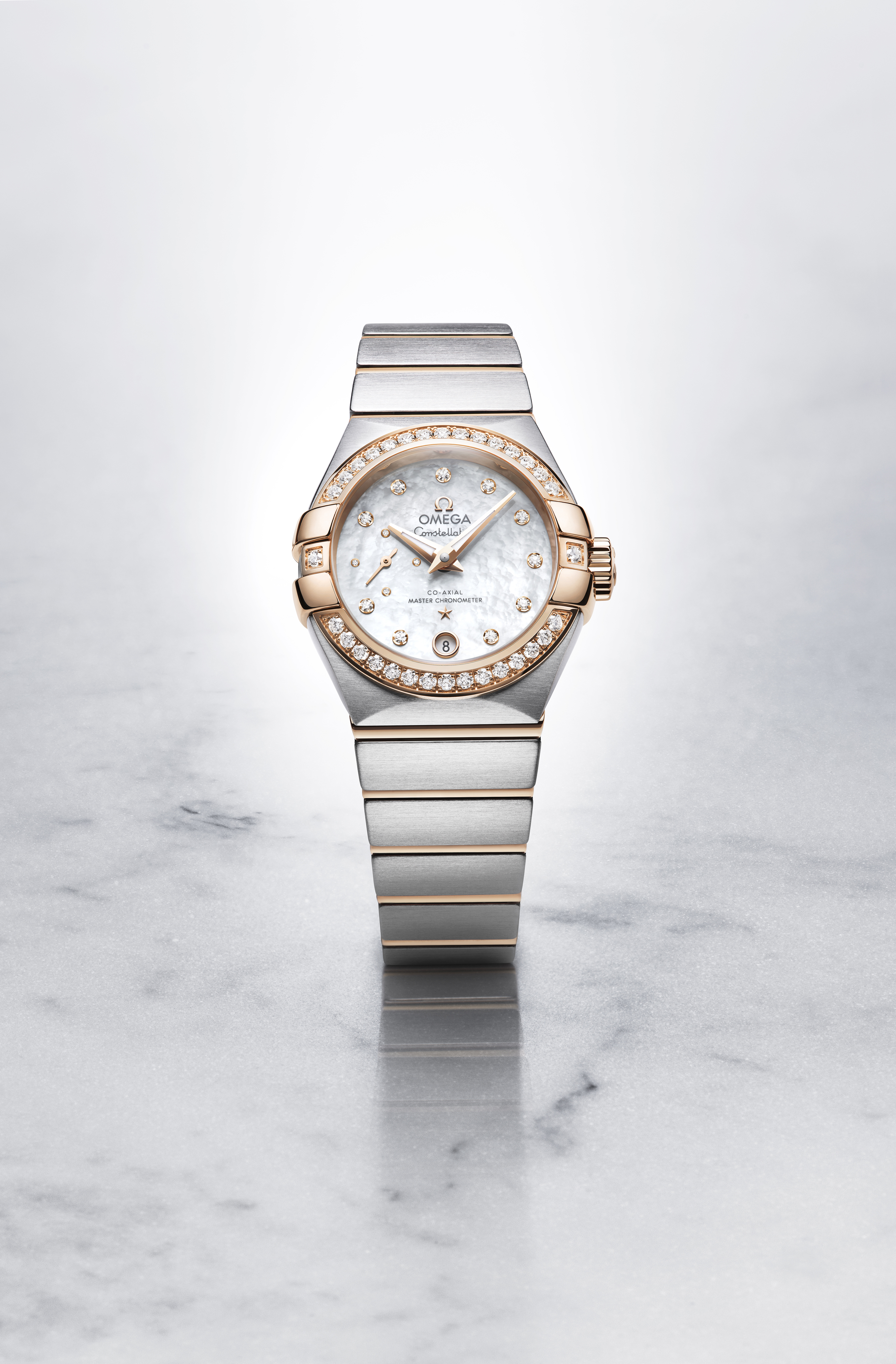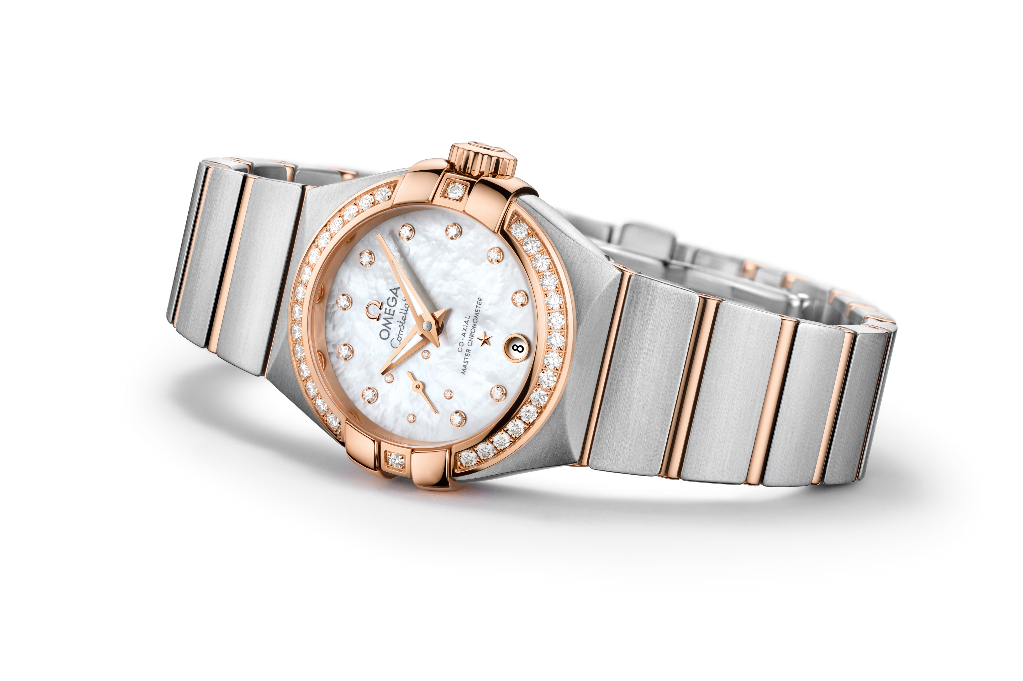 Côté design, il est clair qu’OMEGA a conservé nombre des traits ayant contribué à la popularité des récents modèles Constellation. La combinaison d’acier inoxydable et d’or rouge 18K confère un style chaleureux, sublimé par la douceur du cadran en nacre blanche, à la fois simple et élégant. Parmi les nouveautés, on remarquera également la lunette pavée de diamants ainsi que le fond en verre saphir qui permet d’admirer le calibre Master Chronometer 8704.