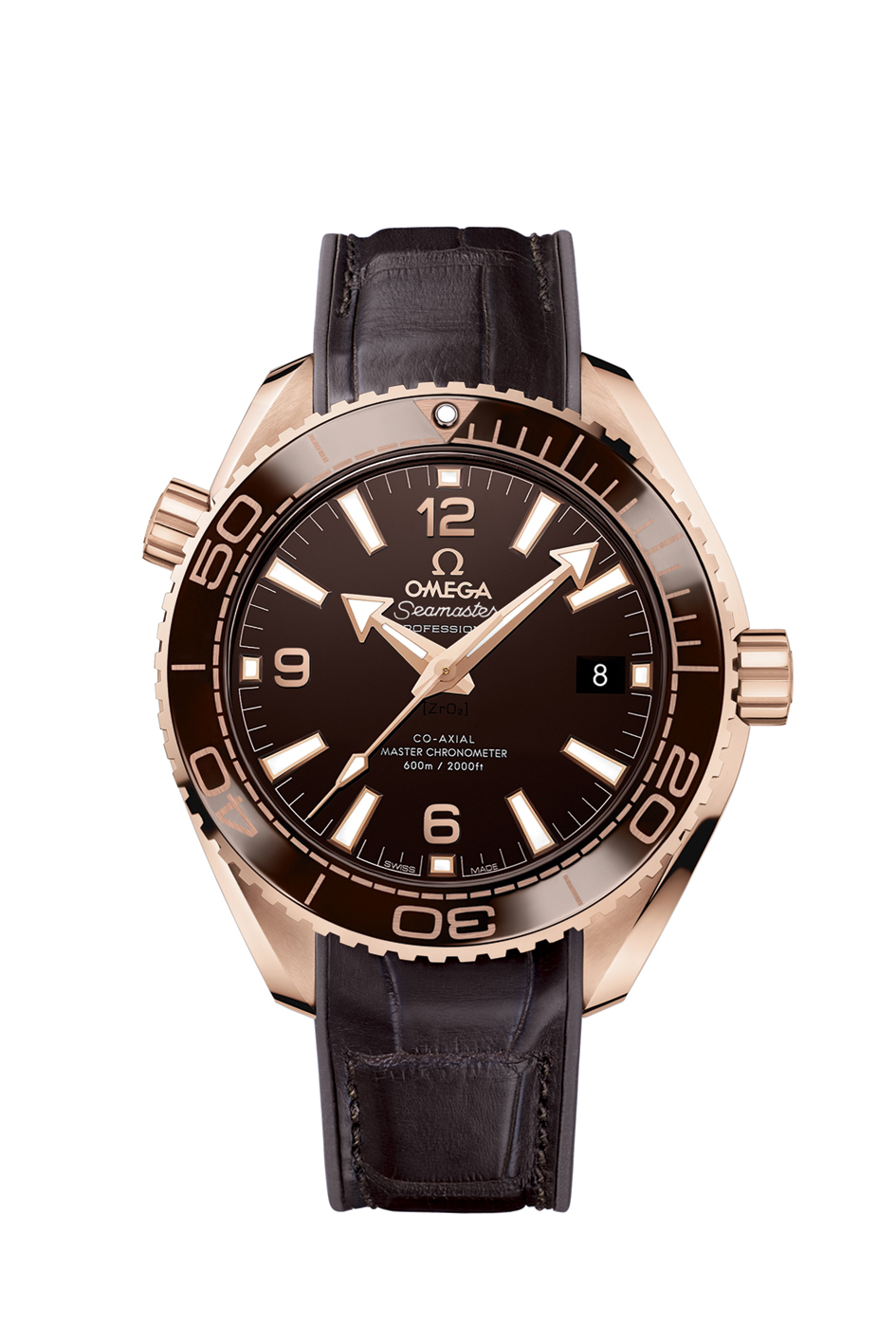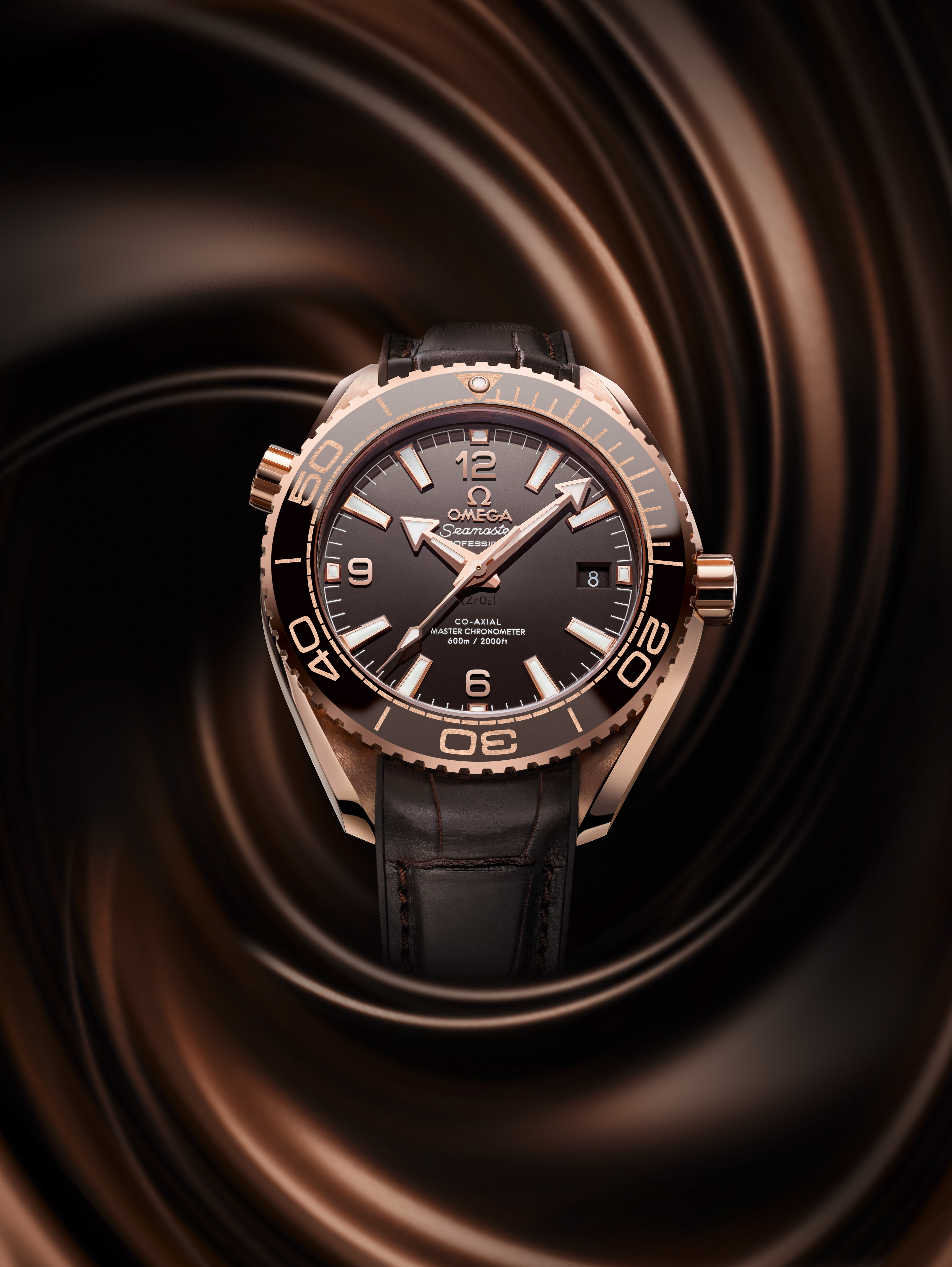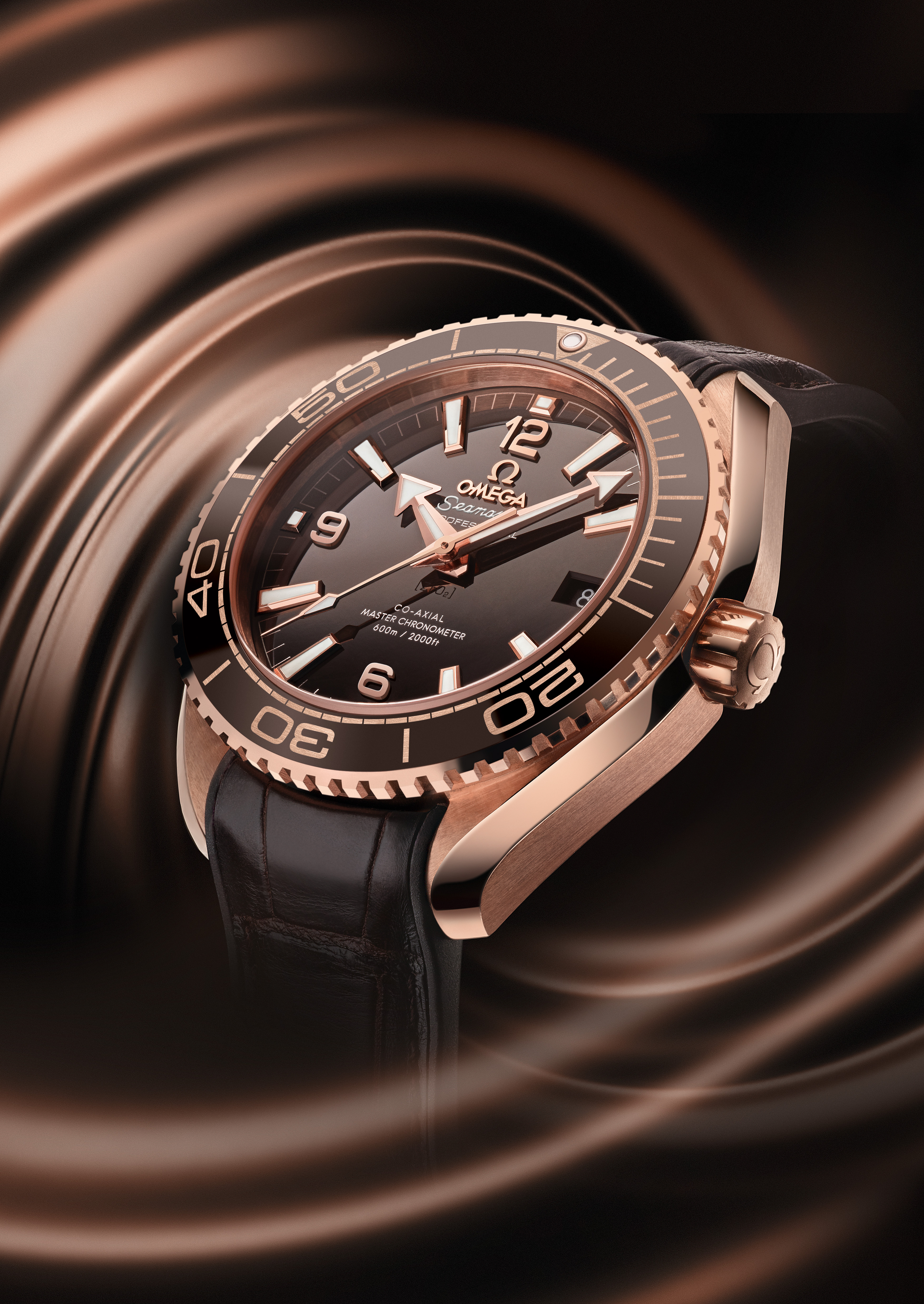 Pour créer une harmonie parfaite avec les teintes rougeoyantes de ce métal, OMEGA a créé un cadran et une lunette en céramique couleur chocolat. À la fois opulente et séduisante, cette couleur dévoile une nouvelle facette de la collection Planet Ocean. Sur la lunette, c’est la technologie OMEGA Ceragold™ qui a été utilisée pour créer les chiffres et les nouveaux index des minutes sur l’échelle de plongée.