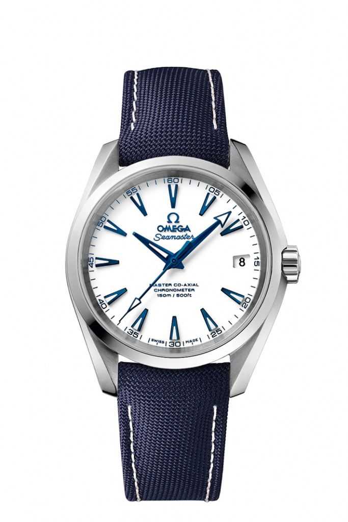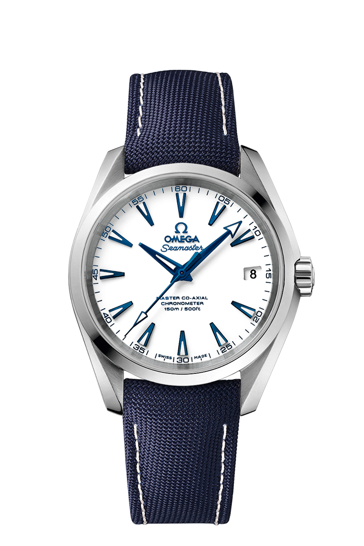 Façonnée en titane grade 5, la robuste Aqua Terra « GoodPlanet » se distingue par ses couleurs évocatrices de l’océan. On retrouve ses tons bleutés sur les index appliqués, le logo OMEGA et les aiguilles facettées, disposés sur un cadran blanc laqué. À l’inverse des autres modèles Aqua Terra, cette montre est dépourvue du motif « teck » caractéristique de la collection.
