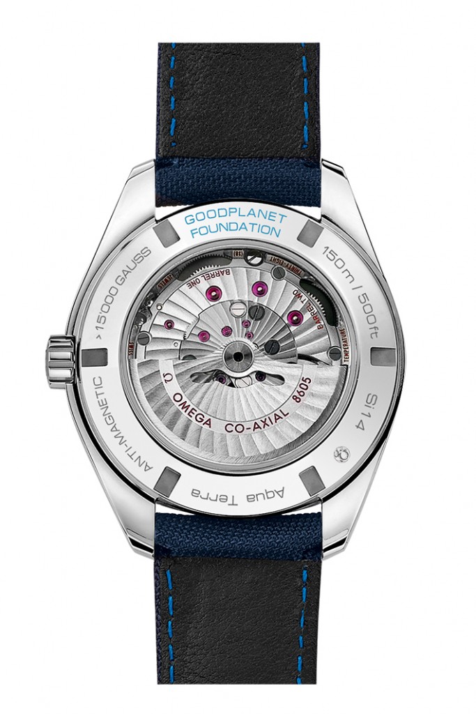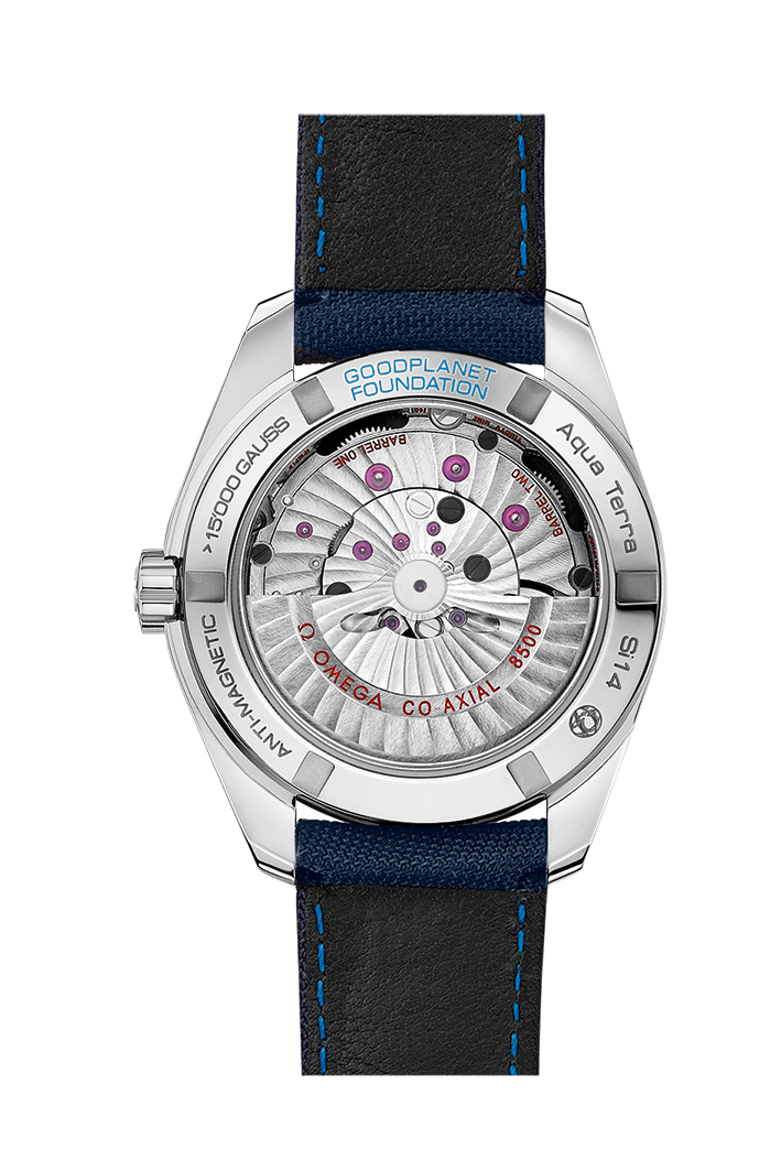Sur ces montres, le mouvement est visible à travers le fond, doté d’un verre saphir bombé résistant aux rayures. Le fond est également gravé de l’inscription « GOODPLANET FOUNDATION » en bleu verni.
