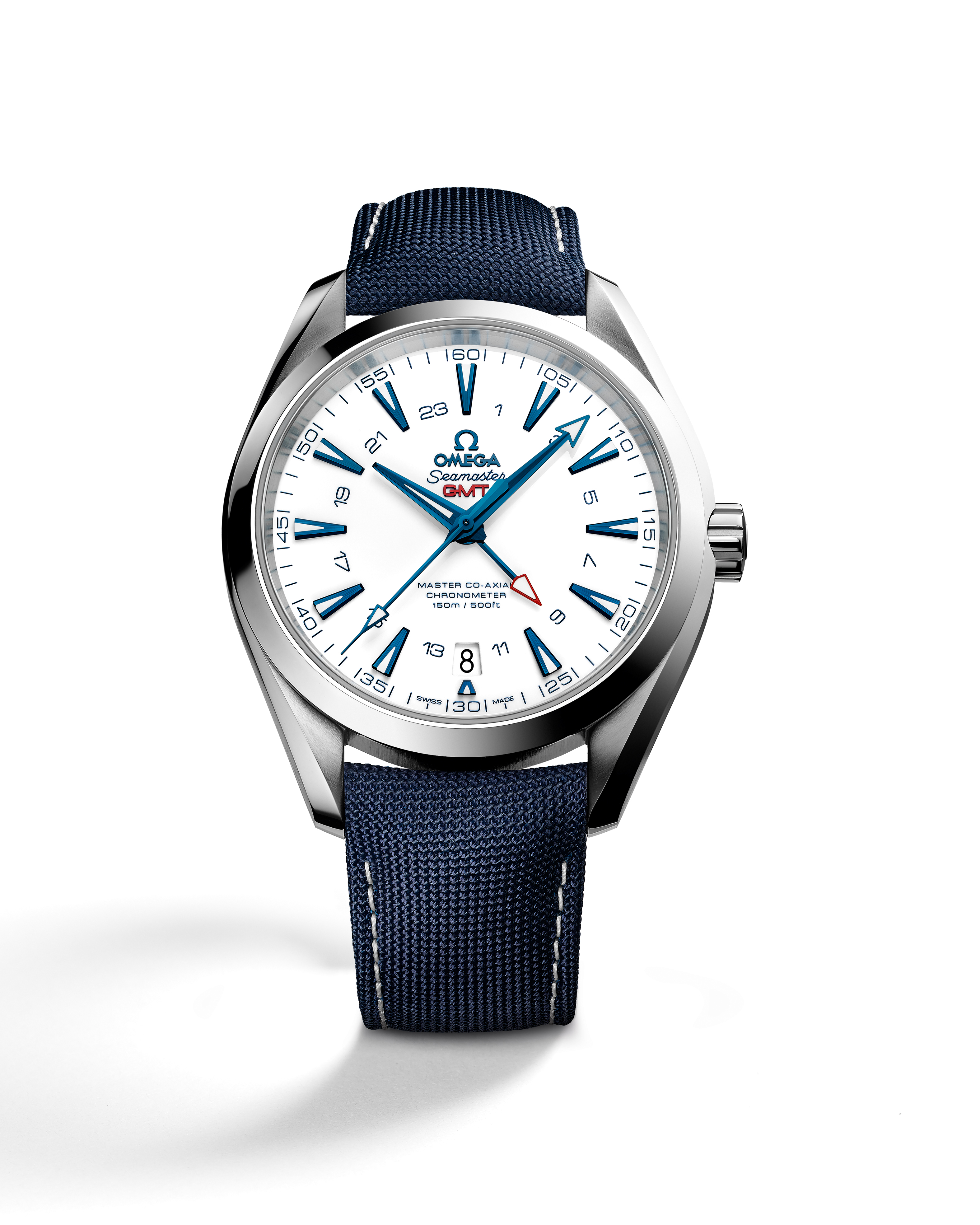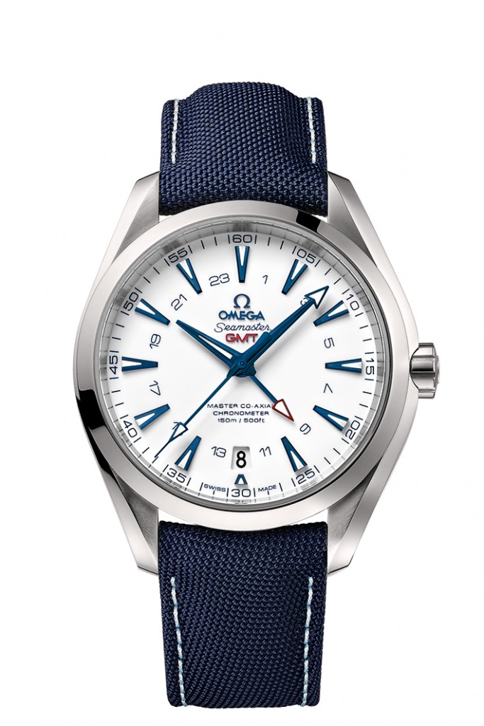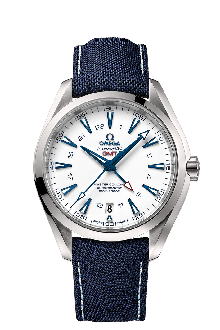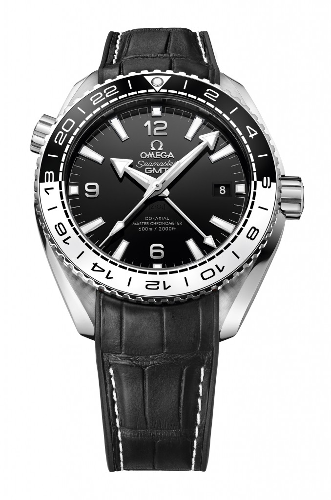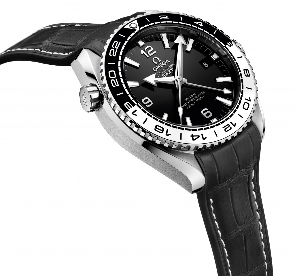 Sur le modèle 43 mm, animé par le calibre OMEGA Master Co-Axial 8605, le cadran dispose d’un affichage GMT 24 heures assorti d’une aiguille GMT pourvue d’une pointe rouge, pour aider l’utilisateur à suivre plusieurs fuseaux horaires simultanément. On remarque également le guichet dateur à 6 heures.