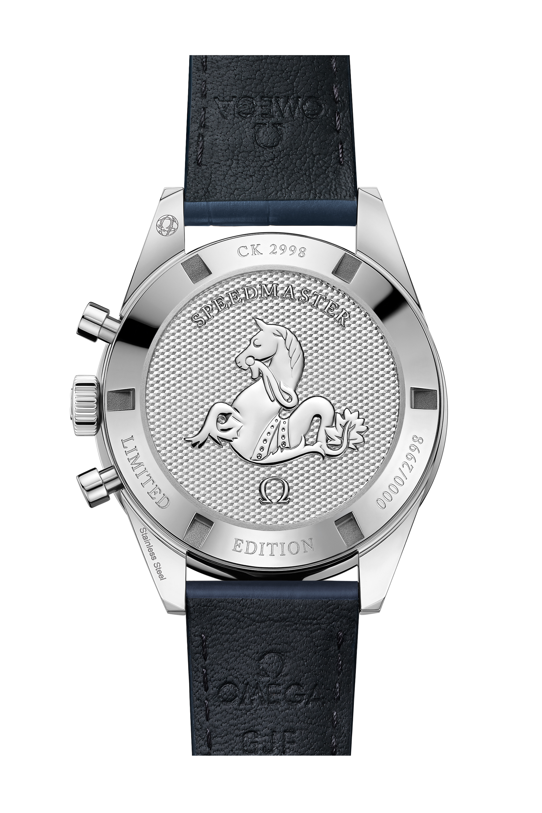 Seulement 2 998 exemplaires de cette montre de collection ont été produits. On peut lire le numéro de série limitée sur le fond, frappé du médaillon Seahorse, du logo OMEGA et de la mention « SPEEDMASTER ».