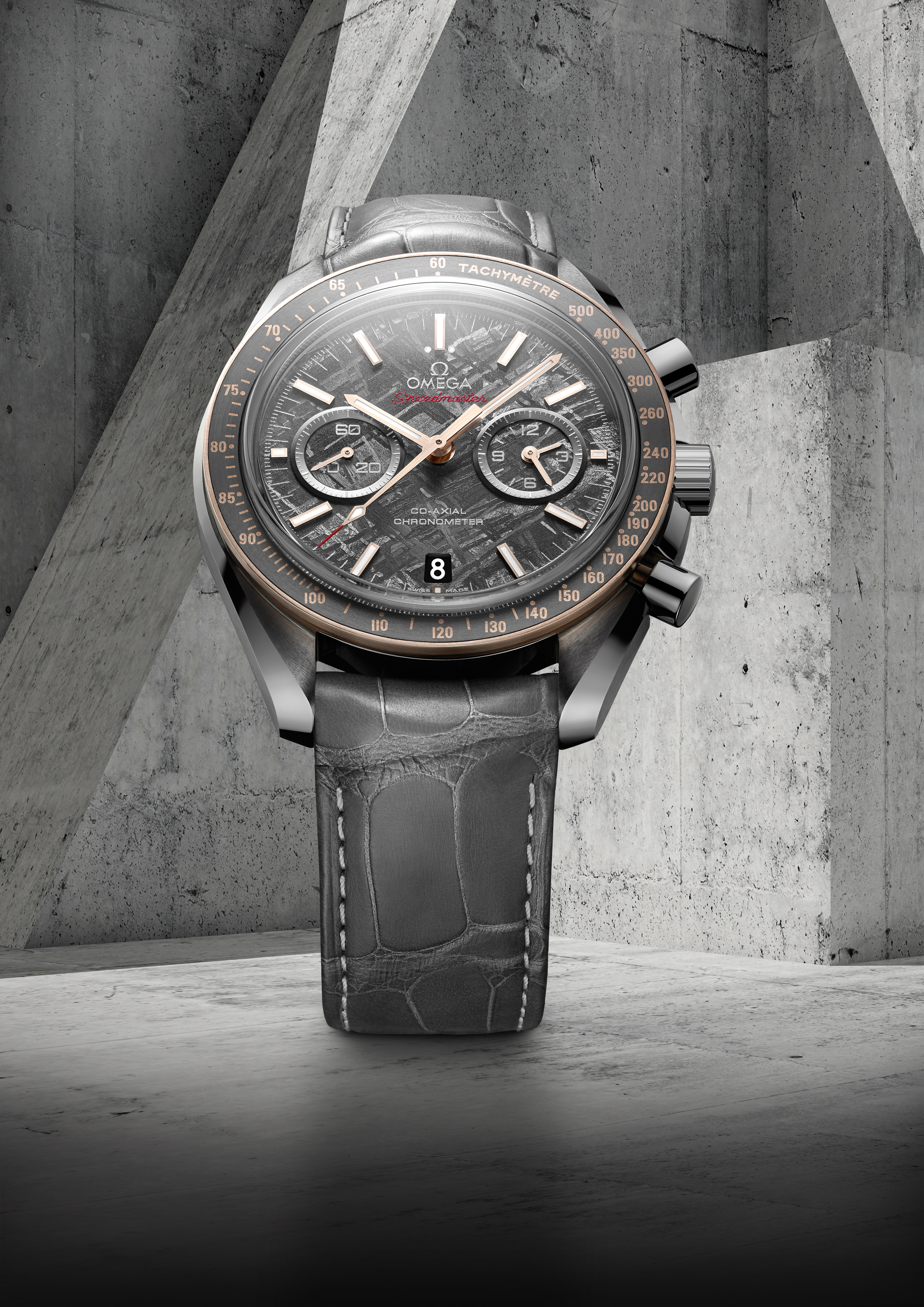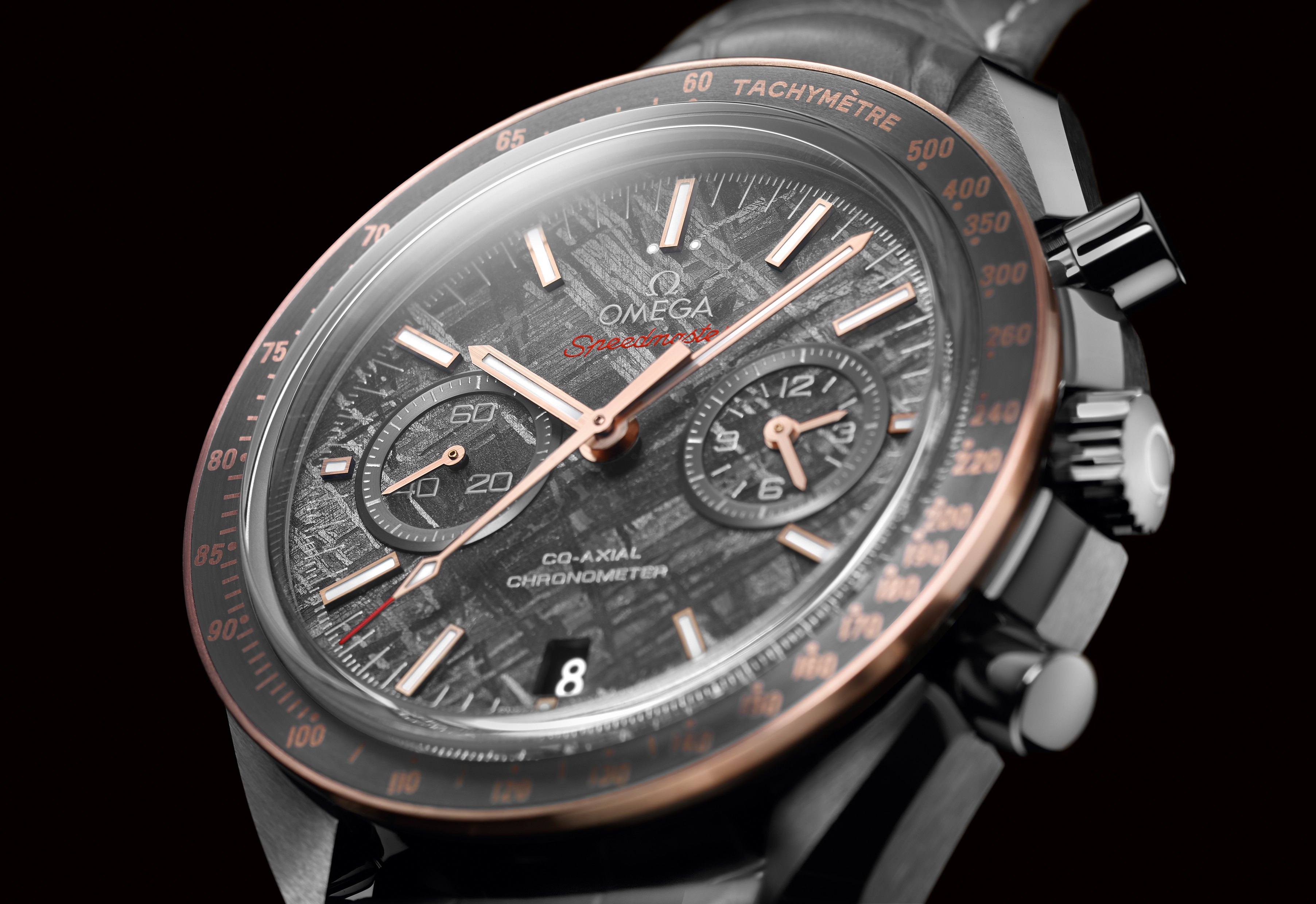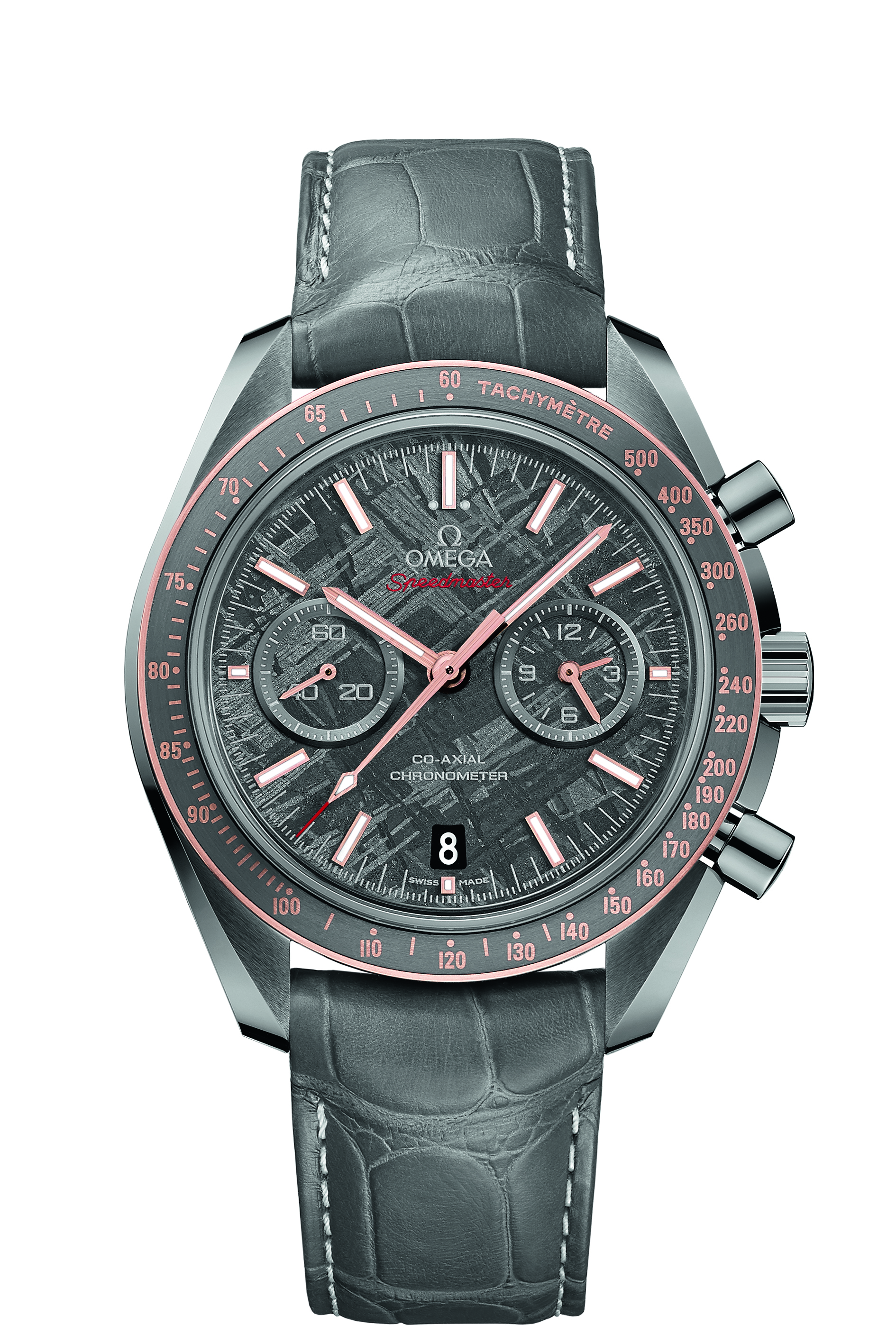 D’un diamètre de 44,25 mm, la Speedmaster Grey Side of the Moon « Meteorite » marque l’apparition de fonctionnalités inédites au sein de la collection Speedmaster. C’est la première fois qu’une échelle tachymétrique est créée en OMEGA Ceragold™.