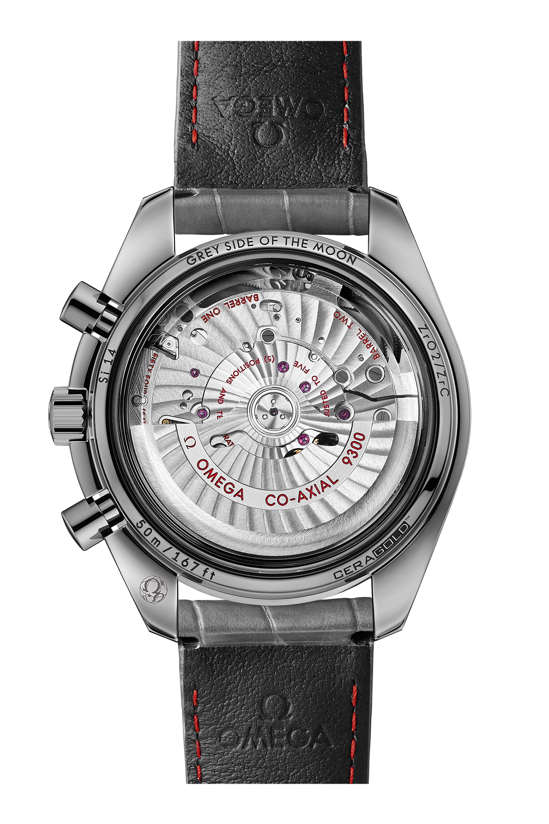 Nulle crainte à avoir pour les amateurs de la première Speedmaster Grey Side of the Moon : l’apparence du modèle originel a été respectée. Le même procédé révolutionnaire a été utilisé pour fabriquer le boîtier en céramique grise. On retrouve également le bracelet en cuir gris avec sa boucle déployante, et le fameux calibre OMEGA Co-Axial 9300.