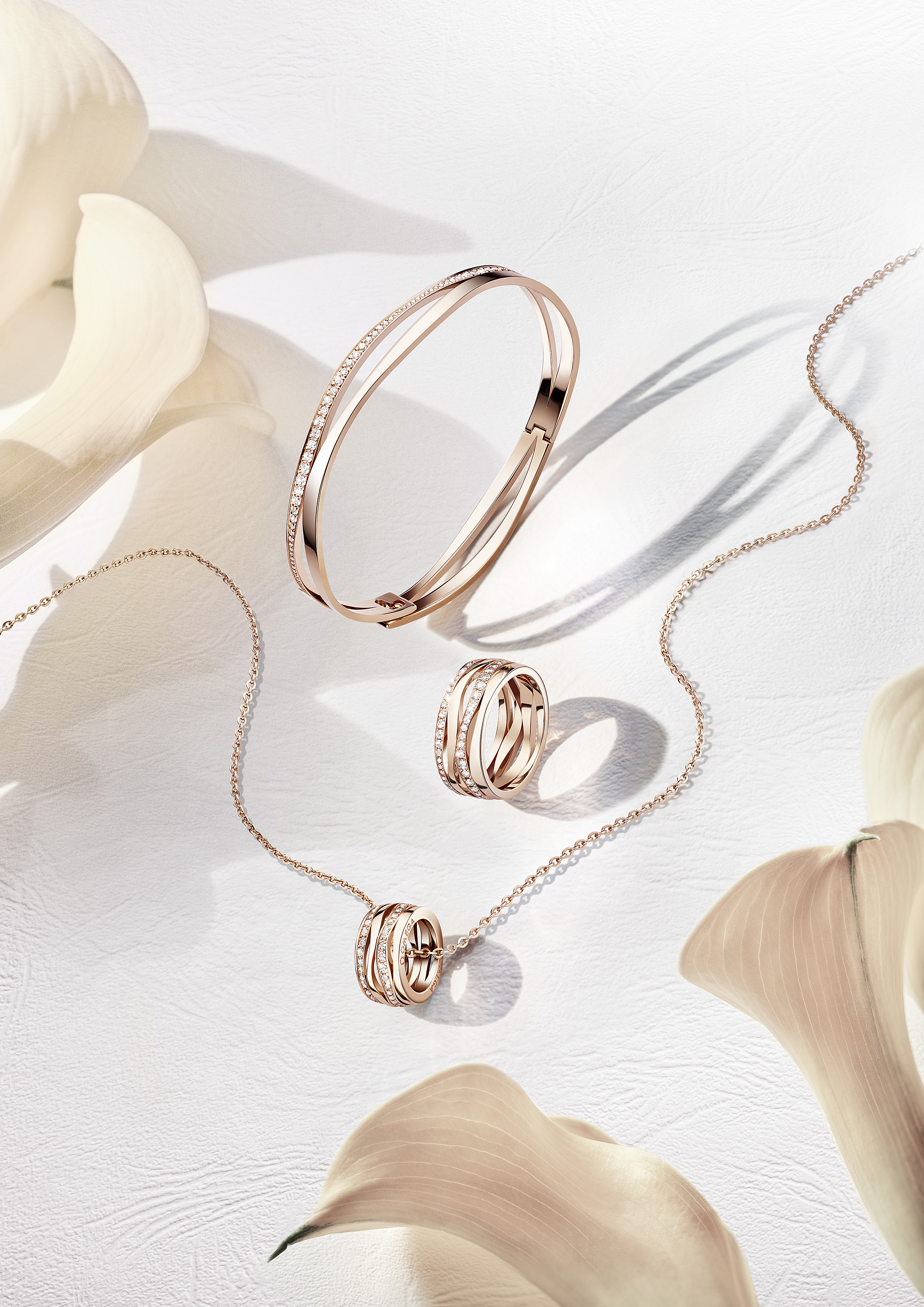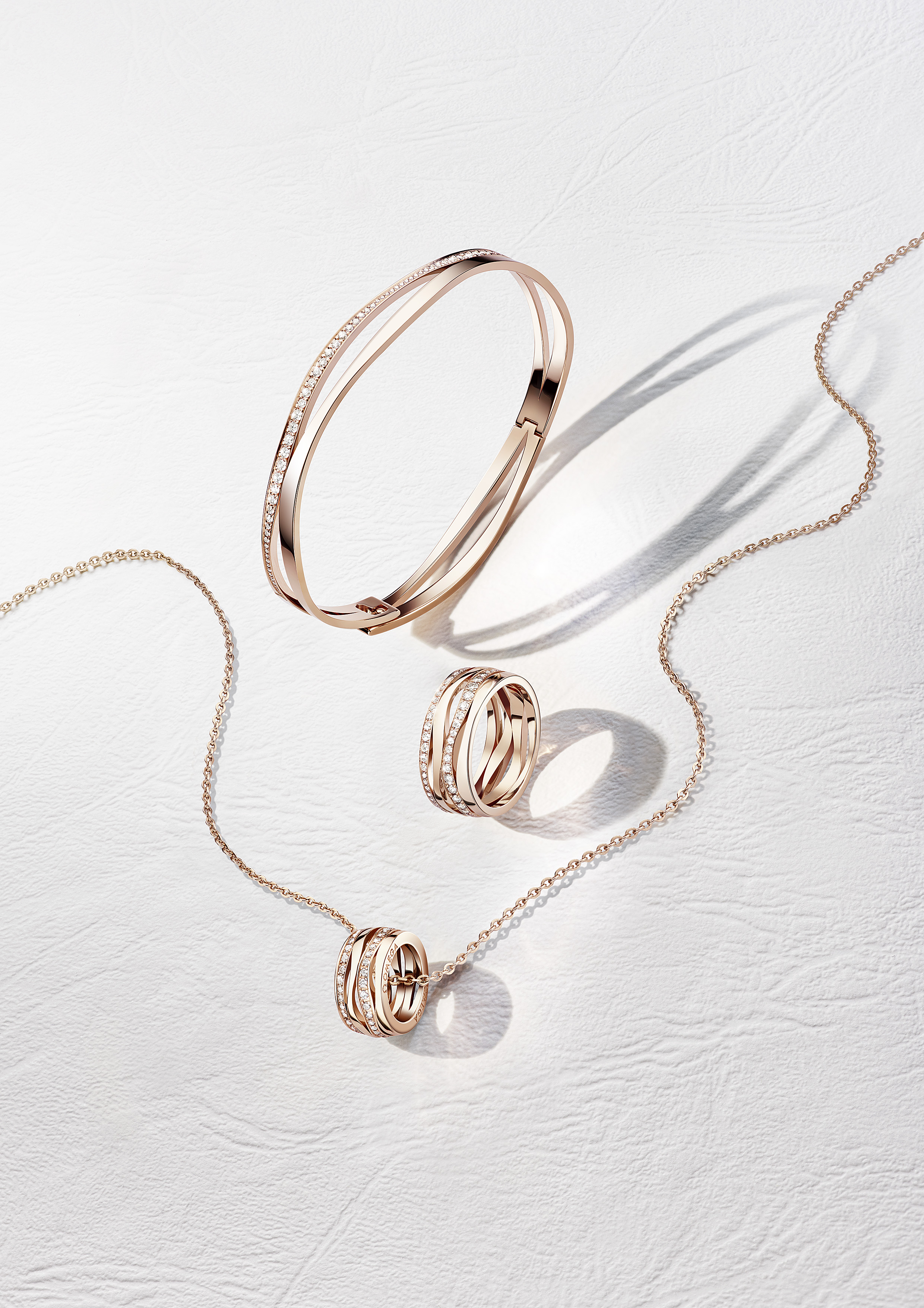 Présentées ici en or rouge, les pièces sont également disponibles en or jaune et blanc.