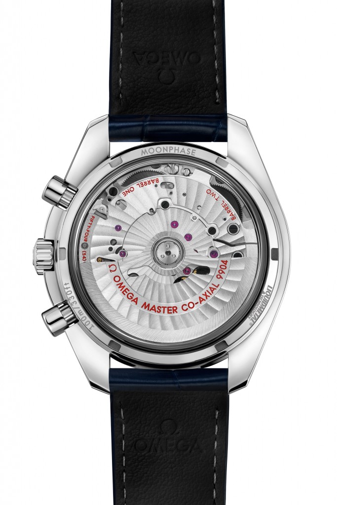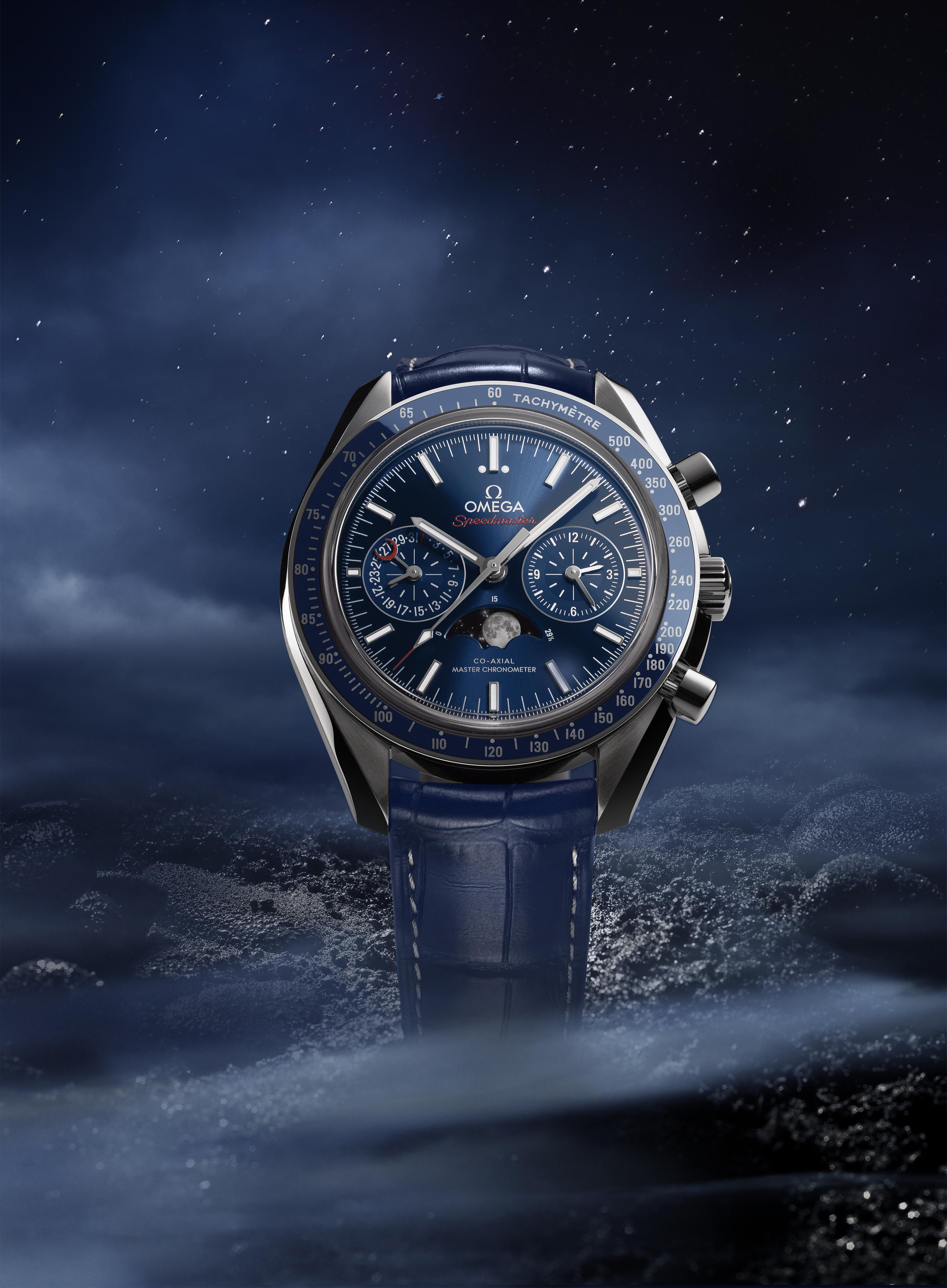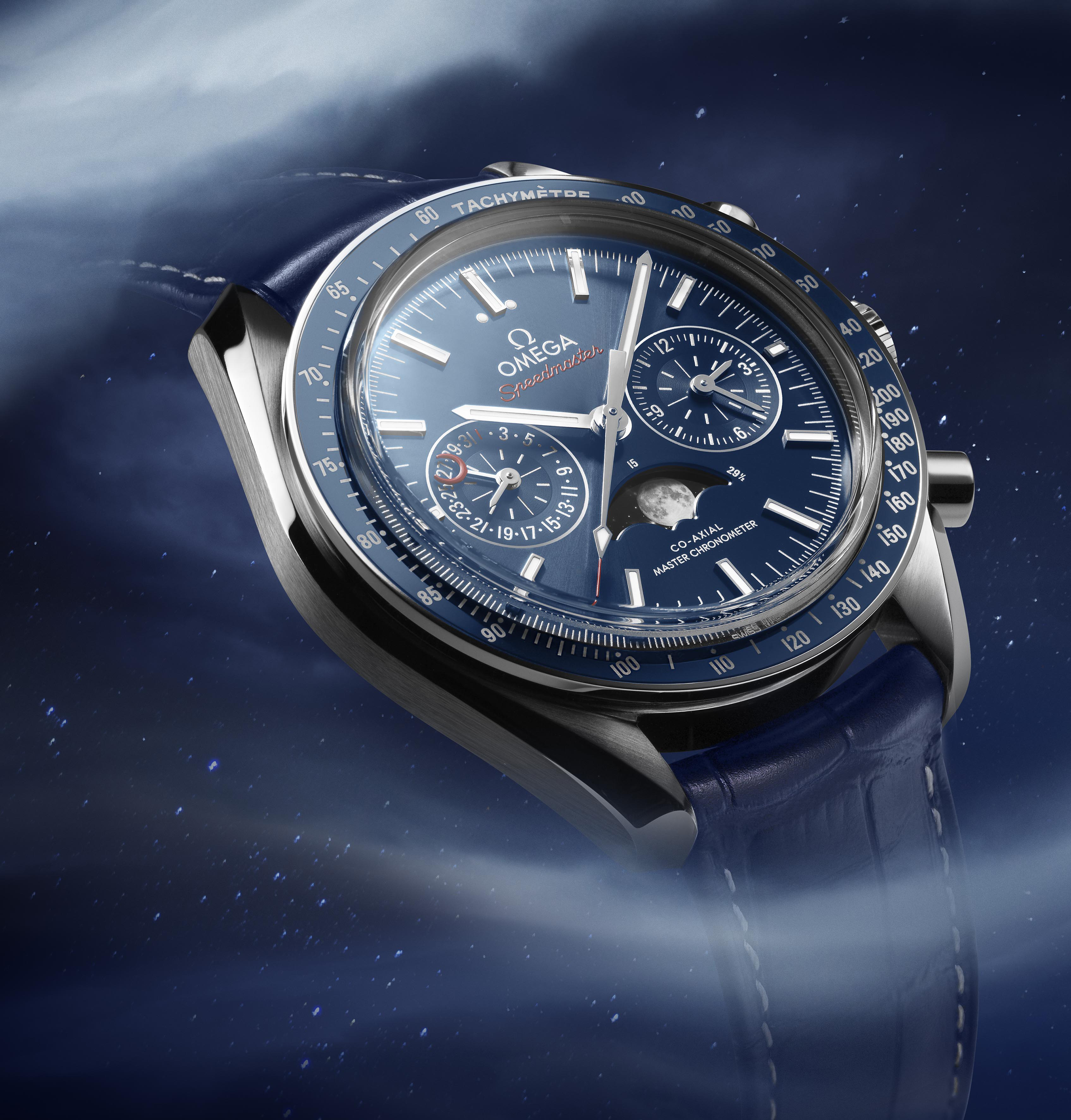 La Speedmaster Moonphase possède de nombreuses autres caractéristiques, notamment un éblouissant cadran soleillé bleu, une lunette en céramique et un boîtier en acier inoxydable. Autre innovation pour la collection Speedmaster : l’échelle tachymétrique a été réalisée en alliage Liquidmetal®. Les compteurs se distinguent également par leur texture composée de cercles rhodiés.