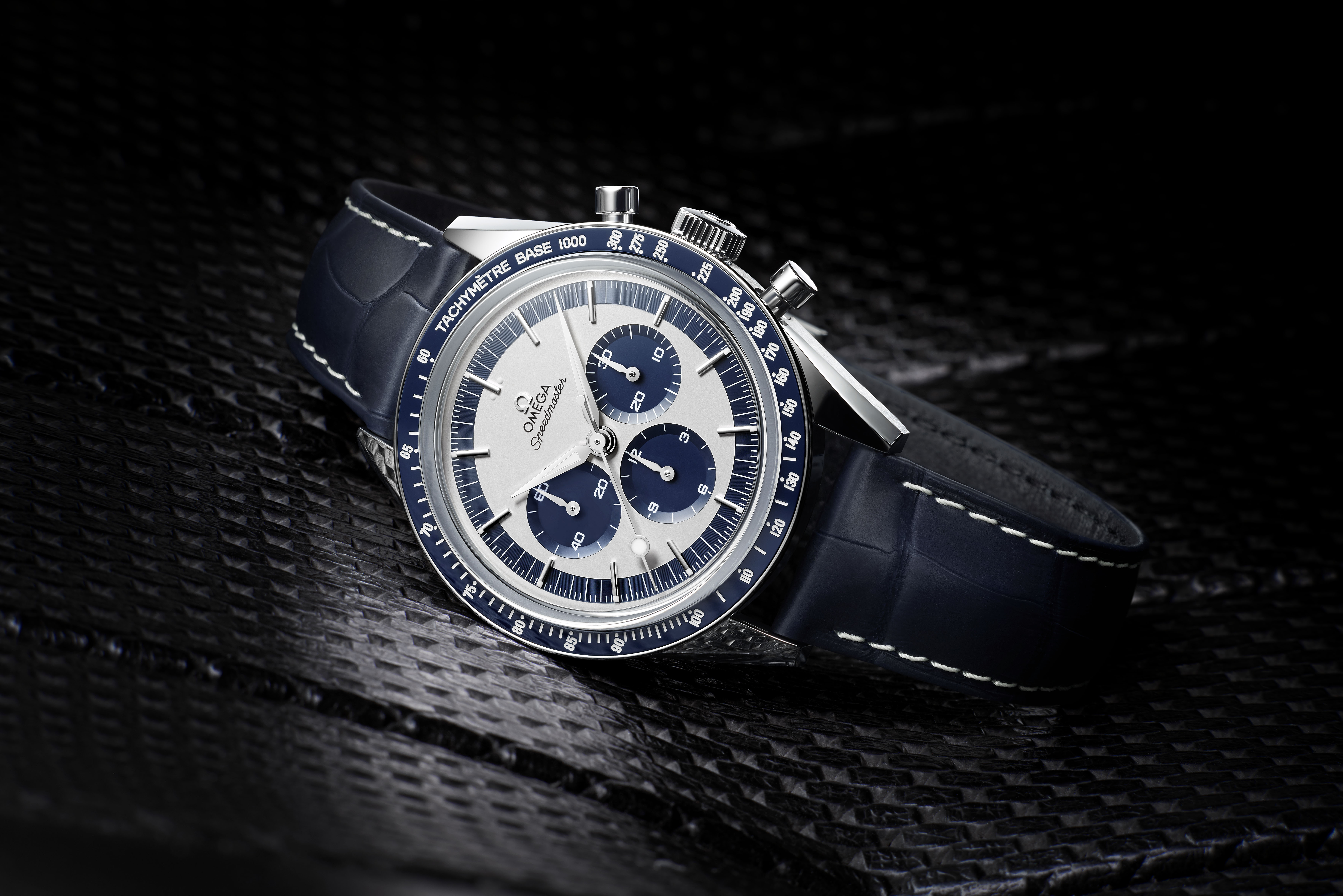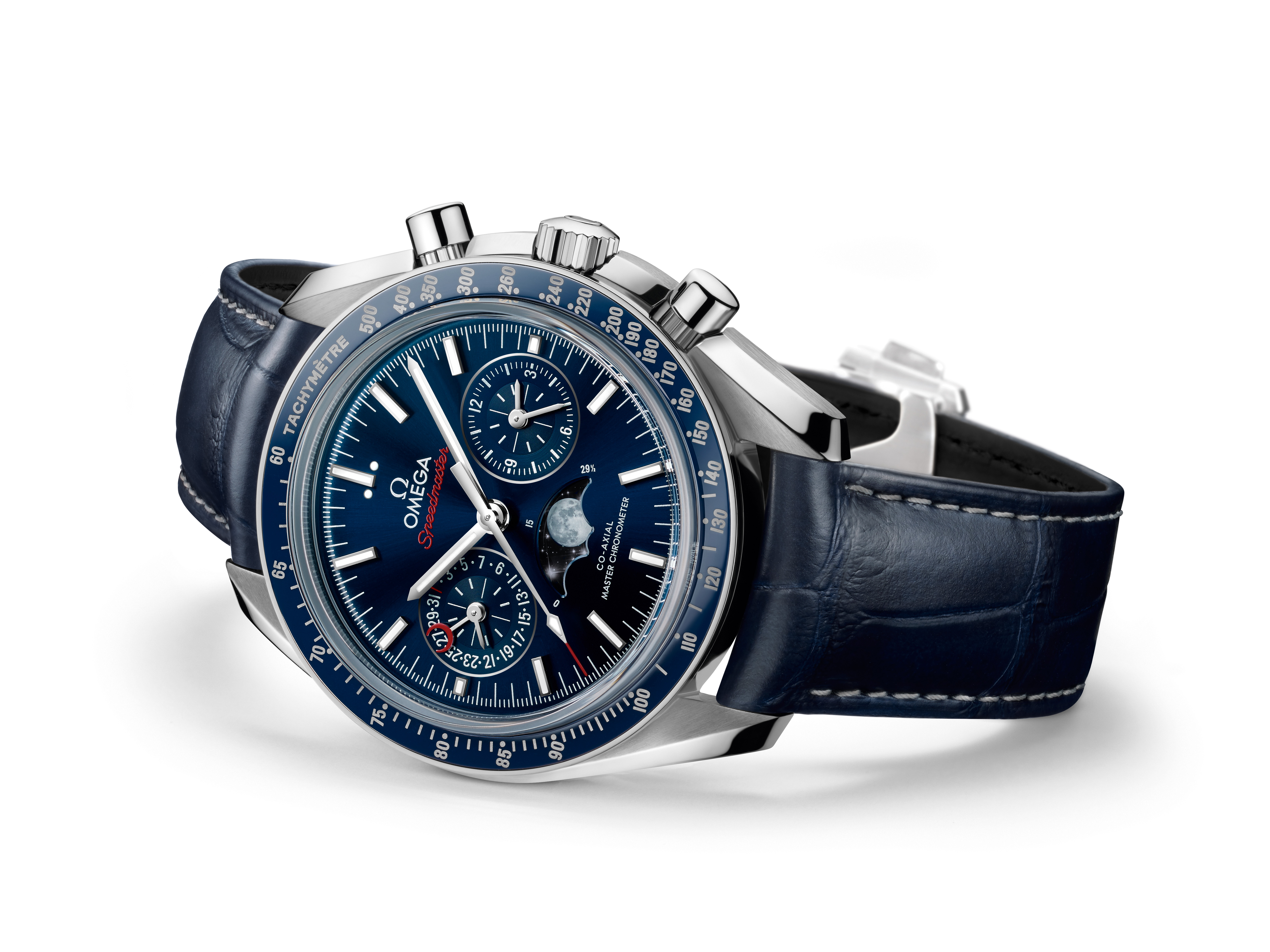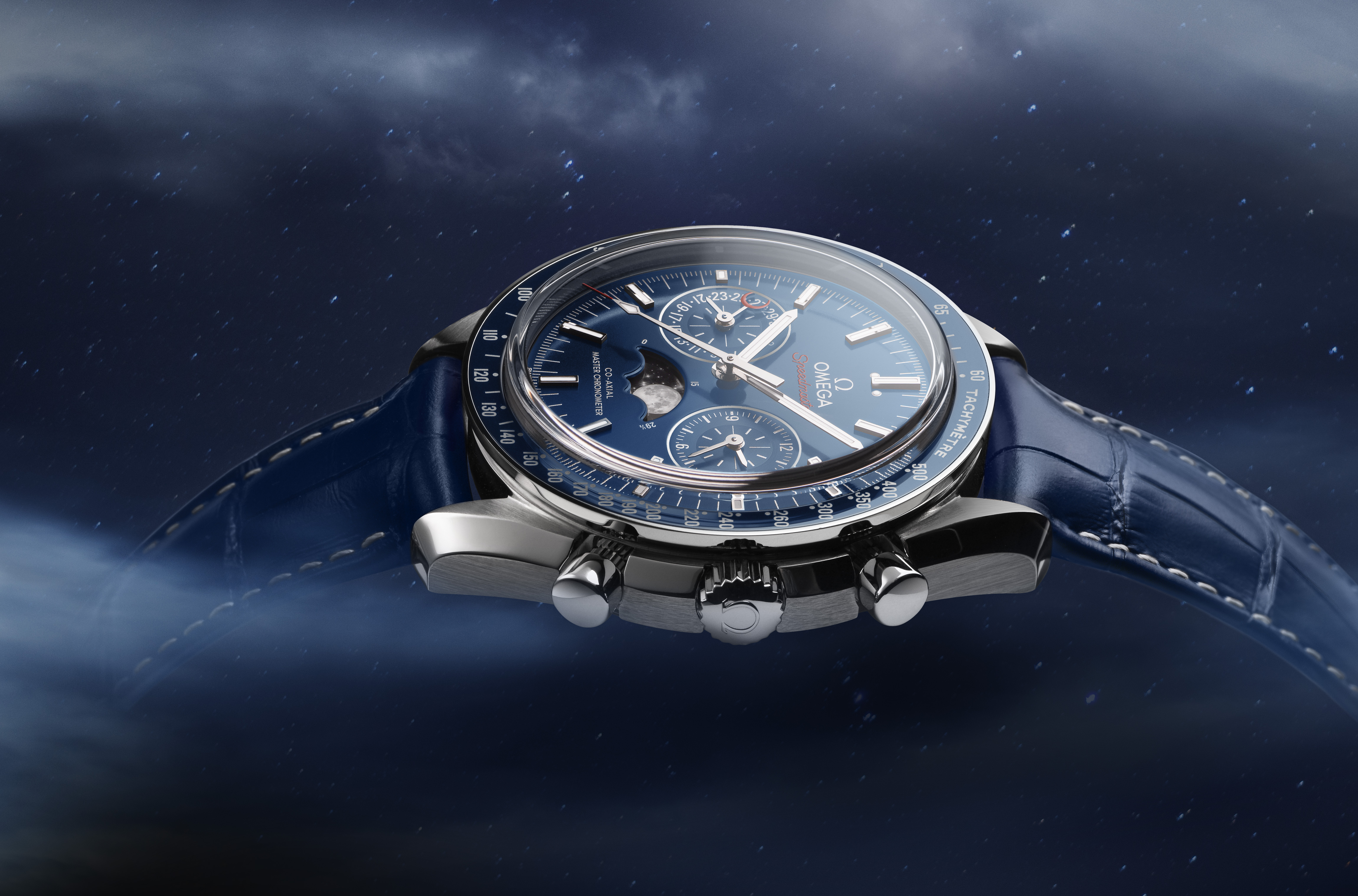 La Speedmaster Moonphase possède de nombreuses autres caractéristiques, notamment un éblouissant cadran soleillé bleu, une lunette en céramique et un boîtier en acier inoxydable. Autre innovation pour la collection Speedmaster : l’échelle tachymétrique a été réalisée en alliage Liquidmetal®. Les compteurs se distinguent également par leur texture composée de cercles rhodiés.