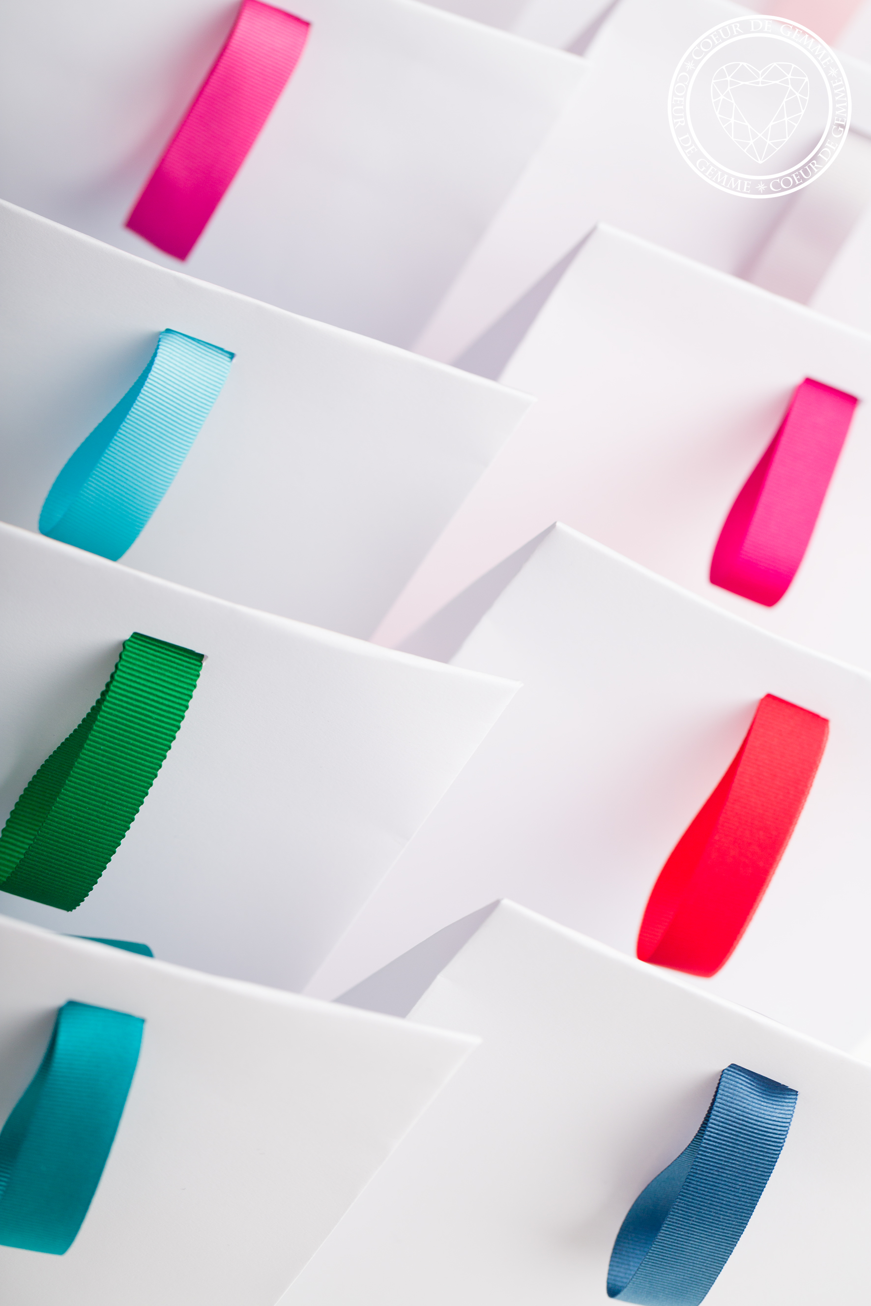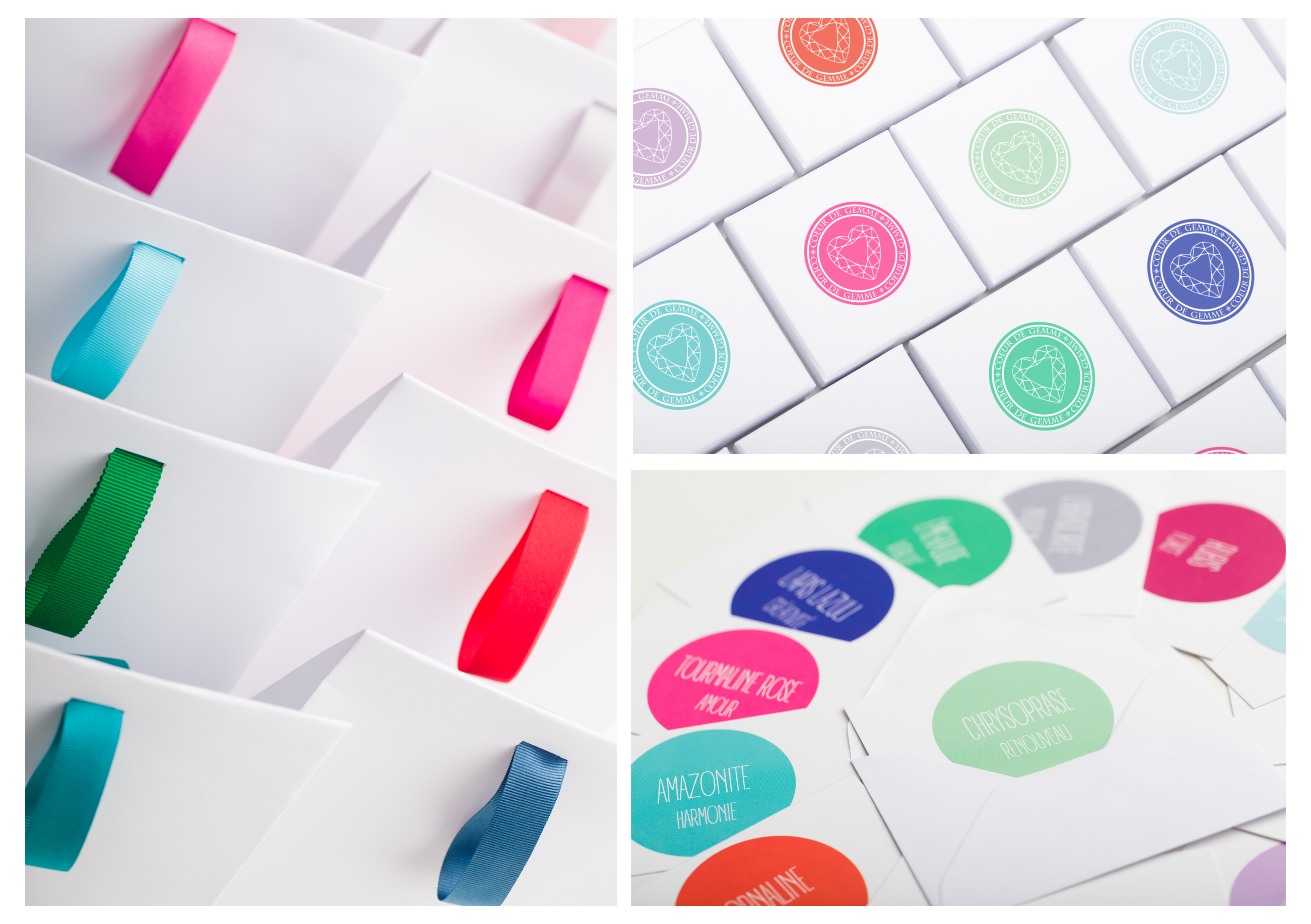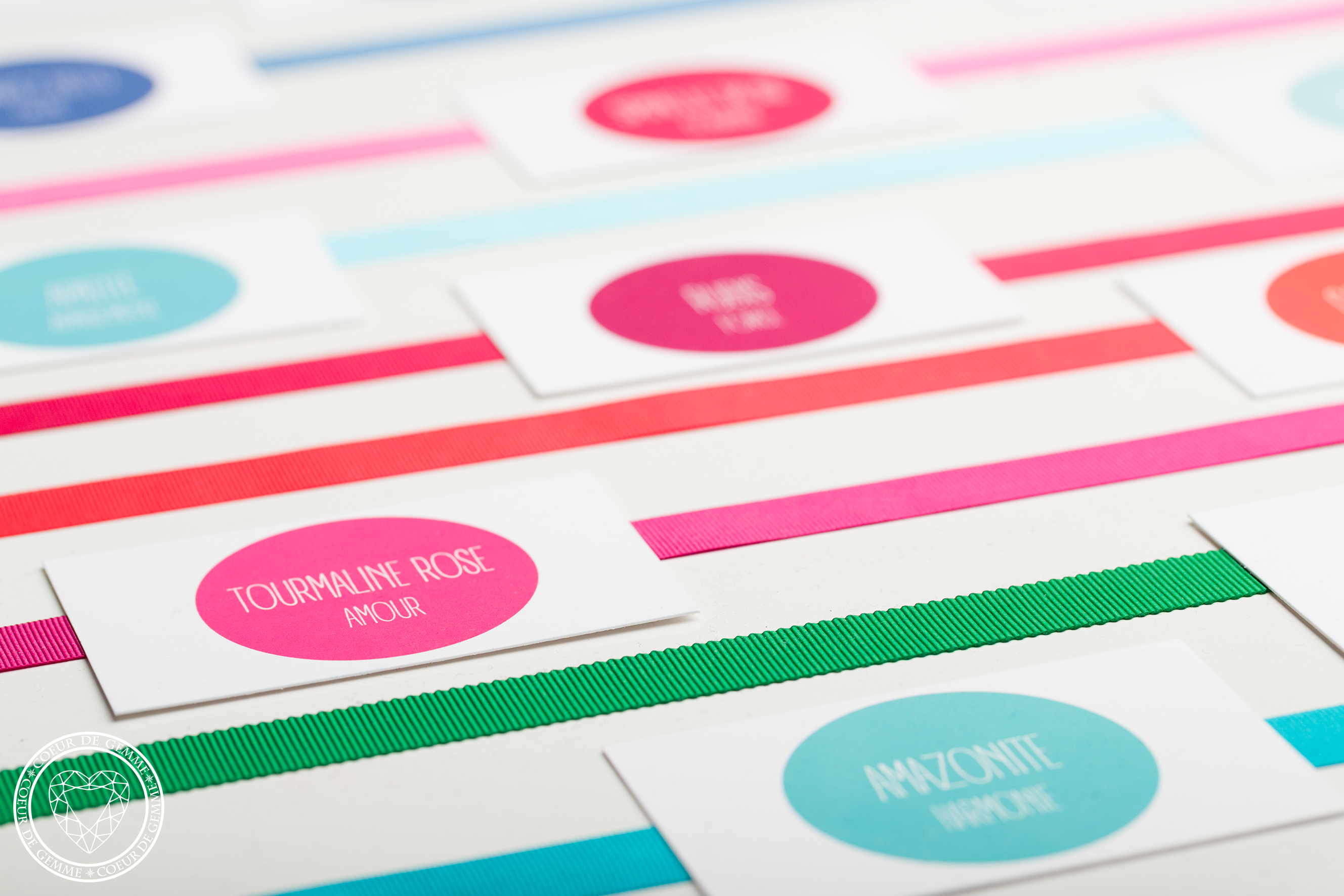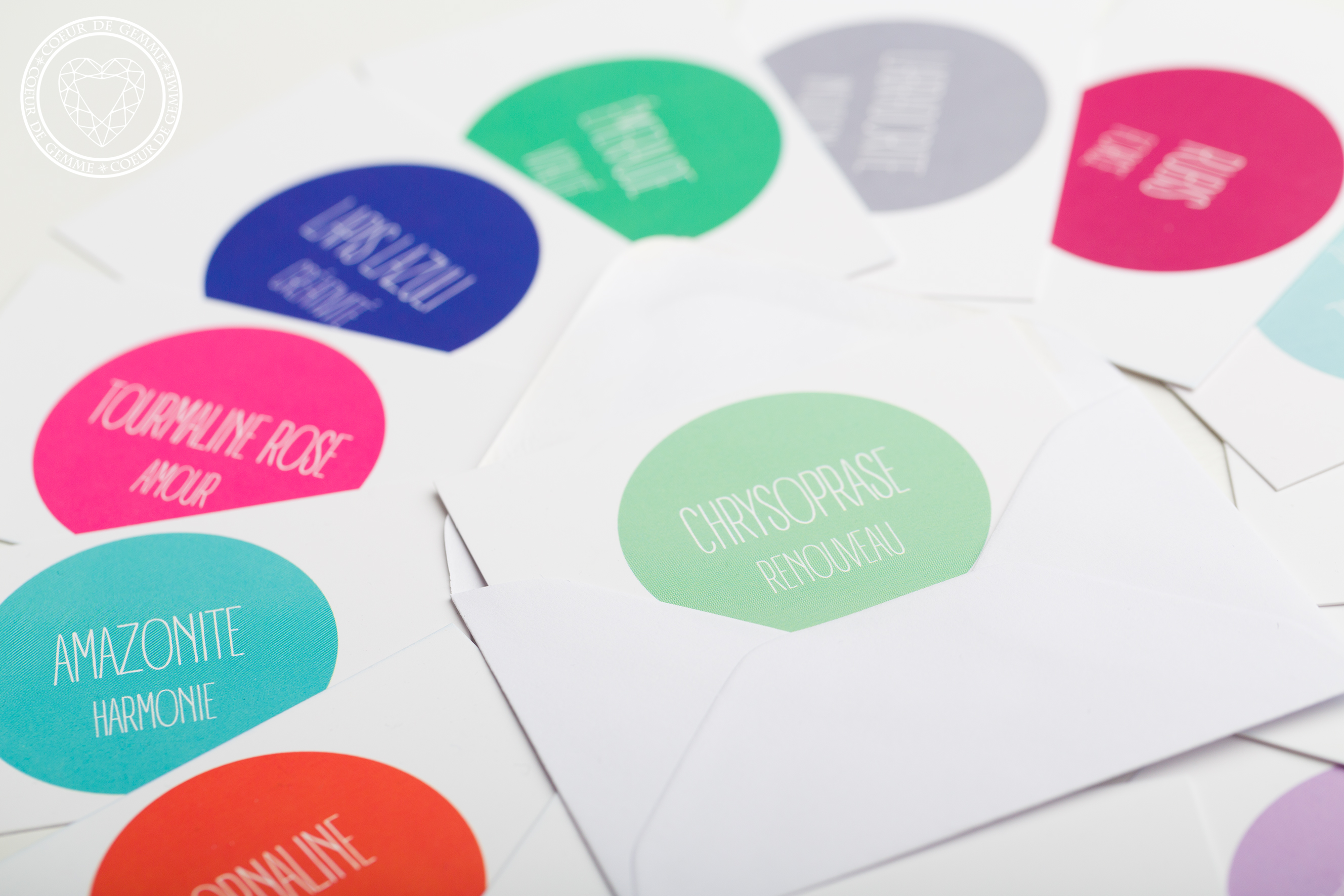 Dans les écrins aux couleurs des gemmes : une petite enveloppe qui contient les cartes des symboliques, avec un verso blanc pour écrire des petits mots et une pochette cadeau au ruban assorti…
