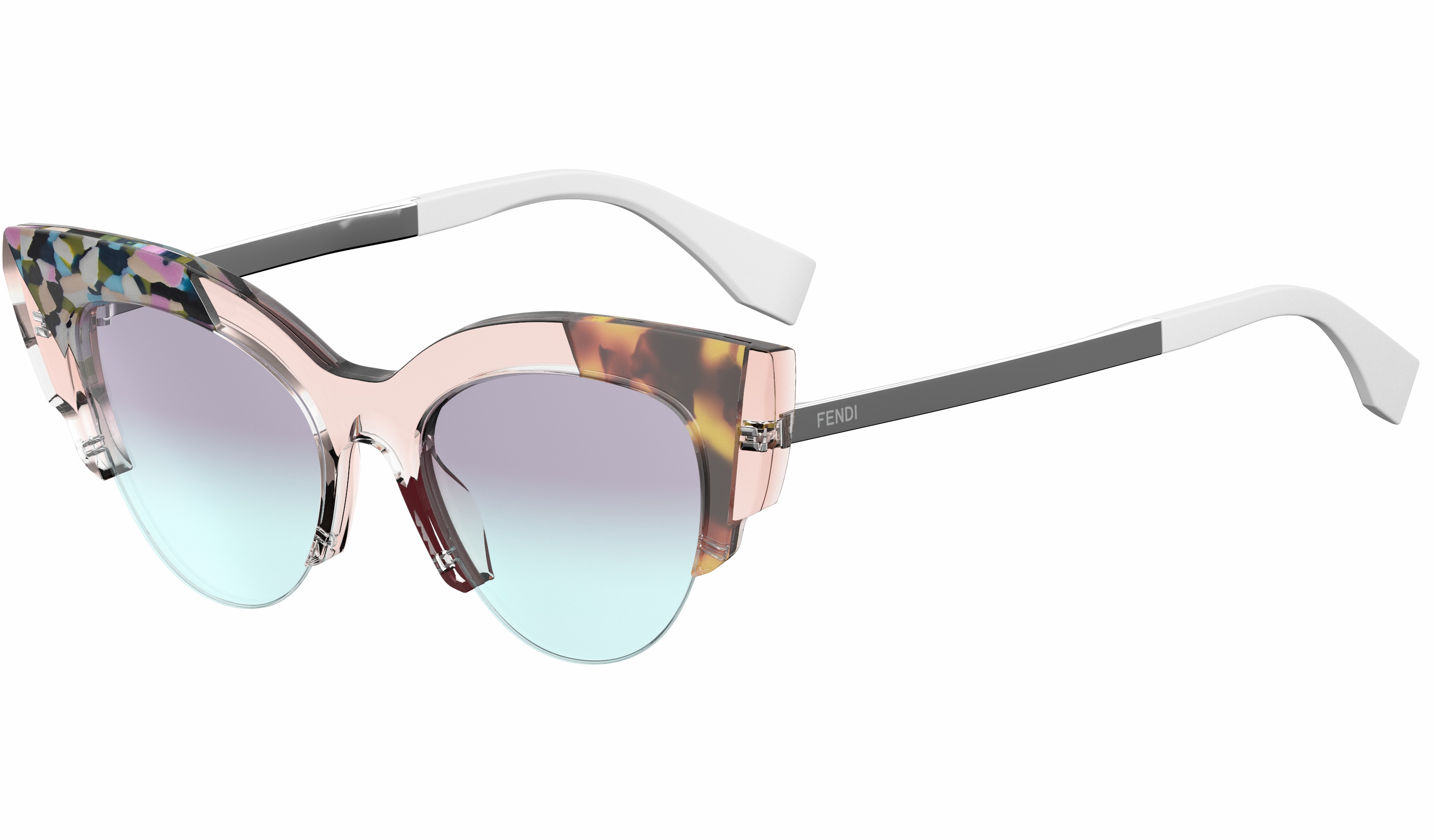 Verres colorés, monture pastel, mélange de tons et forme seventies, les lunettes Fendi cumulent toutes les tendances du printemps.